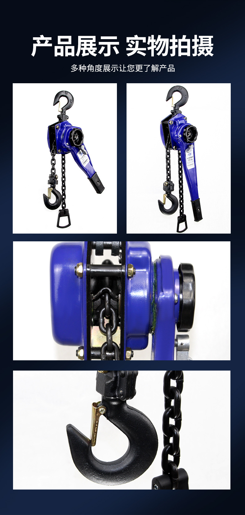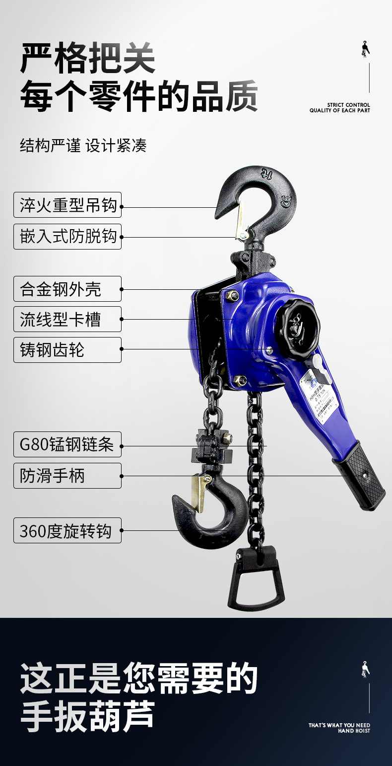 | Modelo | [0.75 toneladas × 1.5 metros] 7 kg, [0.75 toneladas × 3 metros] 8 kg, [0.75 toneladas × 6 metros] 10 kg, [1 toneladas × 1.5 metros] 7 kg, [1 toneladas × 3 metros] 8 kg, [1 toneladas × 6 metros] 10 kg, [1.5 toneladas × 1.5 metros] 12 kg, [1.5 toneladas × 3 metros] 14 kg, [1.5 toneladas × 6 metros] 18 kg, [2 toneladas × 1.5 metros] 12 kg, [2 toneladas × 3 metros] 14 kg,[2 toneladas × 6 metros] 18 kg, [3 toneladas × 1,5 metros] 18 kg, [3 toneladas × 3 metros] 22 kg, [3 toneladas × 6 metros] 29 kg, [6 toneladas × 1,5 metros] 28 kg, [6 toneladas × 3 metros] 34 kg, [6 toneladas × 6 metros] 48 kg, [9 toneladas × 1,5 metros] 50 kg, [9 toneladas × 3 metros] 65 kg, [9 toneladas × 6 metros] 92 kg, ultra pequeño [0.25 toneladas × 3 metros] 2.4 kg, Extra pequeño [0.5 t × 3 m] 2,9 kg, accesorios de cabeza de 0,75 ton (sin cadena) |