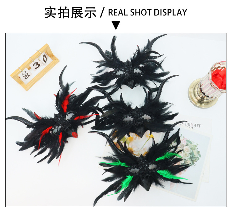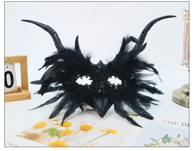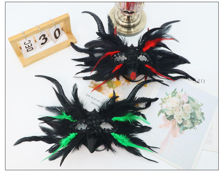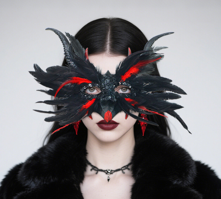 Máscara de media cara con lentejuelas y plumas de pavo para Halloween, estilo gótico, de alta gama, estilo Instagram, popular entre influencers.