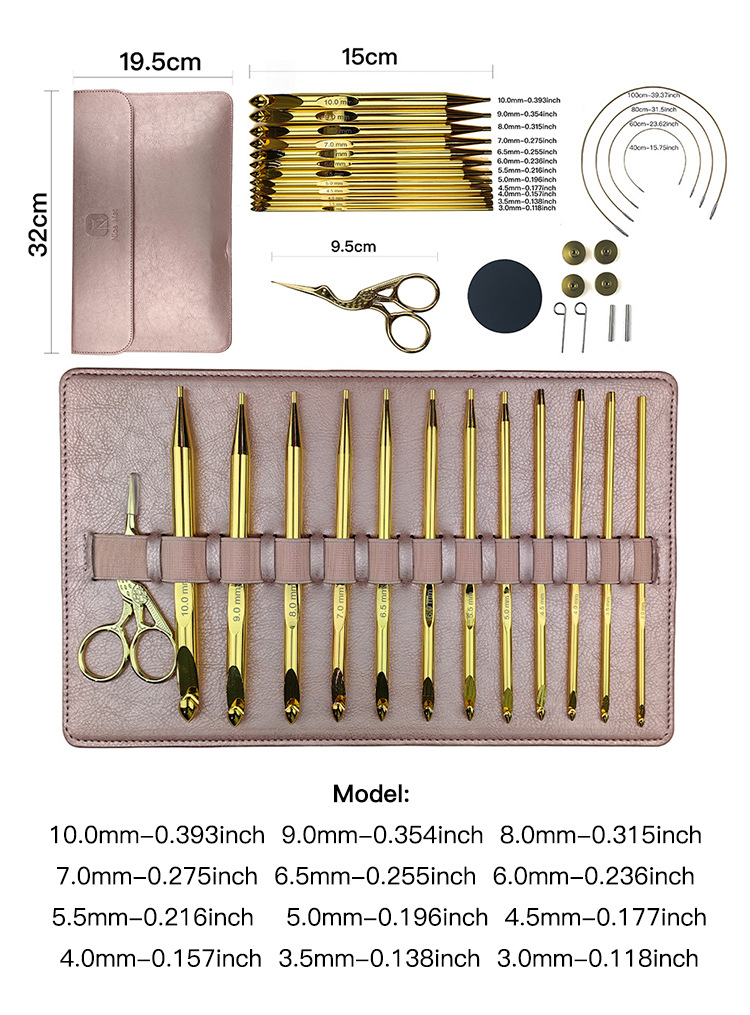 Agujas de suéter transfronterizas cromadas ganchillo afgano alfombra desmontable ganchillo oro tunecino ganchillo 12 conjuntos