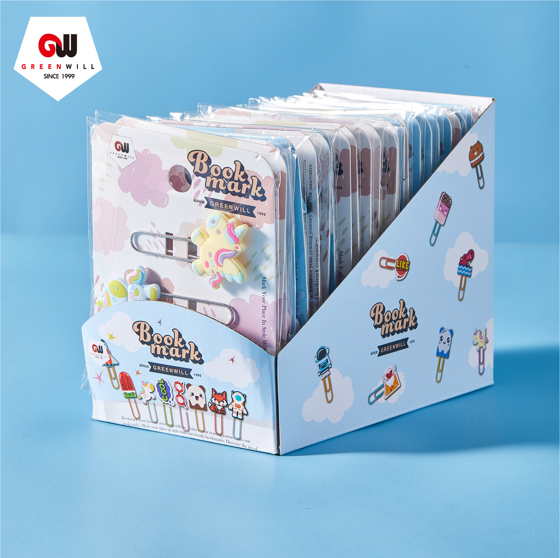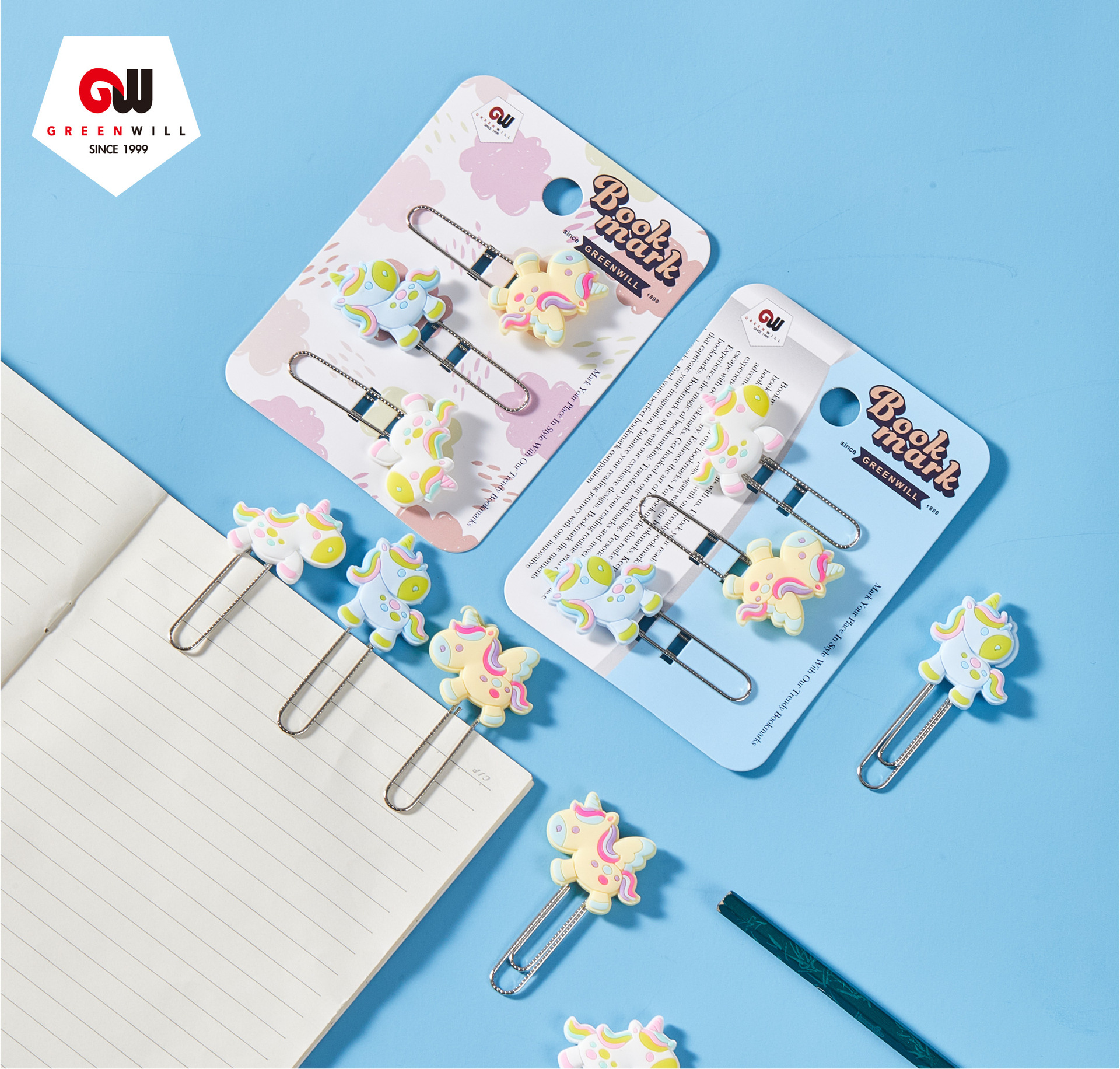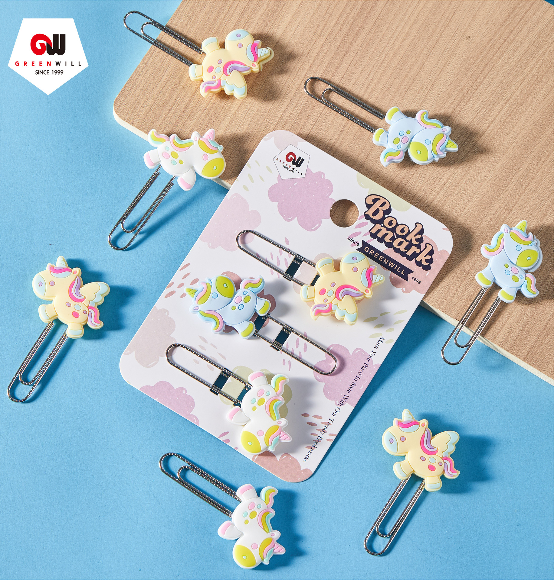 Unicornio de dibujos animados clips marcadores de libros de estudiantes carpeta de páginas adorable suministros de oficina pequeños regalos escolares pegamento suave