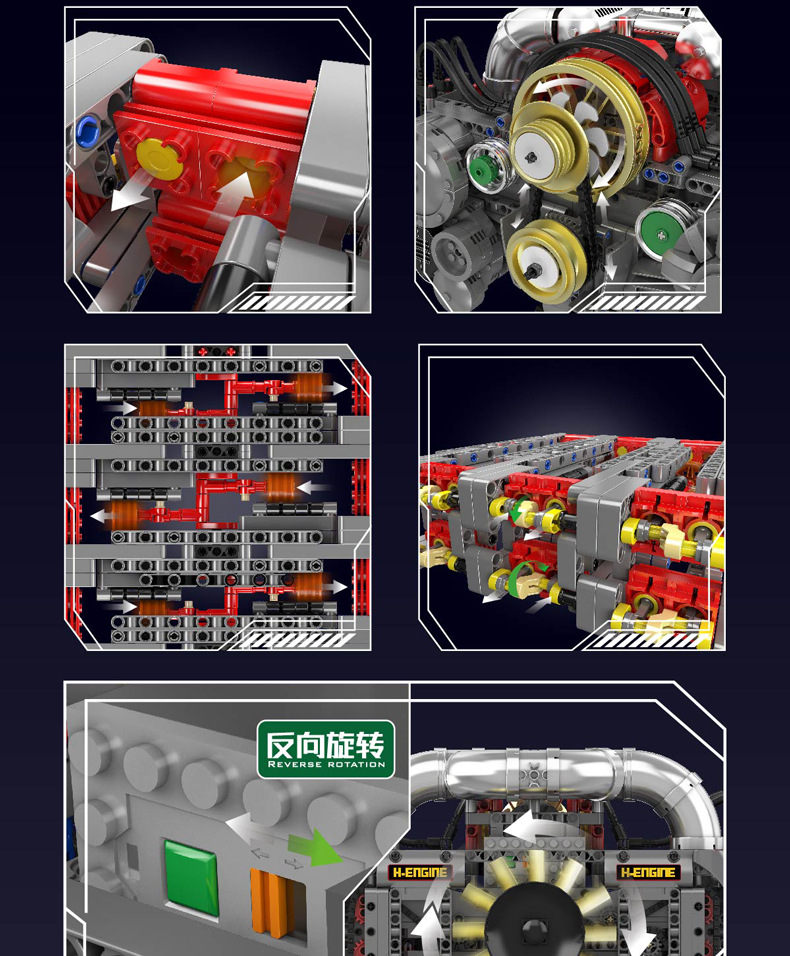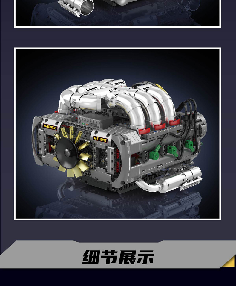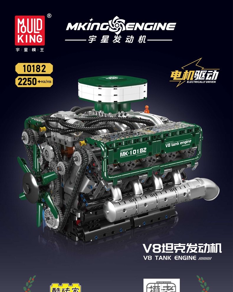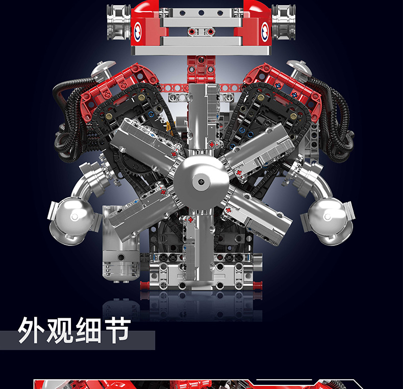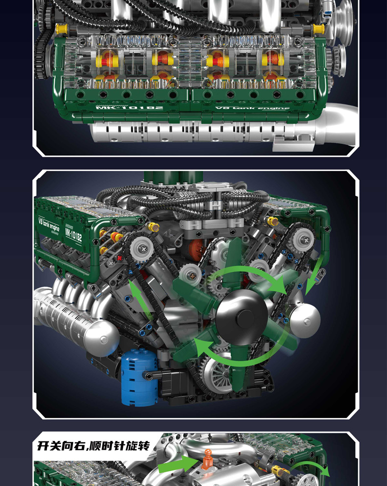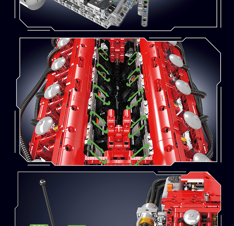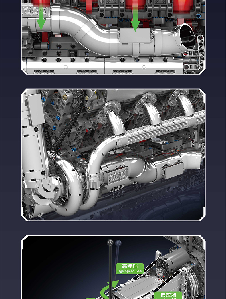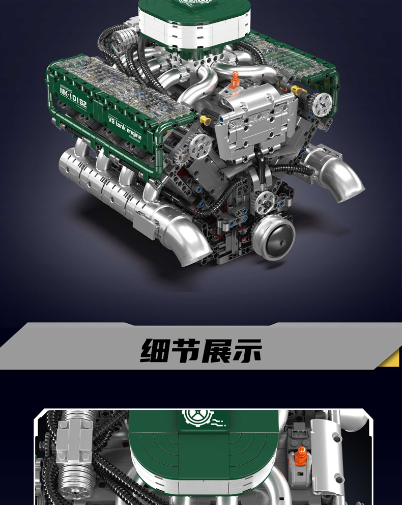 | Color | 10168 motor V8 de doble turbina, 10169 motor Limbaugh V12, 10181 motor de contraposición horizontal, 10182 motor de tanque V8 |