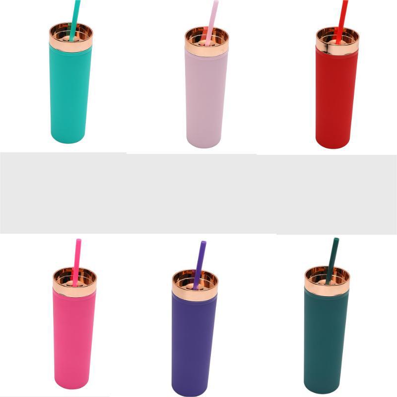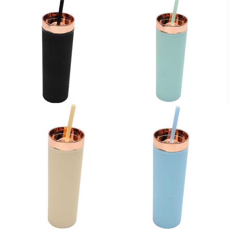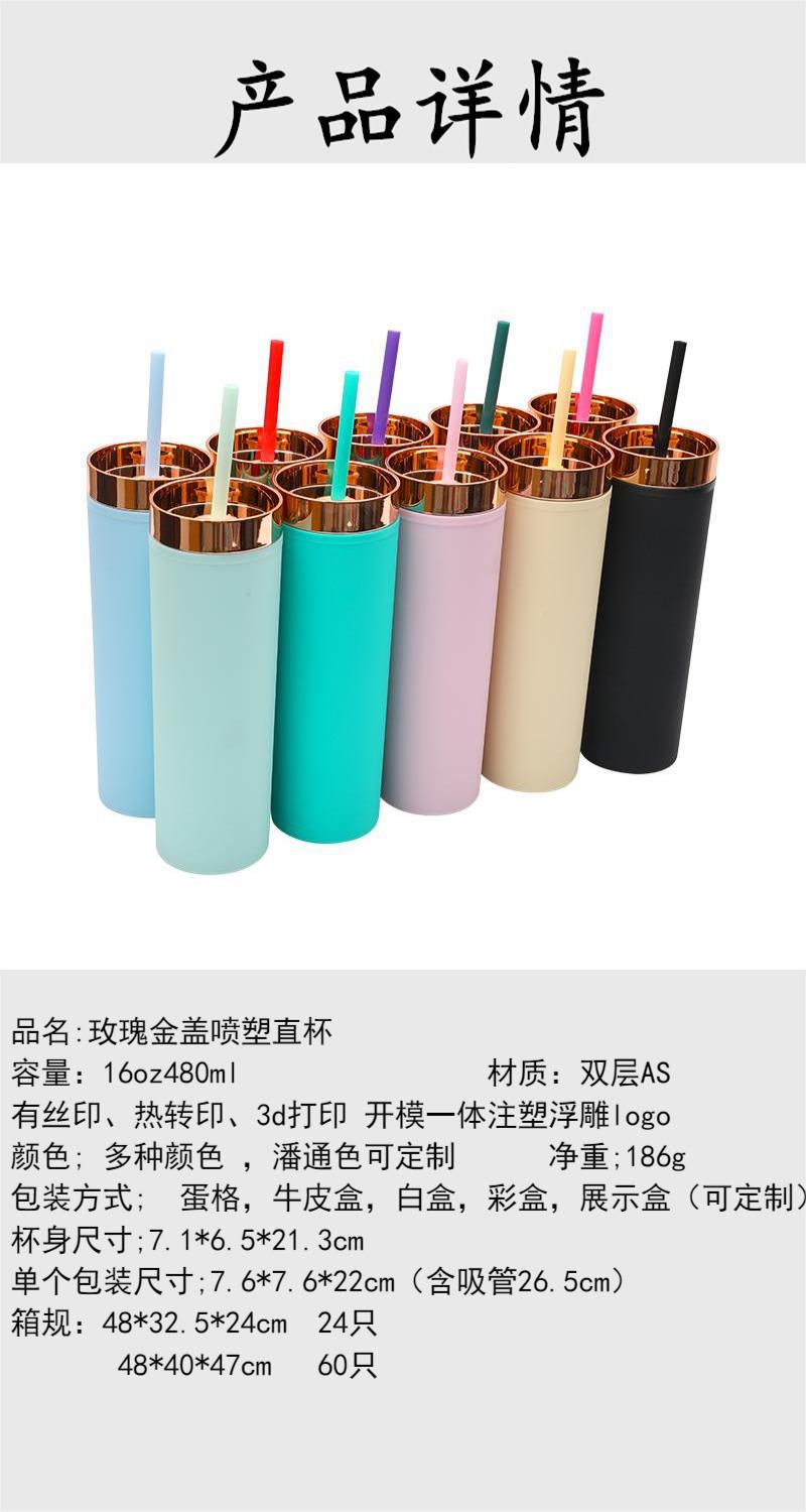 Transfronterizo Amazon Spot 16OZ Taza de paja recta Taza de plástico de doble capa con tapa de oro rosa Taza de agua de pintura de goma esmerilada