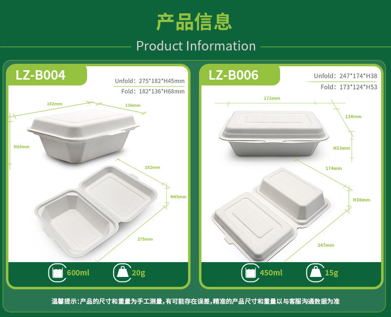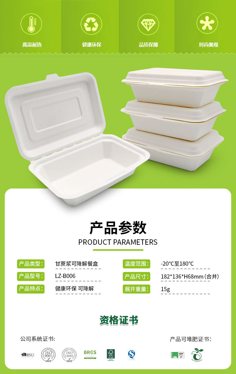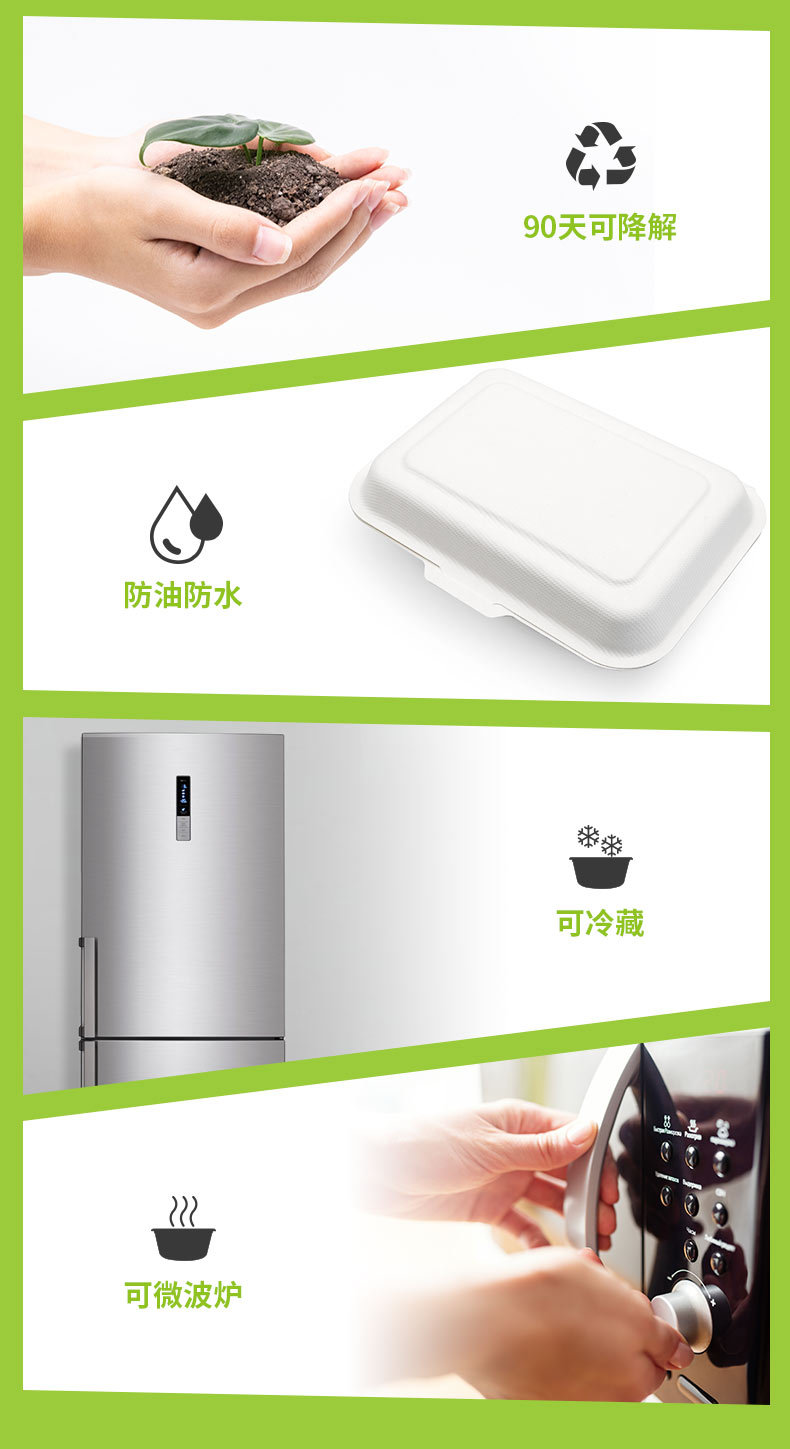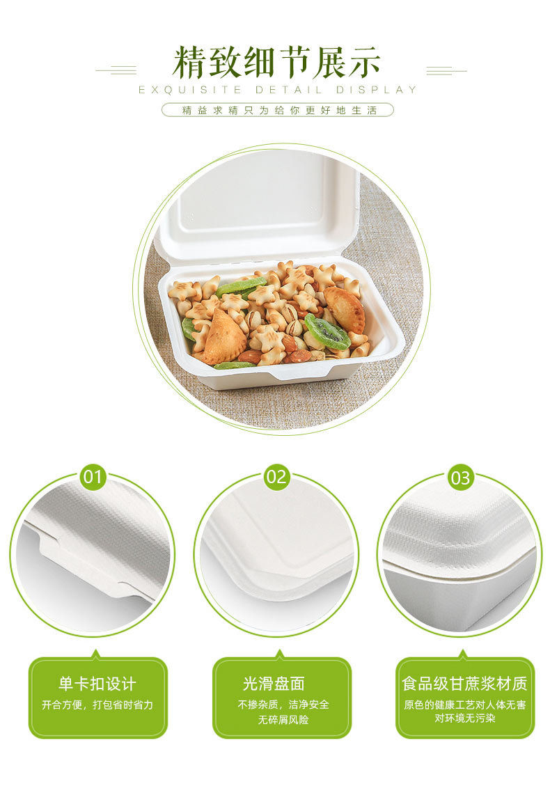 Verde Pulpa de caña de azúcar Pulpa de bambú desechable protección del medio ambiente Vajilla no rejilla 600ml caja de bloqueo degradable compostable