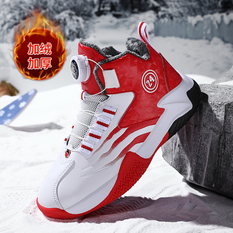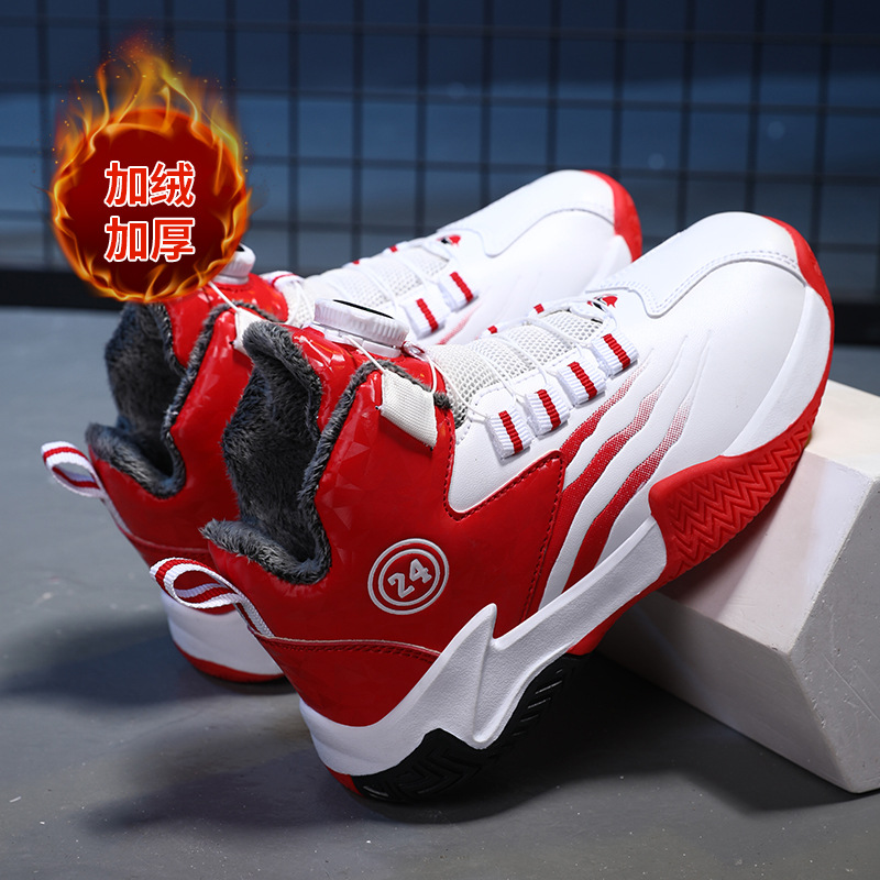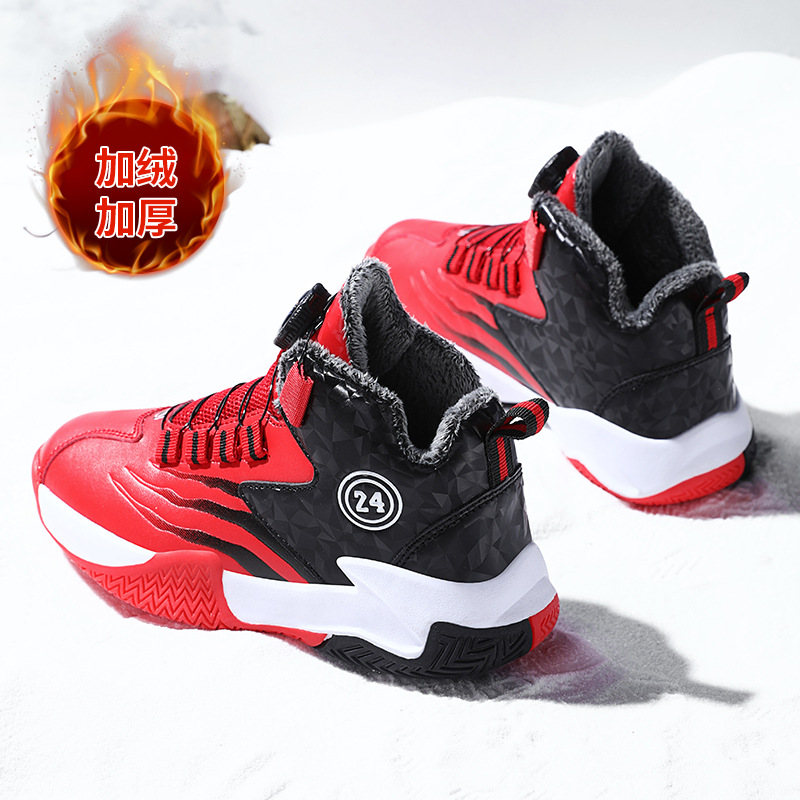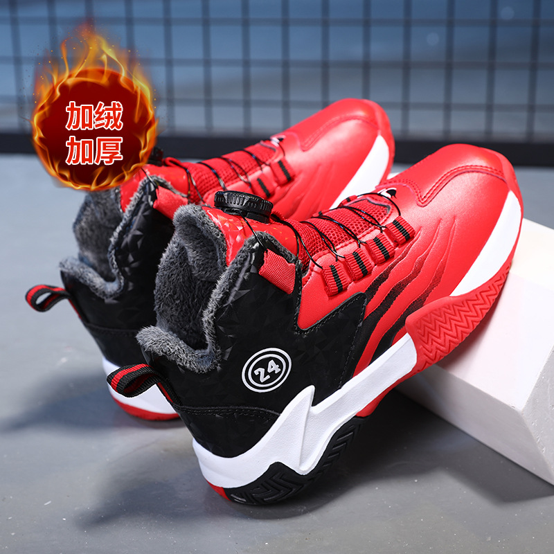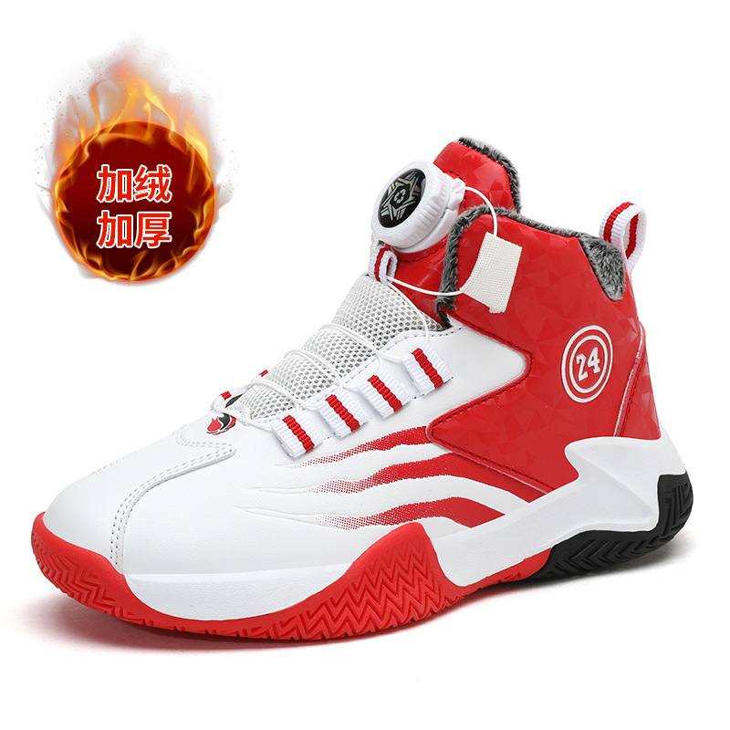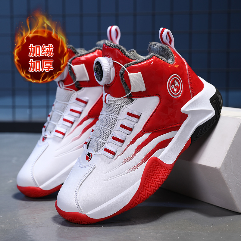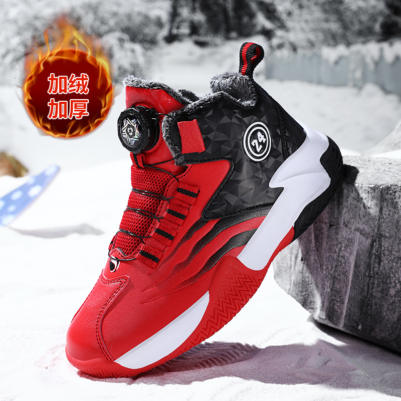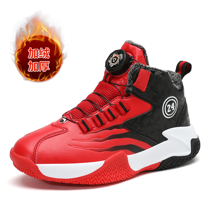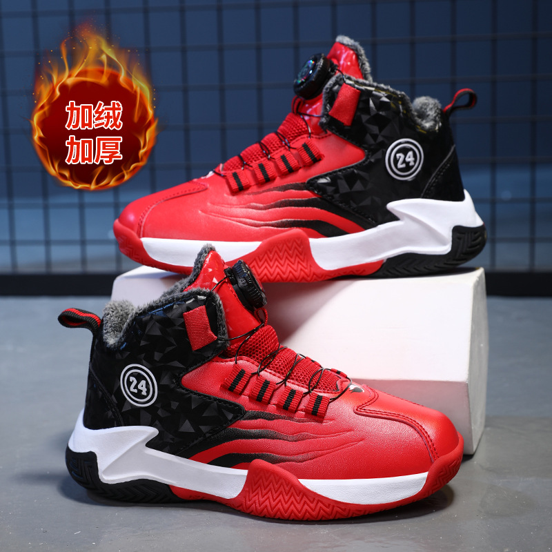 Zapatos de baloncesto para niños otoño y invierno nuevos niños rojos cuero botón giratorio para niños grandes y zapatos deportivos de algodón
