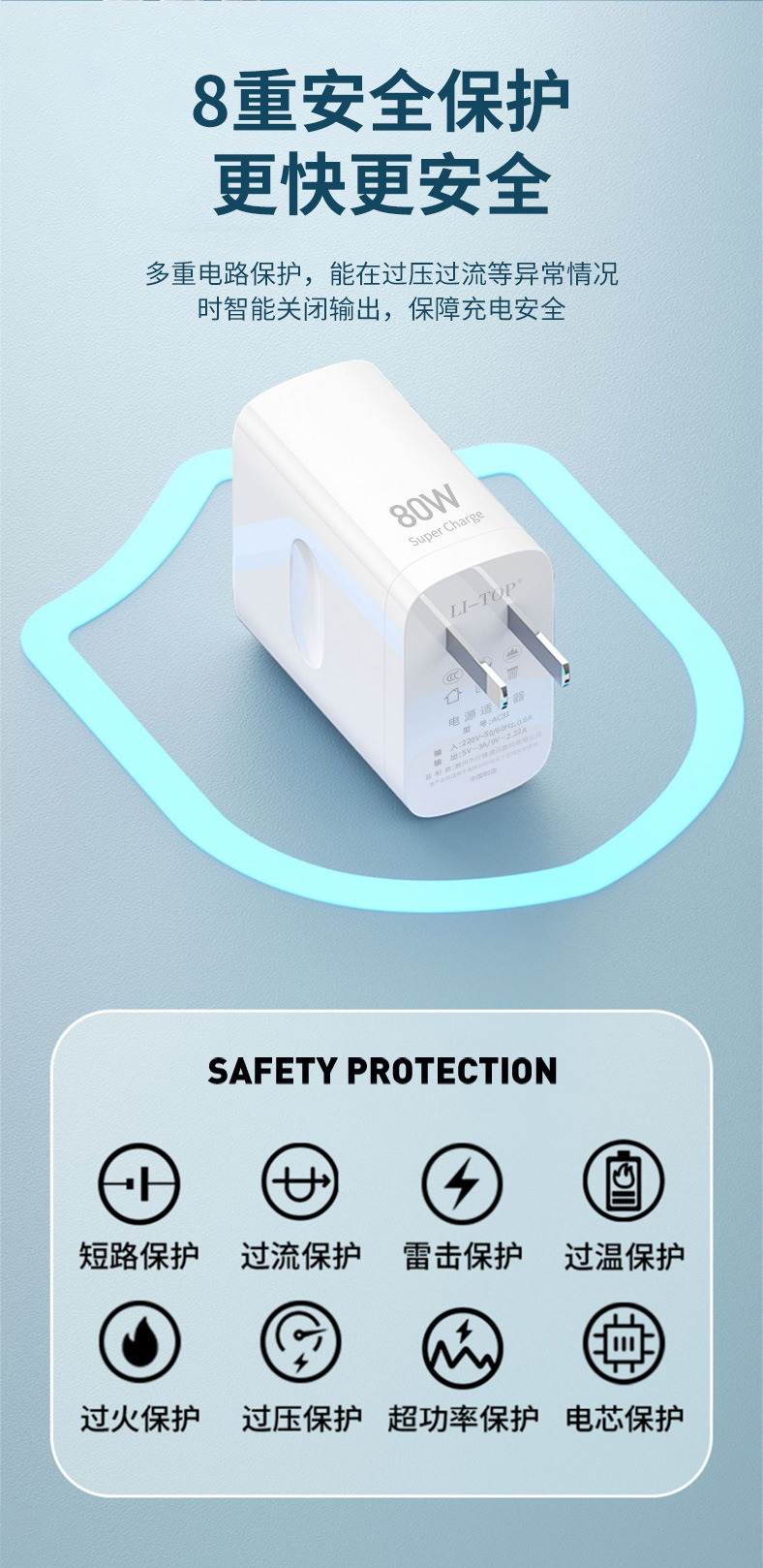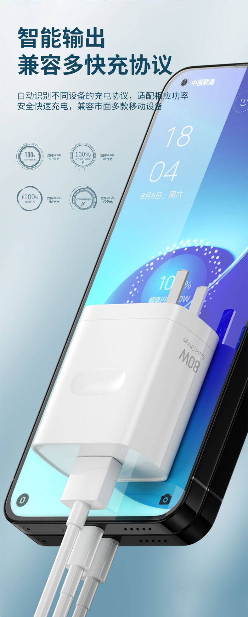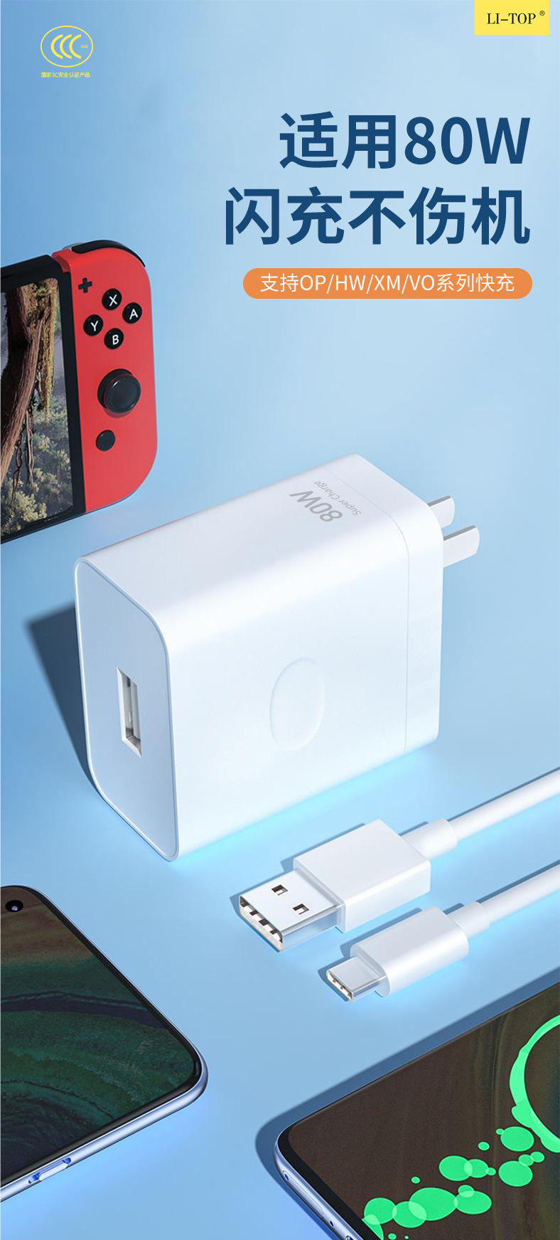 Cargador de 80W certificado por 3C compatible con QC3.0 flash cargar rápido teléfono móvil adecuado para Xiaomi Huawei cable de datos de cabeza de carga