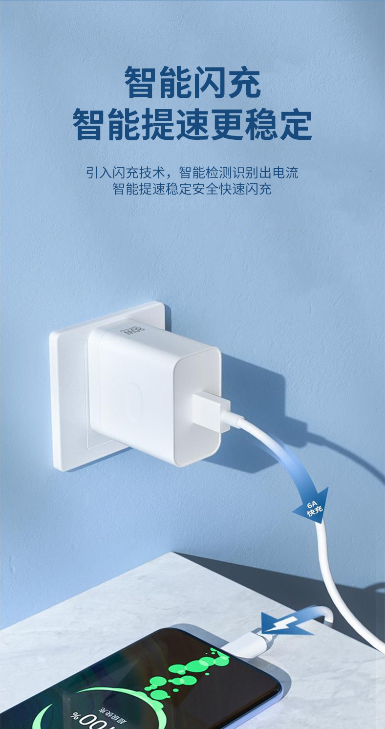 | Cargador de teléfono móvil de carga rápida | Cargador de 80W certificado por 3C compatible con QC3.0 flash cargar rápido teléfono móvil adecuado para Xiaomi Huawei cable de datos de cabeza de carga |
