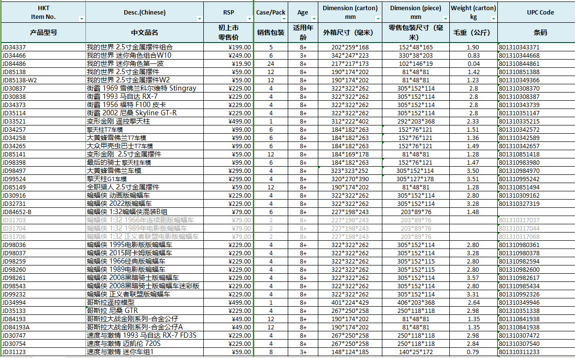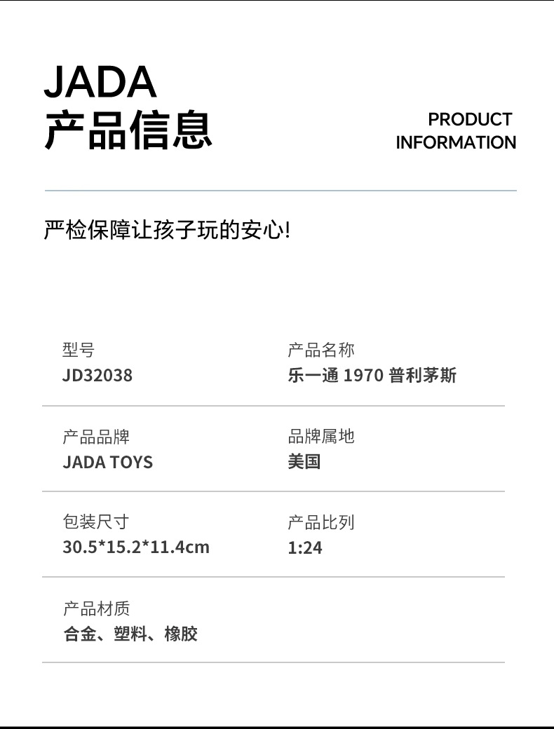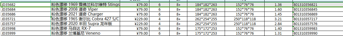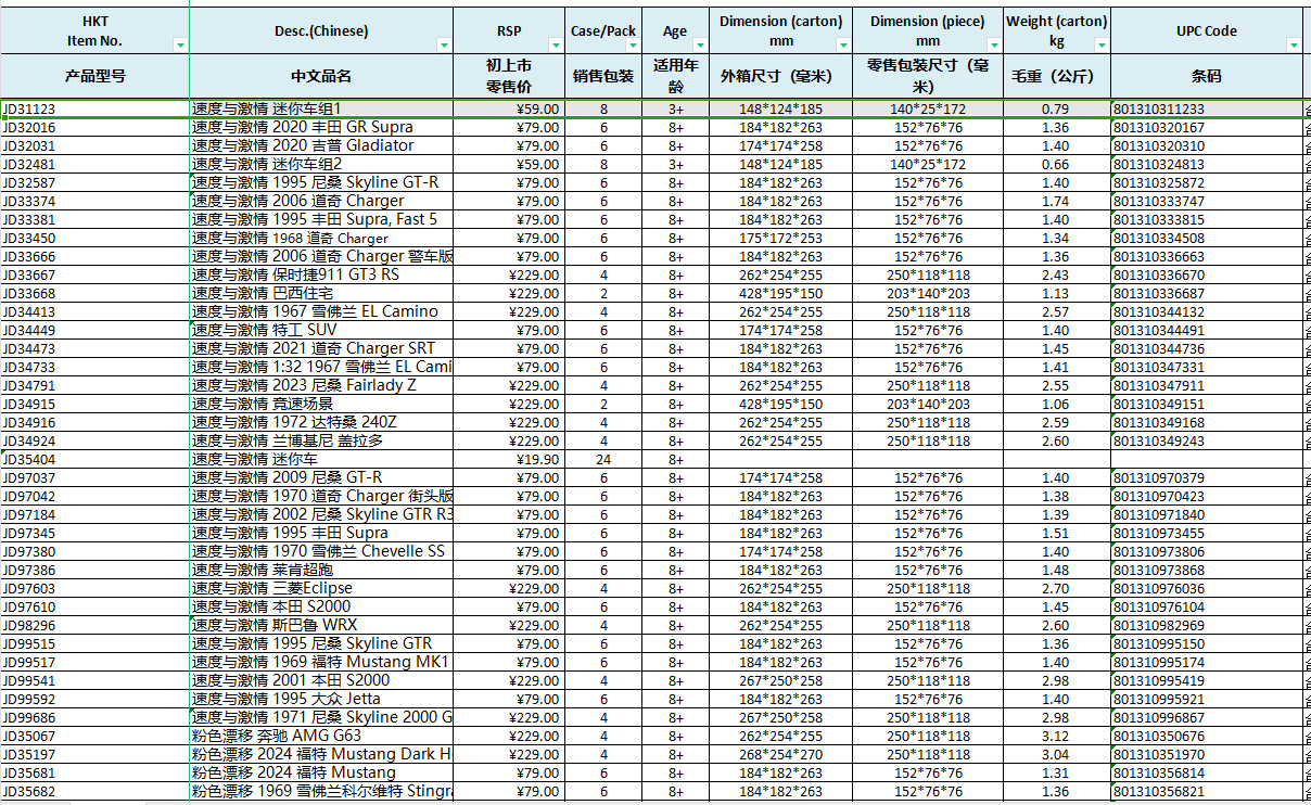 | Color | 1:24JD35510回到未来时光飞车特别版,1:32JD35595变形金刚大黄蜂-大众甲壳虫,1:24JD37022JDM2009尼桑 GT-R (R35),JD36368小猪佩奇新版遥控车,JD35133哥斯拉 尼桑 GTR,1:32JD32129侏罗纪公园1992吉普Wrangler8,1:24JD30838街霸 1993 马自达 RX-7,1:24JD34384奇多豹1985雪佛兰 Camaro Z28,【场景车】JD33668速度与激情 巴西住宅,【场景车】JD34915速度与激情 竞速场景,【场景车】JD34244侏罗纪公园 迷你场景,【场景车】JD34804回到未来迷你场景,【场景车】JD34914速度与激情 托雷托市场咖啡厅,1:24 JD32166回到未来III 时光飞车A,1:128 JD31583回到未来迷你车组,1:65 JD31955侏罗纪公园迷你车组,1:128 JD31123速度与激情 迷你车组1,1:32 JD97380速度与激情 1970 雪佛兰,1:24 JD35668Lab Monkeys联名款,1:24 JD34373街霸 1956 福特 F100 皮卡,1:24 JD30837街霸1969雪佛兰科尔维特 stingray,1:24 JD35114街霸2002尼桑 Skyline GT-R,1:24 JD30998警察与卡车强盗 1977 庞蒂克 Firebird,1:24 JD35433索尼克 兰博基尼 Veneno,1:24 JD35871索尼克 2012 斯巴鲁Impreza WRX STI,1:24 JD35131星期三 大众甲壳虫,1:32 JD32185回到未来I 时光飞车,1:24 JD32911回到未来I 时光飞车,1:24 JD31468回到未来II 时光飞车,1:24 JD34996回到未来III 时光飞车B 1:24,1:32 JD32290回到未来III时光飞车A,1:32,1:32 JD34785回到未来I 时光飞车(霜版),1:32 JD34786回到未来III 时光飞车B,1:32 JD30541回到未来II时光飞车1:32,1:24 JD33722猫和老鼠 2015 道奇 Challenge,1:32 JD35693速度与激情 保时捷 911 GT3 RS 997,1:32 JD36069速度与激情 1986丰田 Trueno,1:32 JD35614速度与激情 迈凯伦 Senna,1:24JD34922速度与激情 1989 福特 Mustang GT,1:32 JD99517速度与激情 1969 福特,1:32 JD99592速度与激情 1995 大众 Jetta,1:32 JD97037速度与激情 2009 尼桑,1:32 JD32587速度与激情 1995 尼桑,1:32 JD33381速度与激情 1995 丰田,1:32 JD34449速度与激情 特工 SUV,1:32 JD32031速度与激情 2020 吉普,1:32 JD97345速度与激情 1995 丰田,1:32 JD99515速度与激情 1995 尼桑,1:32 JD97184速度与激情 2002 尼桑,1:32 JD33666速度与激情 2006 道奇警车版,1:32 JD34473速度与激情 2021 道奇 Charger SRT,1:32 JD34733 速度与激情 1967 雪佛兰 EL Camino,1:32 JD97042速度与激情 1970 道奇 Charger 街头版,1:32 JD33450速度与激情 1968 道奇 Charger,1:32 JD97610速度与激情 本田 S2000,1:32 JD97386速度与激情 莱肯超跑,1:32 JD32016速度与激情 2020 丰田 GR Supra,1:32JD33374速度与激情 2006 道奇 Cha,1:128 JD32481速度与激情 迷你车组2,1:24 JD97603速度与激情 三菱Eclipse,1:24 JD34791速度与激情 2023 尼桑 Fairlady Z,1:24 JD34924速度与激情 兰博基尼 盖拉多,1:24 JD30754速度与激情 迈凯伦 720S,1:24 JD34916速度与激情 1972 达特桑 240Z,1:24 JD98296速度与激情 斯巴鲁 WRX,1:24 JD33667速度与激情 保时捷911 GT3 RS,1:24 JD34413速度与激情 1967 雪佛兰 EL Camino,1:24 JD98543蝙蝠侠 2008黑暗骑士版蝙蝠车迷彩版,1:24 JD98260蝙蝠侠 1989电影版蝙蝠车,1:24 JD30916蝙蝠侠 动画版蝙蝠车,1:24 JD98036蝙蝠侠 1995电影版版蝙蝠车,1:24 JD98261黑暗骑士版2008蝙蝠车,1:24 JD99232正义者联盟版蝙蝠车,1:24 JD32731蝙蝠车2022版,1:24 JD98037蝙蝠侠 2015阿卡姆版蝙蝠车,1:32 JD30915蝙蝠侠动画版蝙蝠车,1:32 JD98717蝙蝠侠 1995电影版版蝙蝠车,1:32JD98718蝙蝠侠 2015阿卡姆版蝙蝠车,1:32 JD98232蝙蝠侠 2008黑暗骑士版蝙蝠车,1:32JD32733蝙蝠侠 2022年电影版蝙蝠车,1:32 JD35998 粉色漂移 马自达 RX-7,1:32 JD35999 粉色漂移 兰博基尼 Veneno,1:24 JD35757 粉色漂移 2020 丰田 Supra 龙年版,1:24 JD35067 粉色漂移 奔驰 AMG G63,1:24 JD35721 粉色漂移 1965 谢尔比 Cobra 427 S/C,1:32 JD35686粉色漂移 2021 道奇 Charger,1:32 JD35682 粉色漂移 1969 雪佛兰科尔维特 Stingray,1:32 JD35681 粉色漂移 2024 福特,1:24 98497 大黄蜂雪佛兰车模,1:24 99524 擎天柱G1车模,1:32 34265 大众甲壳虫巴士T7车模,1:32 98398擎天柱 最后的骑士,1:32 34258 大黄蜂雪佛兰T7,1:32 34257 擎天柱T7车模,1:24 JD32907小猪佩奇遥控汽车,1:32JD31956侏罗纪公园福特探险者,1:32JD84652-B蝙蝠侠混装B组,1:24 JD35130乐一通雪佛兰EICamino,1:24 JD32390乐一通1957雪佛兰科尔维特,1:24 JD32250邪恶力量1967雪佛兰lmpalaSportSedan,1:24 JD32038乐一通1970普利茅斯RoadRunner,1:32 JD31116霹雳游侠1982庞蒂克TransAM,1:32,1:24 JD97806侏罗纪公园1992经典吉普Wrangler1:24,1:32JD99519速度与激情1967FordMustang,1:32JD98377速度与激情1993mazdarx-7fd3s,1:24JD37023JDM丰田GRsupra,JD37021尼桑skyline2000,1:24JD37020JDM1972大产240Z,1:24JD36819Liberty Walk克尔维特C8,1:32JD36357速度与激情LAPDFord Crown victoria,1:24JD36285 哥斯拉2009尼桑GT-R,1:32 JD35295哥斯拉尼桑GT-R,1:32JD34443速度与激情1969 Chevrolet Camaro,1:32JD32588速度与激情 HKS 1993 Mazda RX7,1:32JD30736速度与激情 1997 马自达RX-7 |