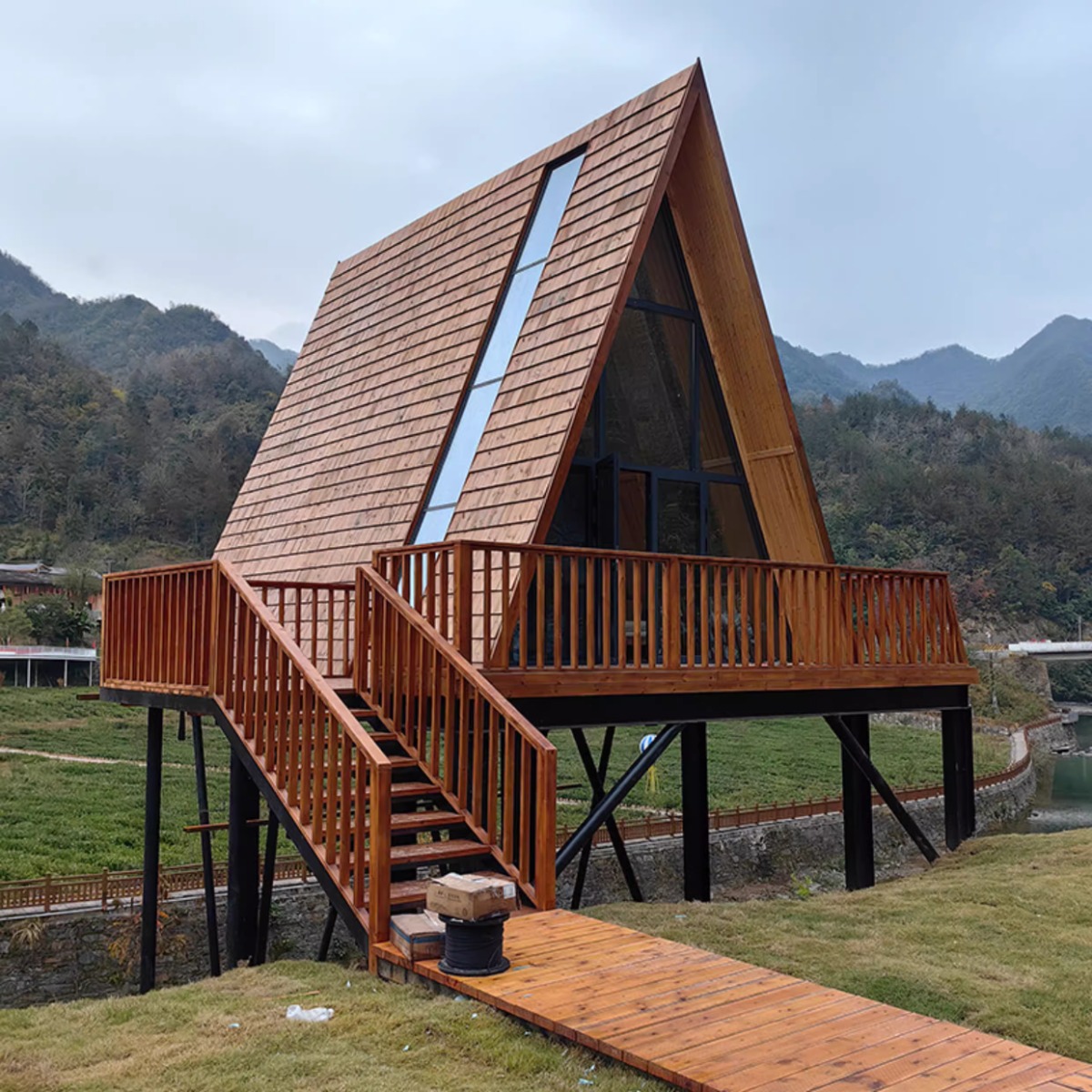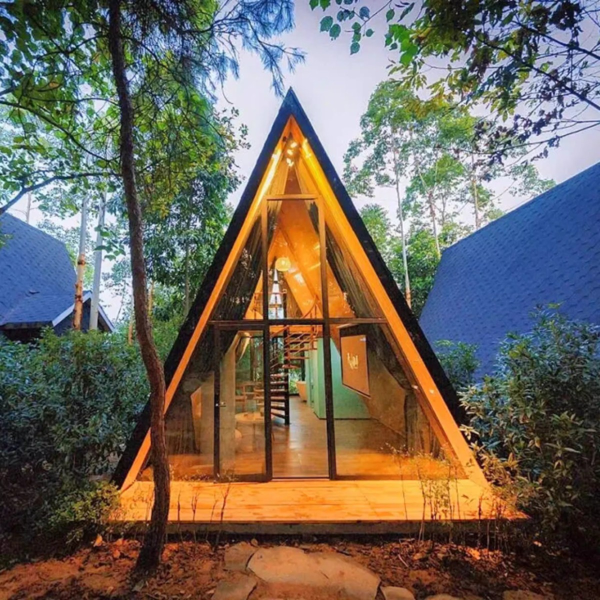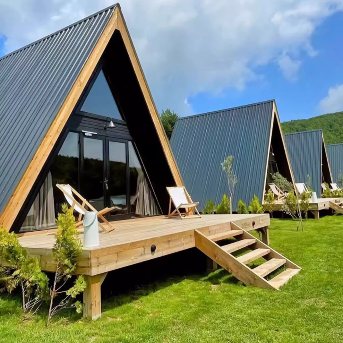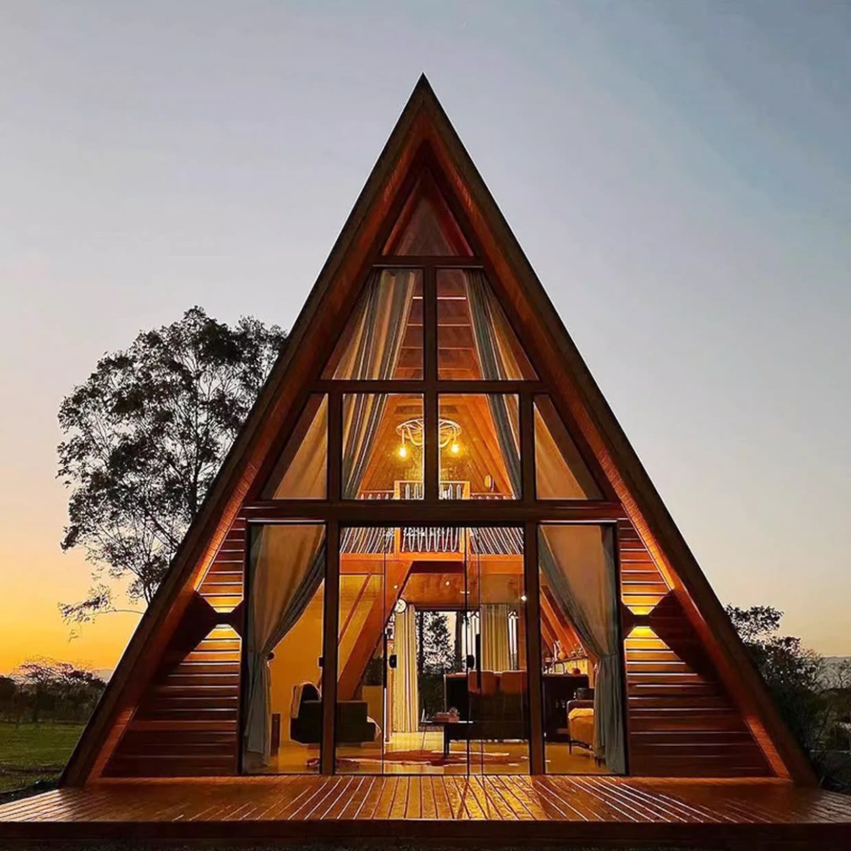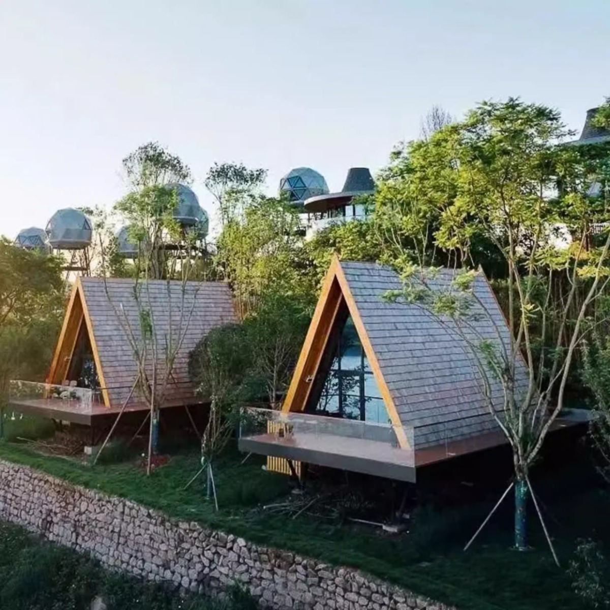 Casa de madera triangular red de lujo al aire libre salvaje cabaña de vacaciones alojamiento residencial pequeña casa de diseño villa patio casa en el árbol