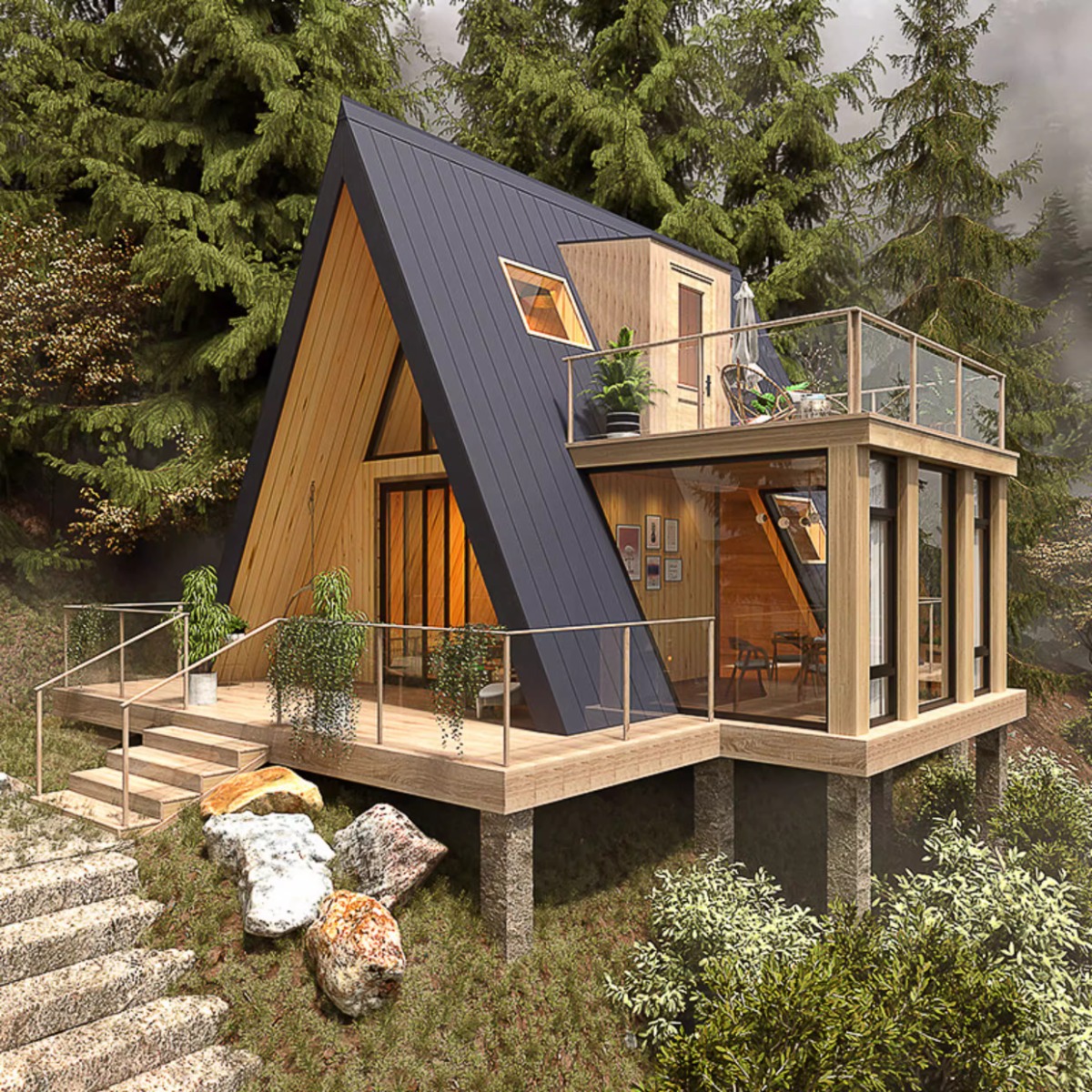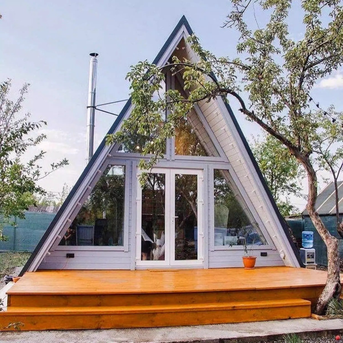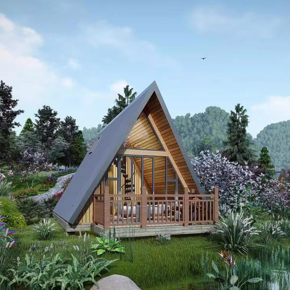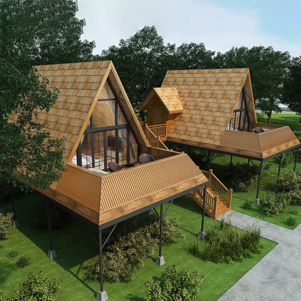 Casa de madera triangular red de lujo al aire libre salvaje cabaña de vacaciones alojamiento residencial pequeña casa de diseño villa patio casa en el árbol