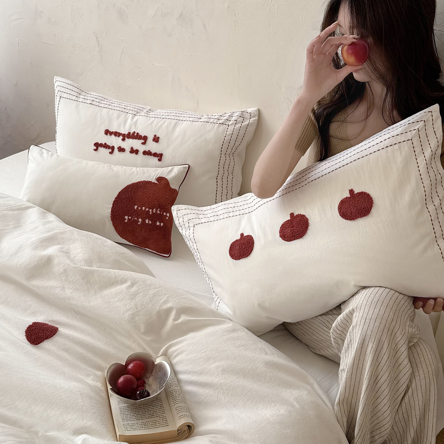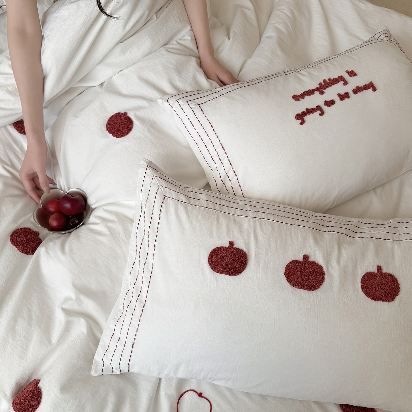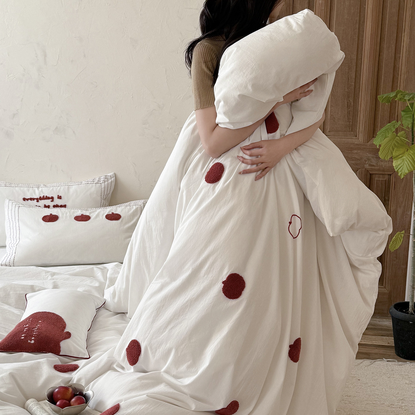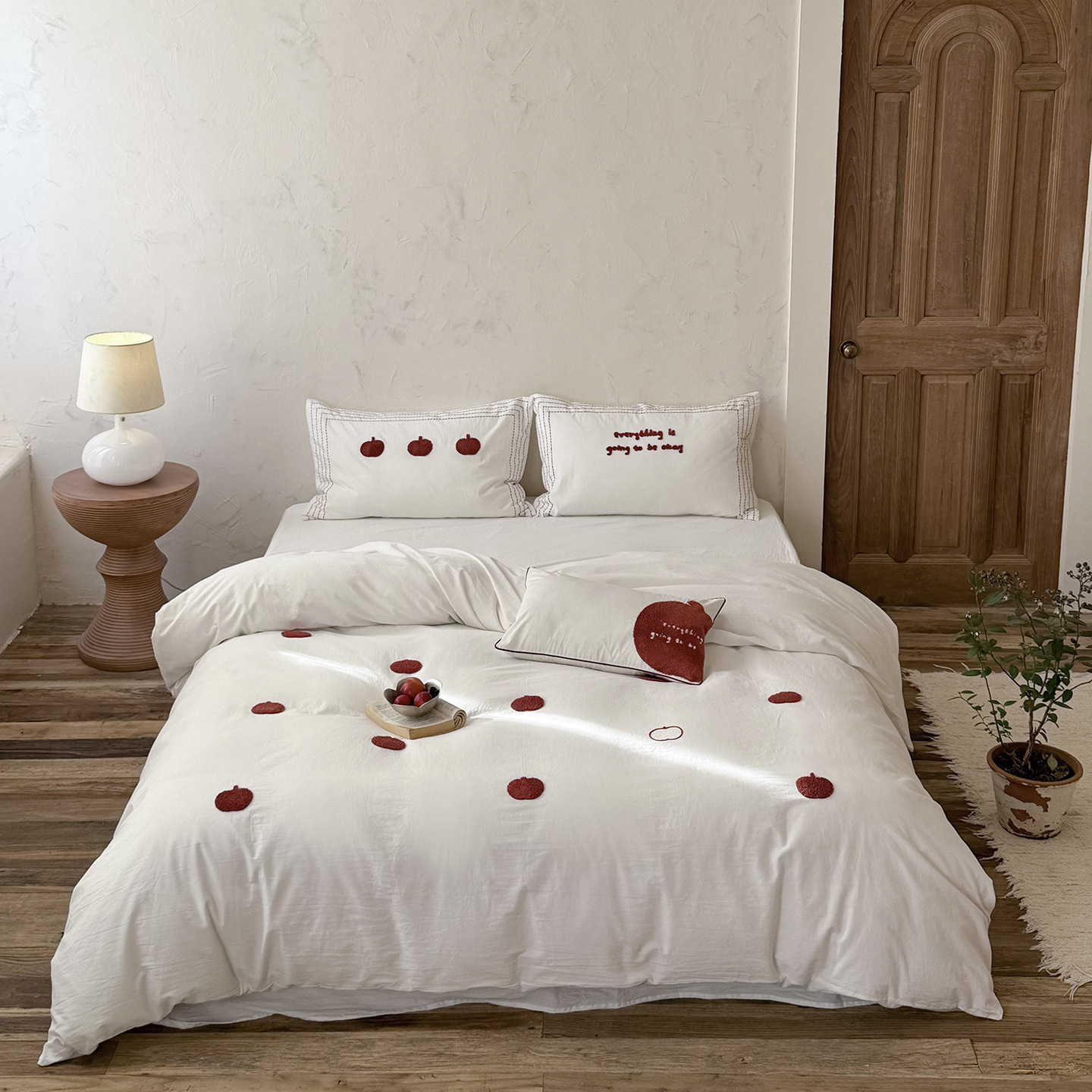 Blanco 100% algodón lavado con agua de algodón cifrado cuatro piezas toallas tridimensionales bordadas Ping An fruta piel edredón cama de algodón