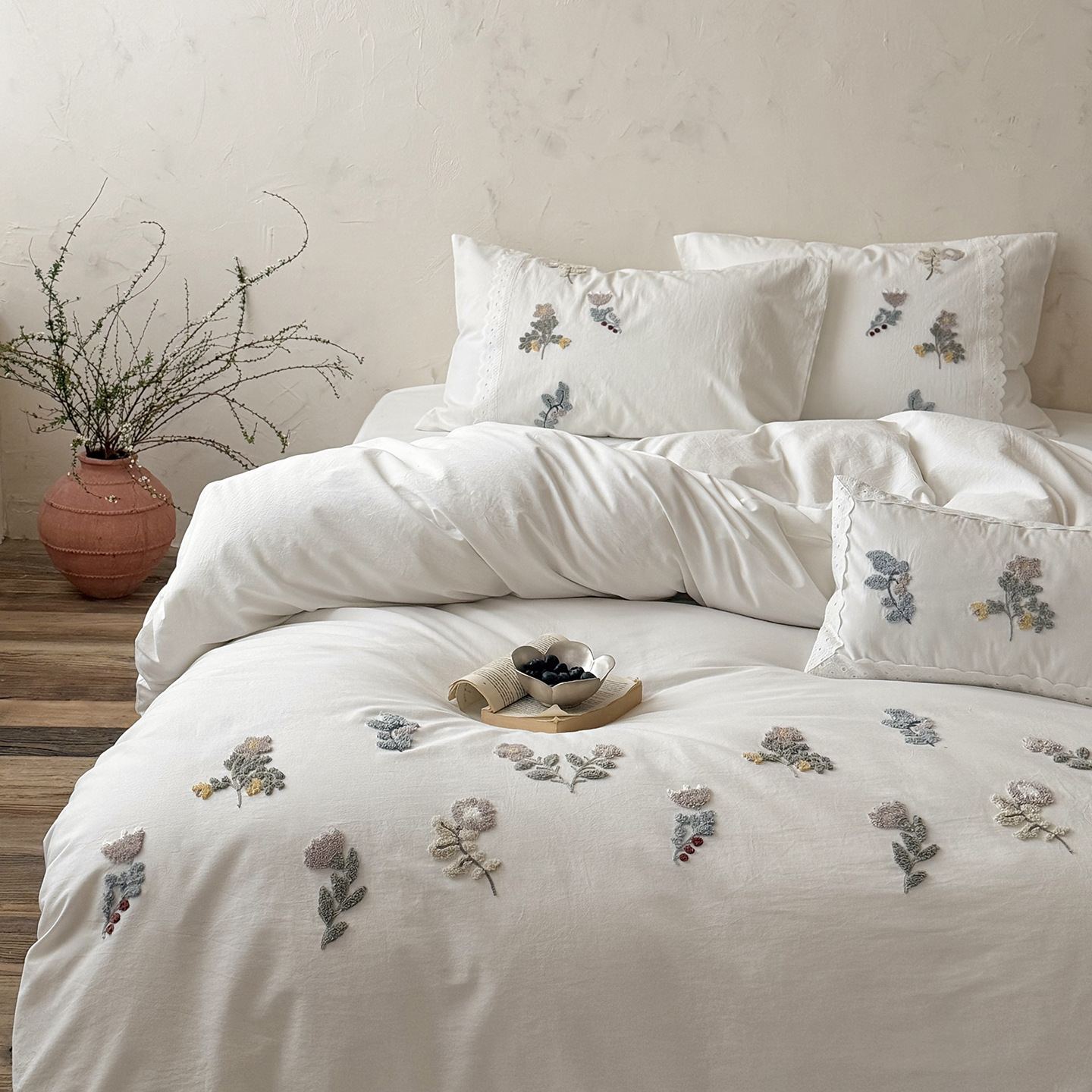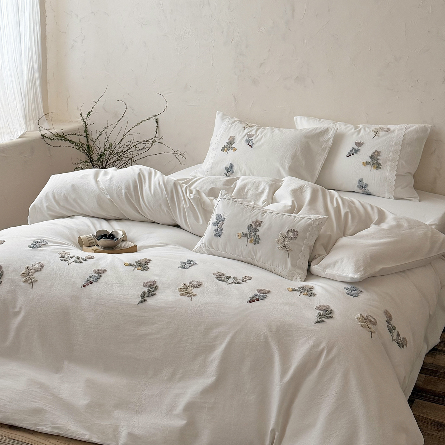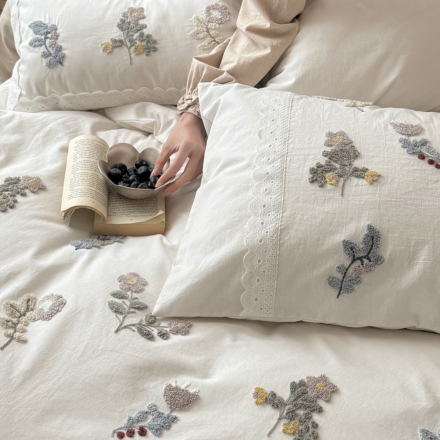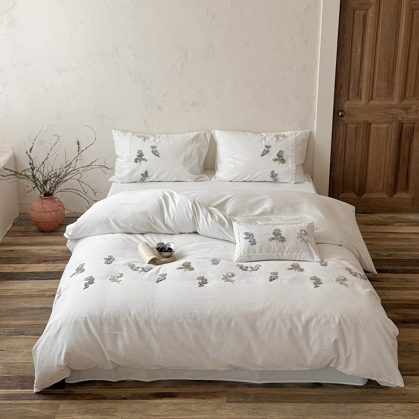 Blanco 100% algodón lavado con agua de algodón cifrado cuatro piezas toallas tridimensionales bordadas Ping An fruta piel edredón cama de algodón