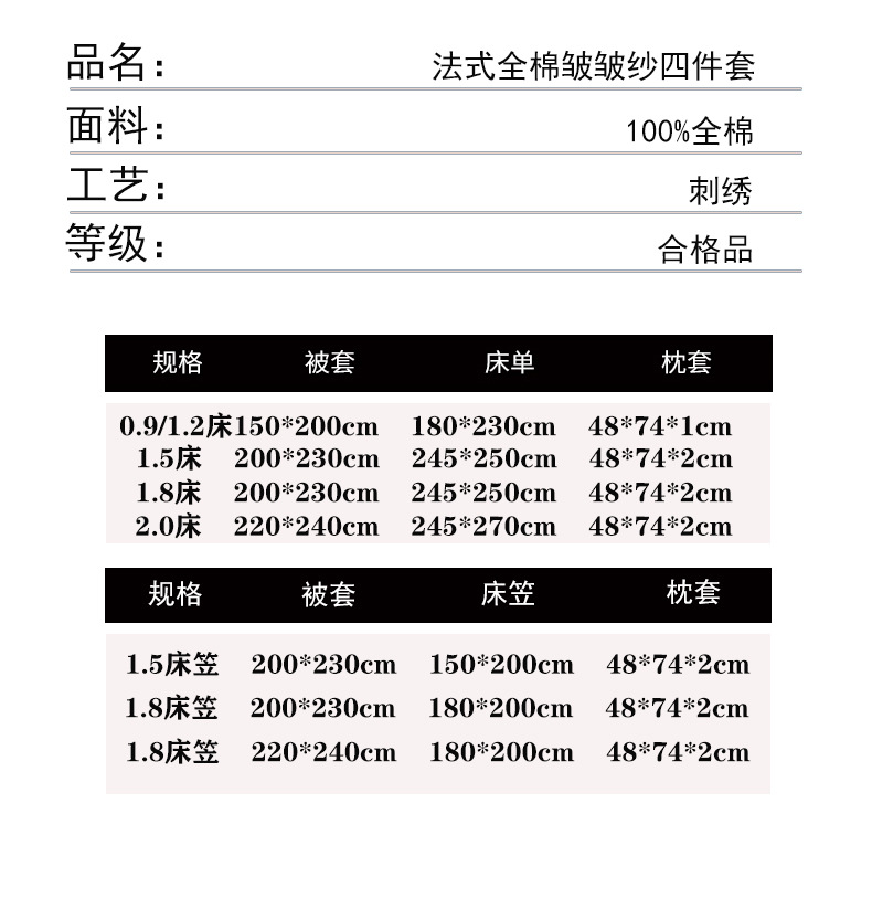 | Especificaciones de tamaño | 1.2m sábanas de tres partes (apto para núcleo de edredón 150 * 200cm), 1.5m sábanas de cuatro piezas [apto para edredón 200 * 230], 1.8m sábanas de cuatro piezas [apto para edredón 200 * 230], cubierta de edredón más grande 1.8m sábanas de cuatro piezas [apto para edredón 220 * 240], 2.0m sábanas de cuatro piezas [apto para edredón 220 * 240], 1.5m sábanas de cuatro piezas [apto para edredón 200 * 230], 1.8m [casa de cama] conjunto de cuatro piezas [adecuado para edredón 200 * 230], aumento de la cubierta de edredón 1.8m [casa de cama] conjunto de cuatro piezas [adecuado para edredón 220 * 240] |