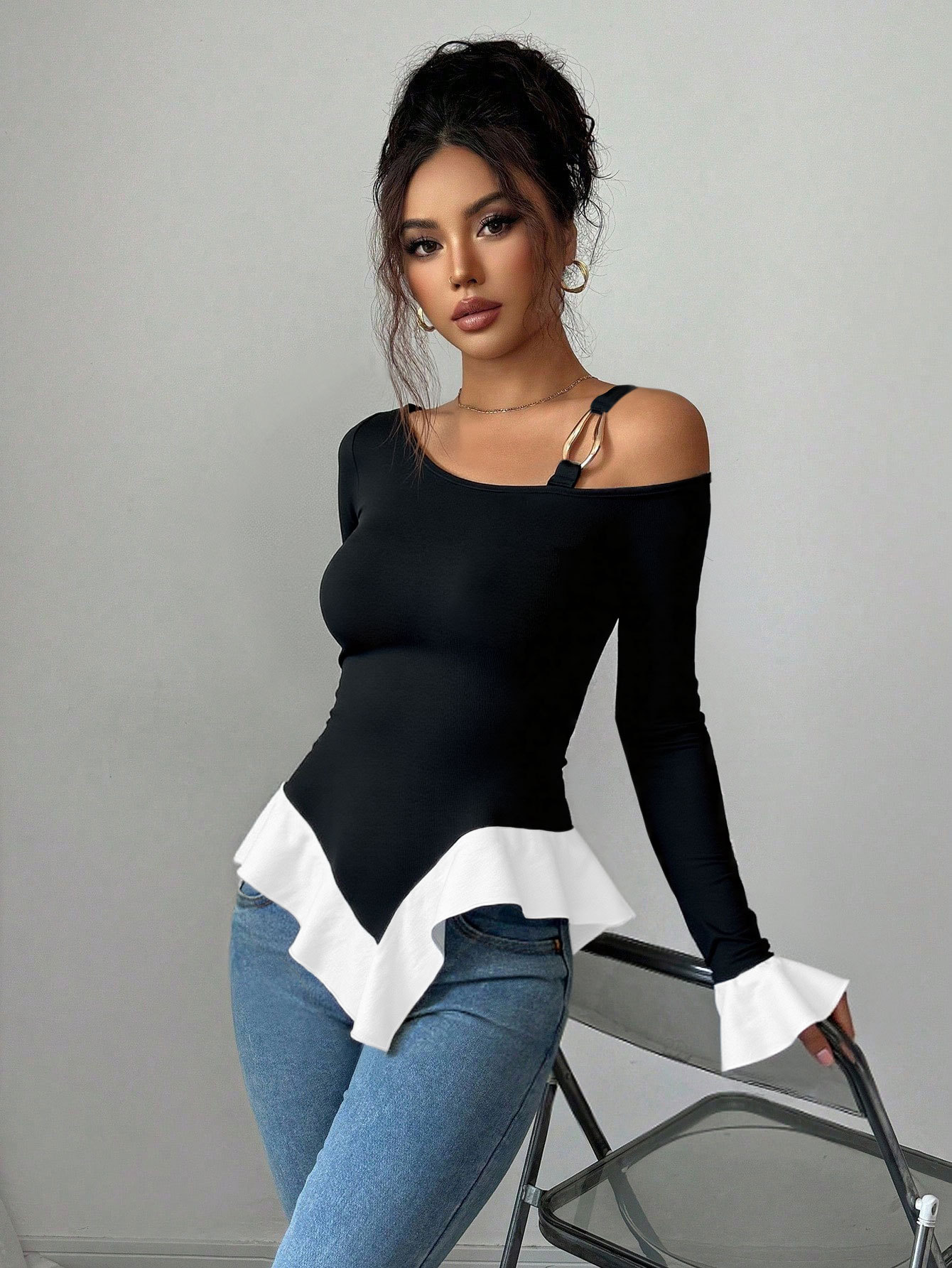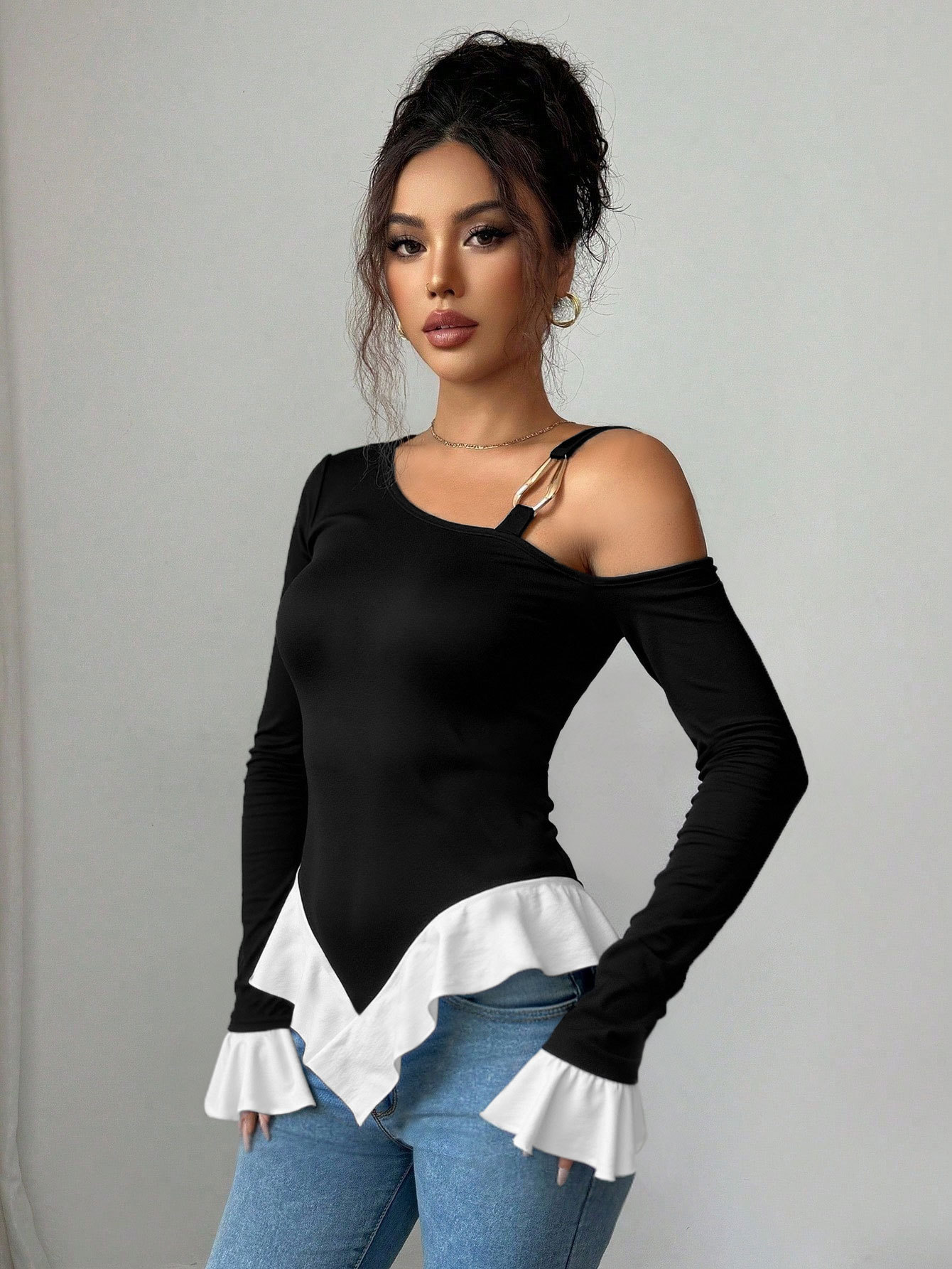 Collar negro de un solo hombro decoración de bucle de metal corto trasero largo borde de lótus blanco perilla de color contraste primavera-verano chaqueta mujer