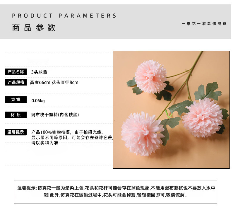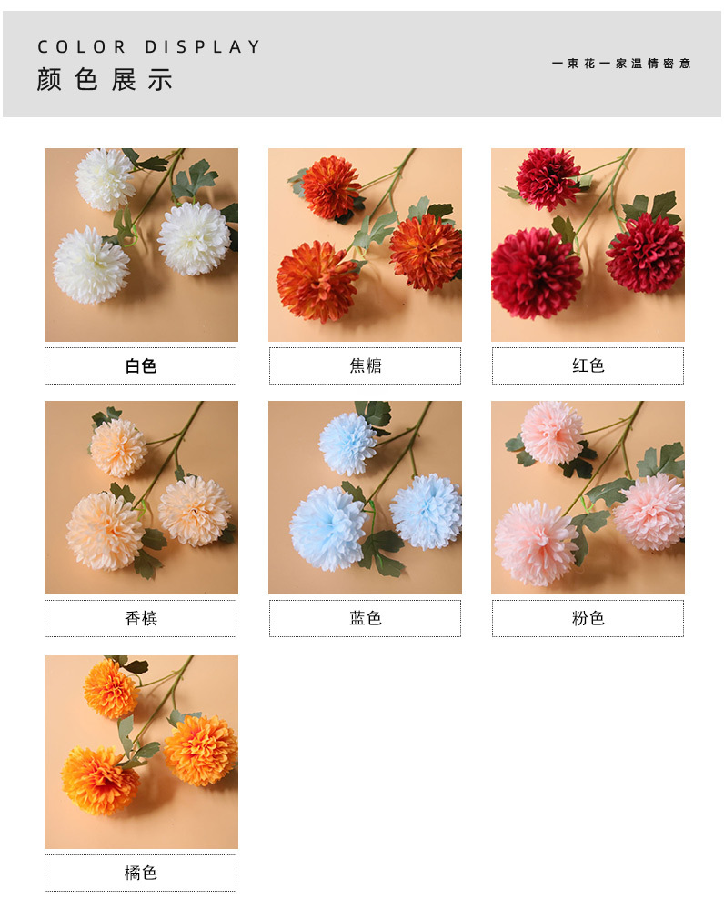 | Colores | Crisantemo de ping pong de 3 cabezas, blanco,Crisantemo de ping pong de 3 cabezas, rosa,Crisantemo de ping pong de 3 cabezas, azul,Crisantemo de ping pong de 3 cabezas, rojo,Crisantemo Pompon de 3 cabezas, naranja,Crisantemo Pompon de 3 cabezas, Champagne |