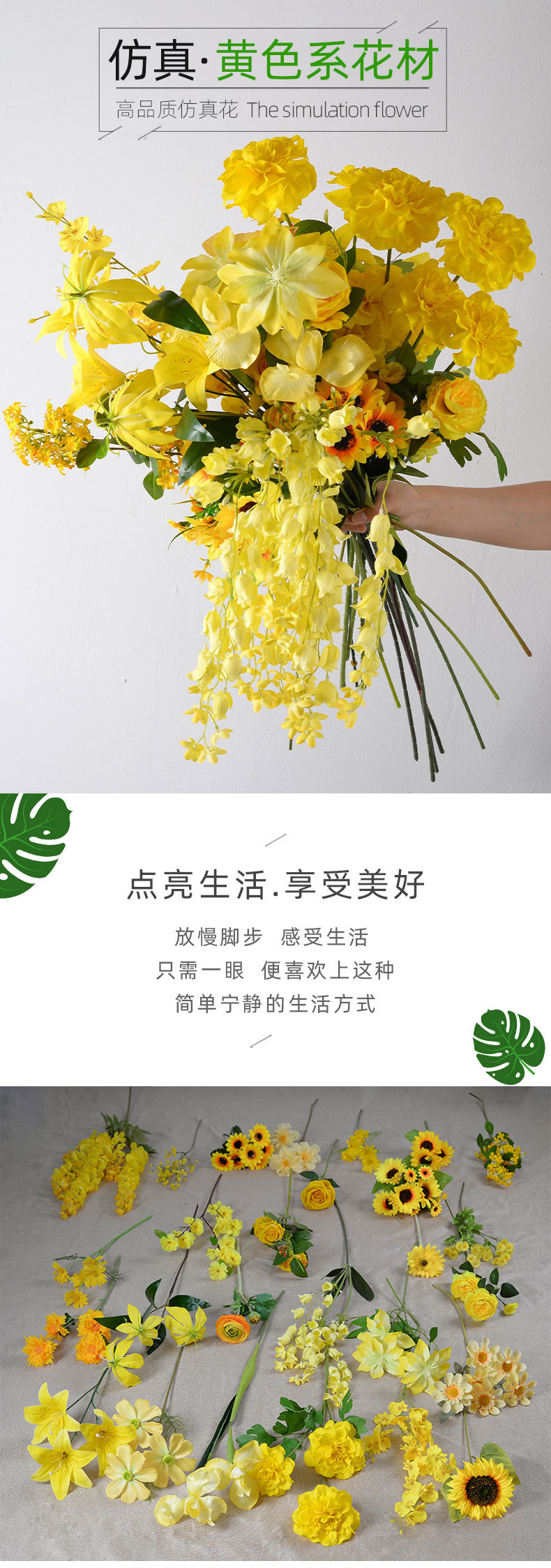 Flor artificial Serie amarilla dopamina Material de la flor de la boda Rosa artificial Flor falsa Sala de bodas Decoración del hogar Flor artificial