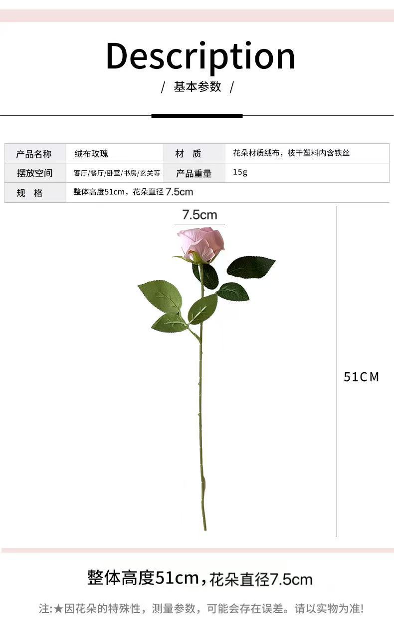 Rosa sola flor artificial de franela decoración de la boda del Día de San Valentín Hotel Flor decorativa flor artificial Rosa fábrica al por mayor