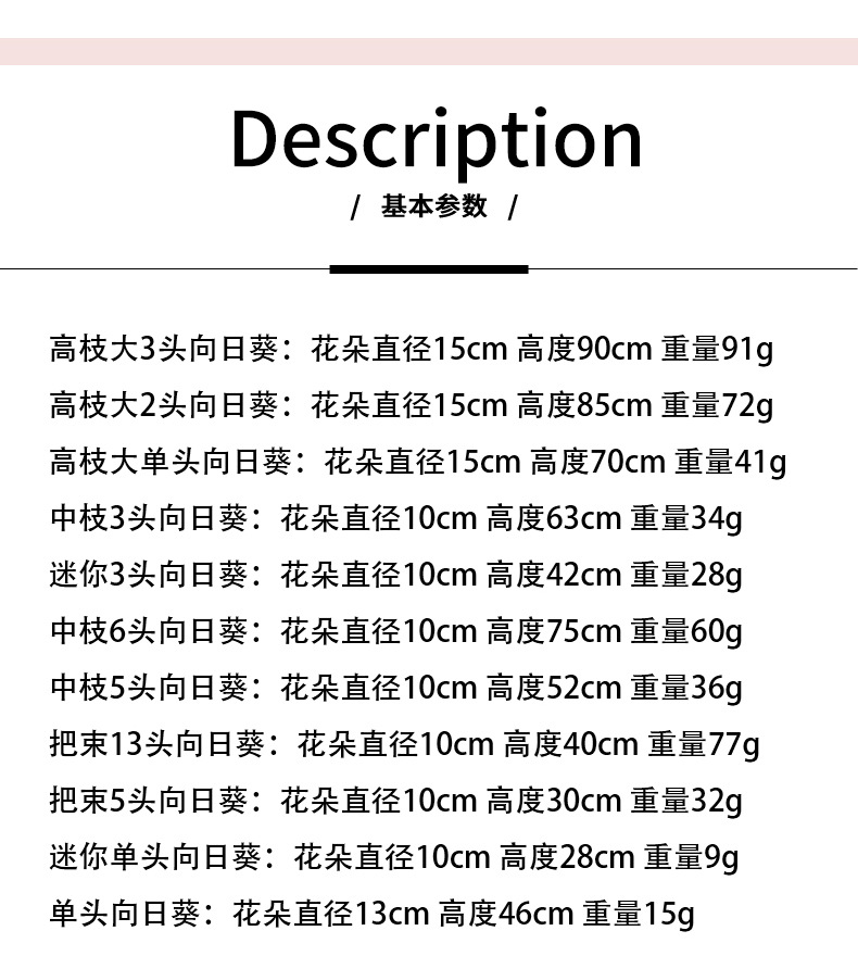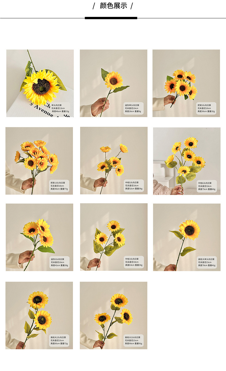 | Color | Mini girasol de cabeza única, girasol de cabeza única, el paquete de girasol de 5 cabezas, el paquete de girasol de 13 cabezas, ramas altas 3 girasol, ramas altas 2 girasol, ramas altas girasol de cabeza única, ramas medias 3 girasol, ramas medias 5 girasol, ramas medias 6 girasol |