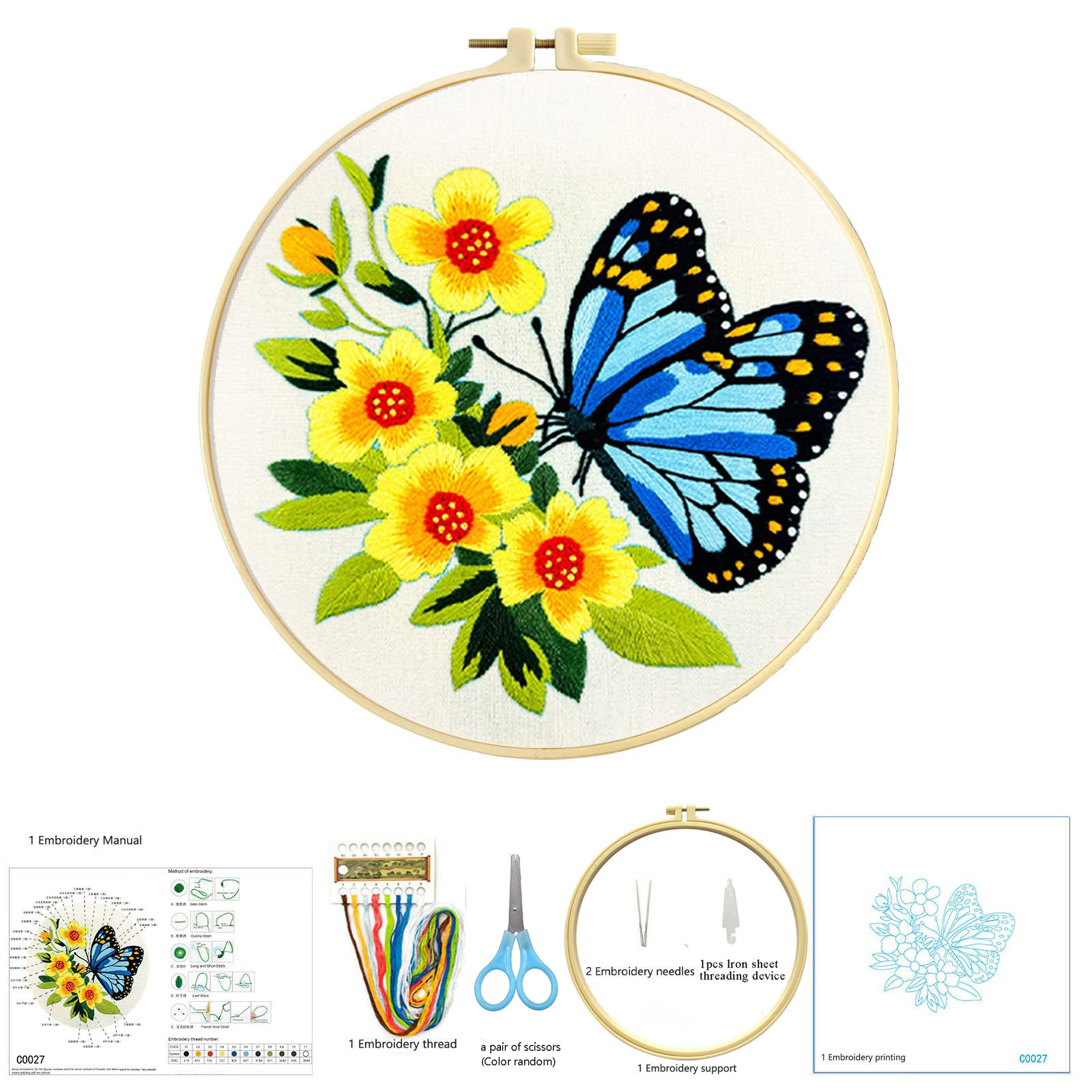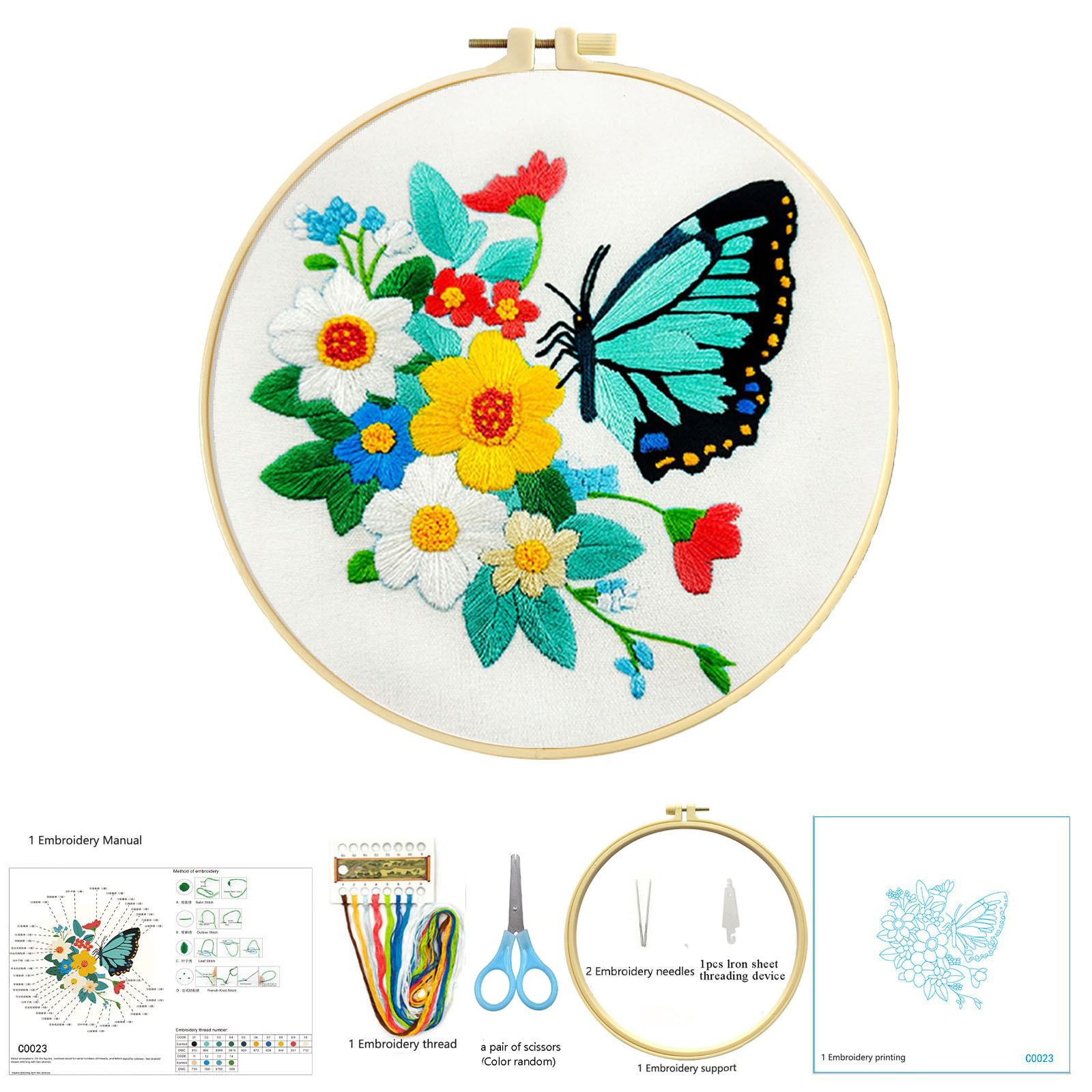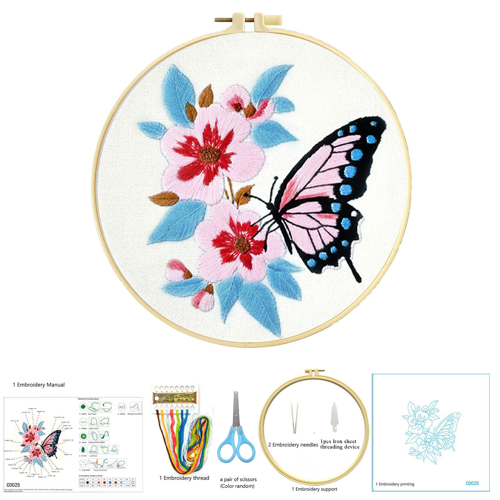 El kit básico de costura incluye un aro de bordado de 20 cm, un enhebrador de agujas de hierro y un par de tijeras pequeñas.