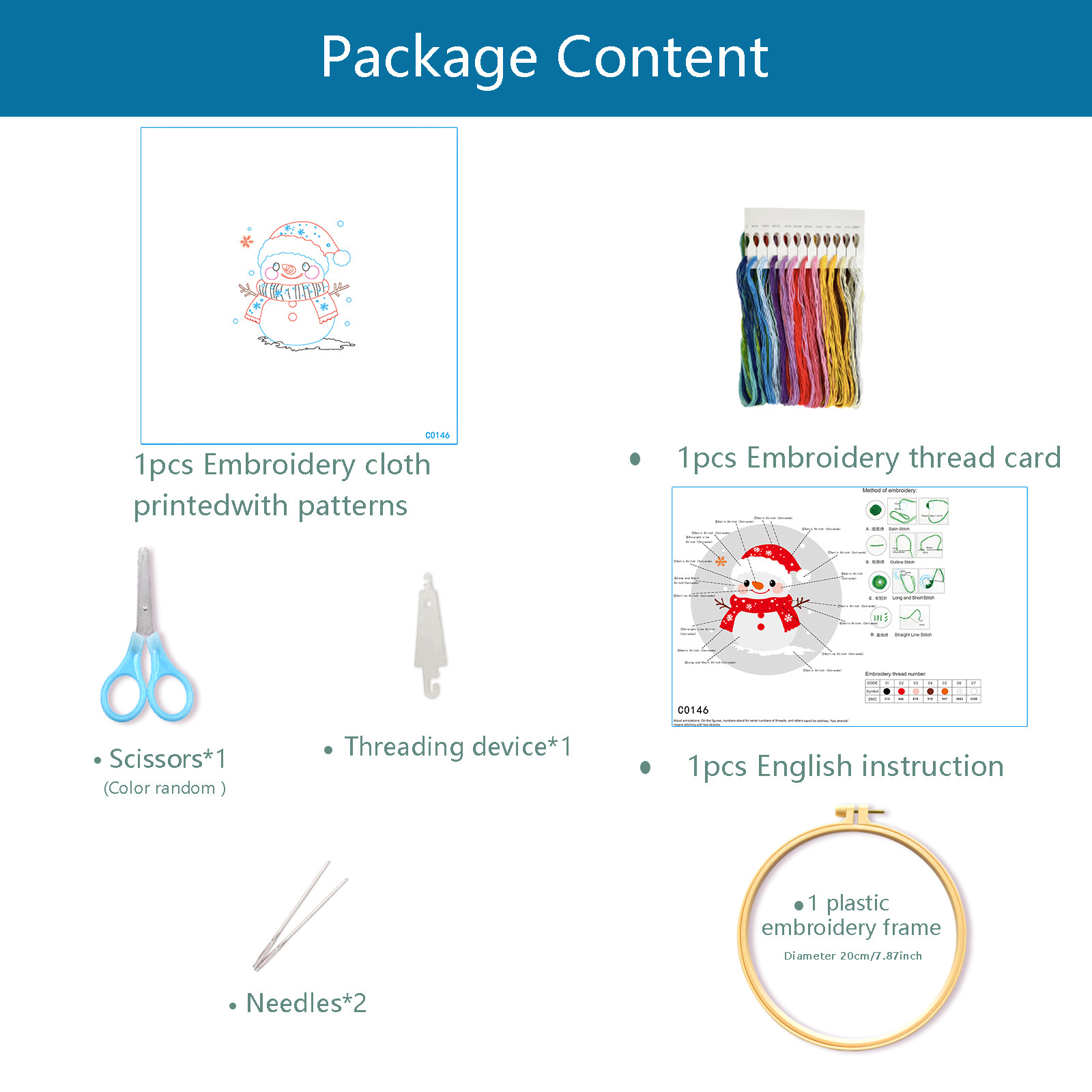 | Tamaño | Paquete de materiales básicos (contiene dos agujas de hilo de bordado), paquete de materiales + 20CM de bordado + perforador de hoja de hierro + tijeras |