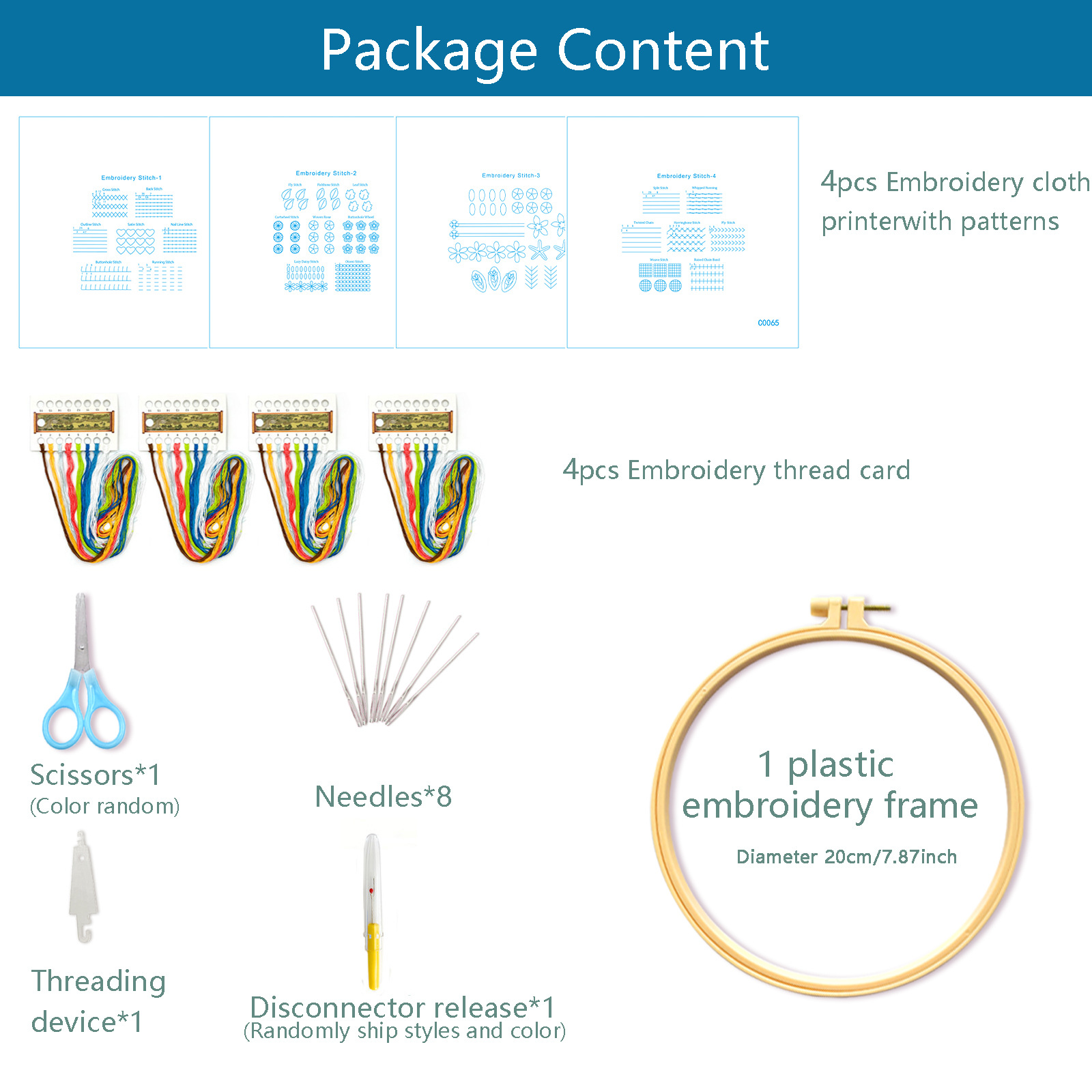 | Colores | Kit básico de bordado (Incluye un aro de bordado de 20 cm, un par de tijeras para niños, un enhebrador de agujas de metal y un descosedor) |