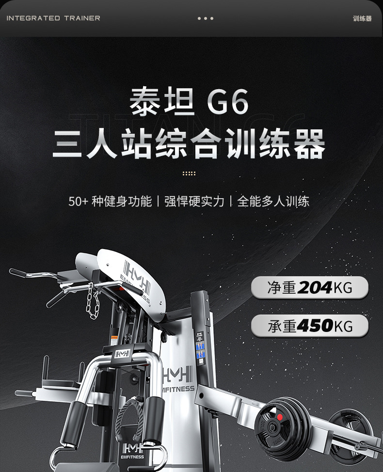 | Especificaciones | Contrapeso de cemento Titan G6 (EM991),Dispositivo de entrenamiento integral para tres personas [peso de cemento 80 KG] + placa de barra de 60 KG,Dispositivo de entrenamiento integral para tres personas [peso de cemento 80 KG] + placa de barra de 80 KG,Dispositivo de entrenamiento integral para tres personas [peso de cemento 80 KG] + placa de barra de 100 KG,Contrapeso de acero inoxidable G6-pro Titan (EM991A),Dispositivo de entrenamiento integral para tres personas [peso de acero inoxidable 60 KG] + placa de barra de 60 KG,Dispositivo de entrenamiento integral para tres personas [peso de acero inoxidable 60 KG] + placa de barra de 80 KG,Dispositivo de entrenamiento integral para tres personas [peso de acero inoxidable 60 KG] + placa de barra de 100 KG |
