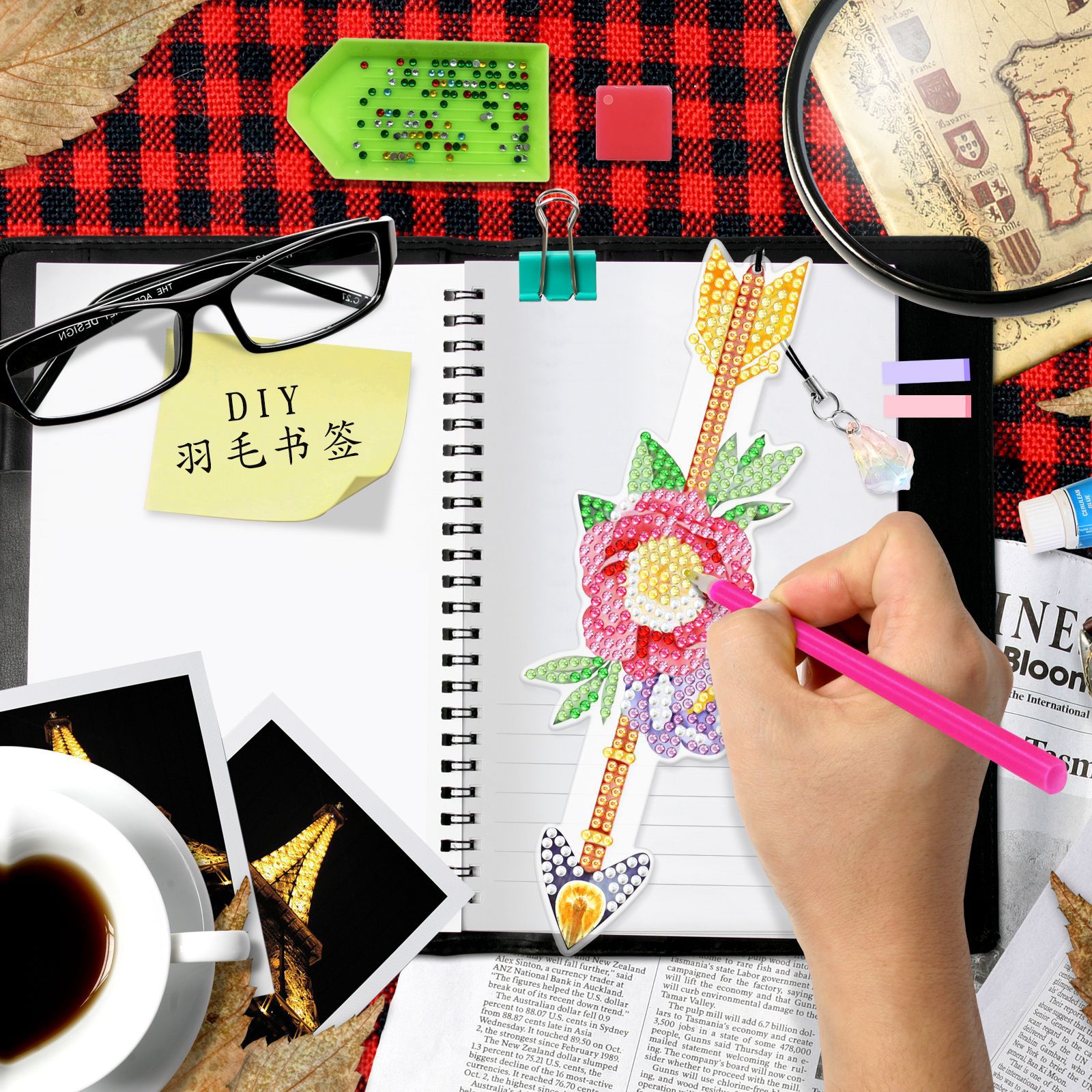 Accesorios populares transfronterizos para pintura de diamantes, colgante creativo de pluma DIY para marcapáginas, soporte para notas hecho de material PET, disponible para distribución al por mayor.