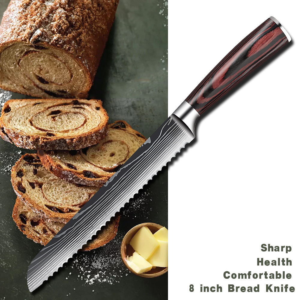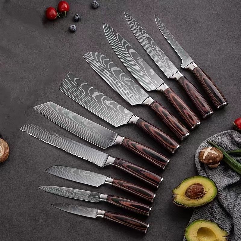 Venta caliente transfronteriza patrón de Damasco cuchillo de chef mango de madera de color cuchillo de cocina de acero inoxidable juego de cuchillos de estilo japonés Sande al por mayor