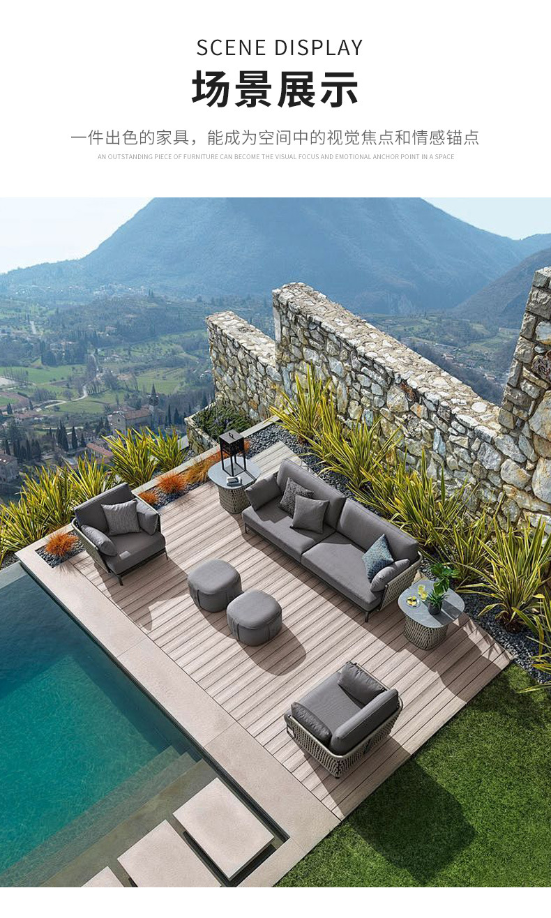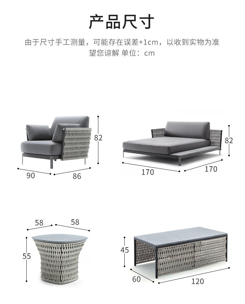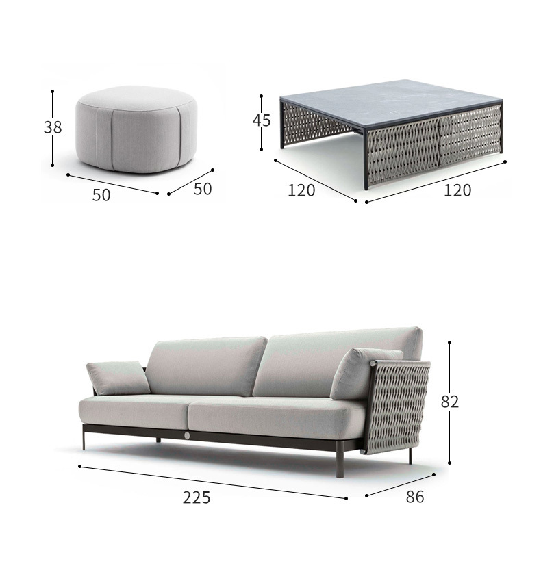 | Color | Sofá individual, sofá multiplaza, taburete, cama reclinada, mesa larga, mesa cuadrada, varios lados cuadrados, set de siete piezas, set de ocho piezas |