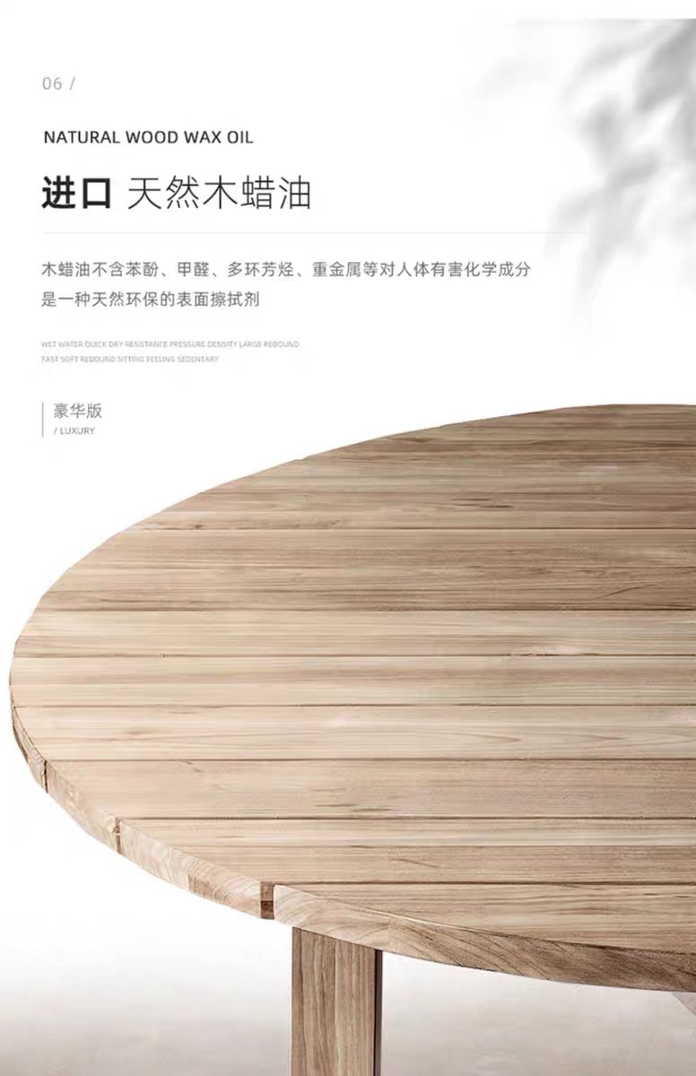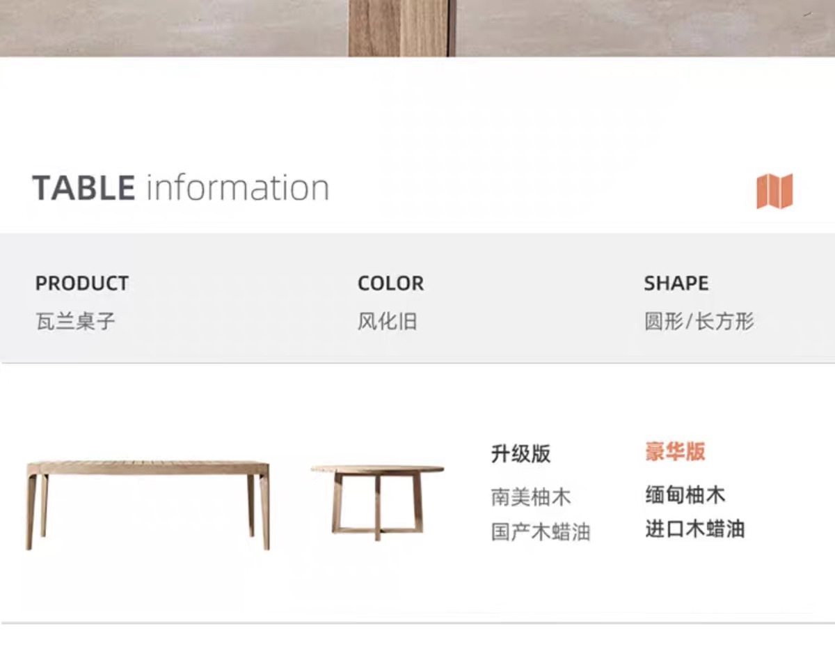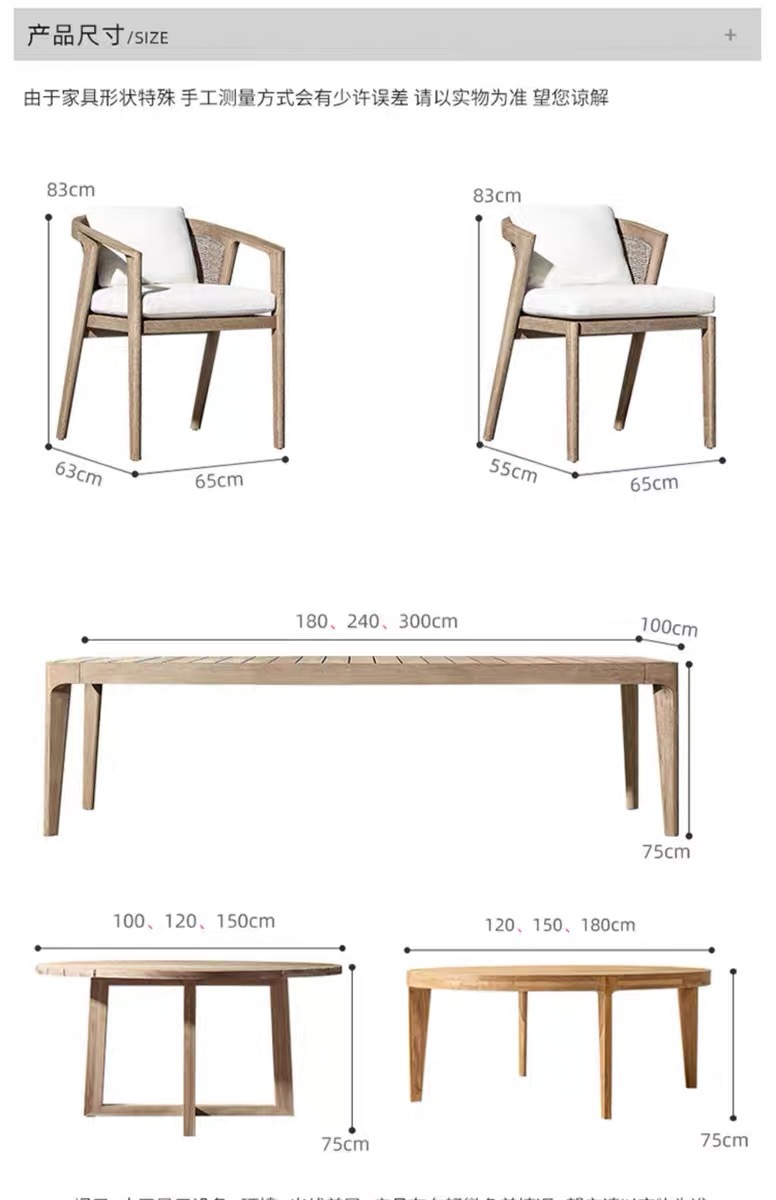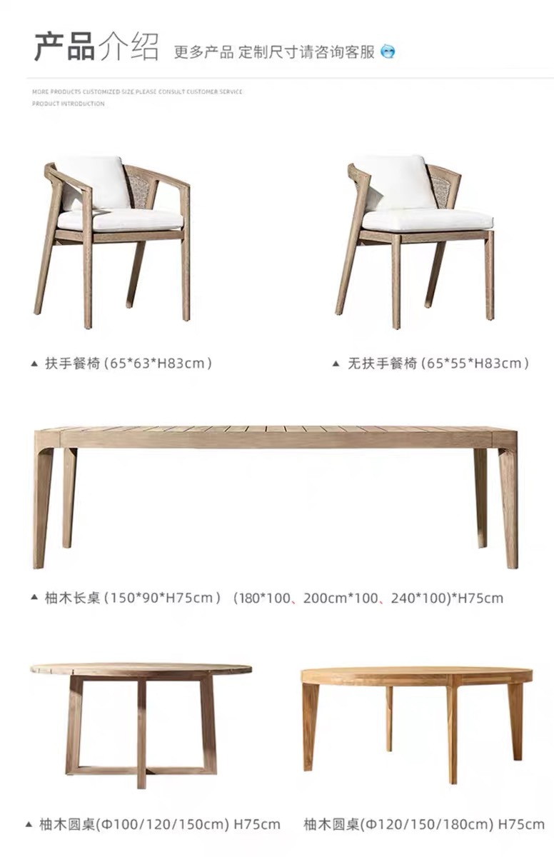 | Colores | 6 sillones mesa larga de 1,8 m (teca importada),8 mesas largas de 2,4 m sin sillón (teca importada),Sin sillón (teca importada),Sillón (teca importada),Silla de bar (teca importada),Barra de 140cm (teca importada),Mesa redonda de 100cm (teca importada),Mesa redonda de 120cm (teca importada),Mesa redonda de 150cm (teca importada),Mesa larga de 180*80cm (teca importada),Mesa larga de 240*80cm (teca importada),Mesa larga de 300*90cm (teca importada) |