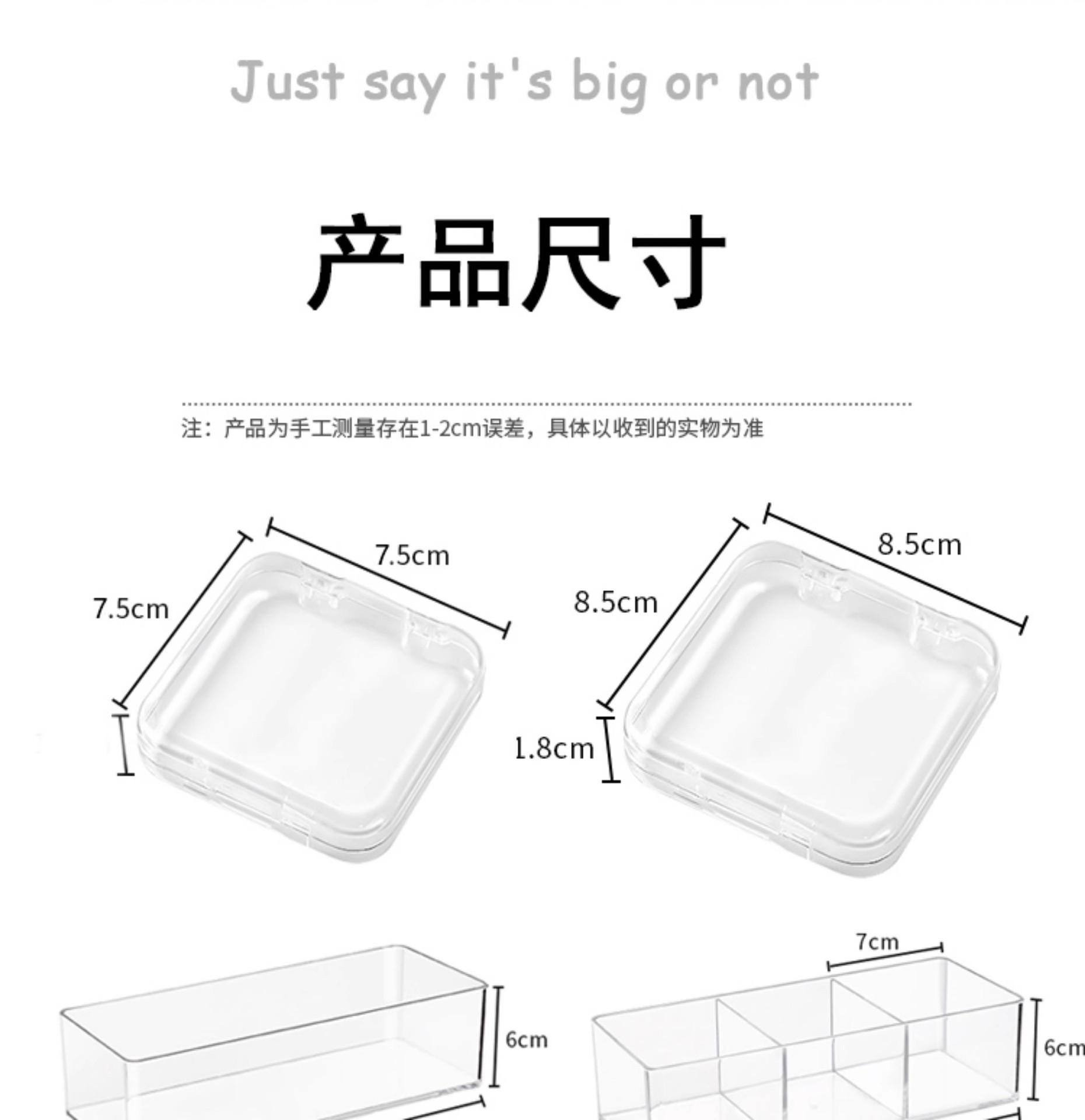 | Especificaciones | Caja de almacenamiento de caja de manicura con tapa (27.5 * 17.5 * 9.3cm), caja de almacenamiento de tres cuadrados de 8.5 (23 * 9 * 6cm), caja de almacenamiento de 8.5 (19.1 * 9.3 * 4.6cm), caja de almacenamiento de 7.5 (29 * 9 * 5.8cm), caja de embalaje de manicura redonda 85 / 85 / 19 / 36g transparente, caja de embalaje de manicura redonda 75 / 75 / 16mm / 26g transparente |
