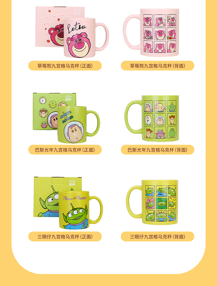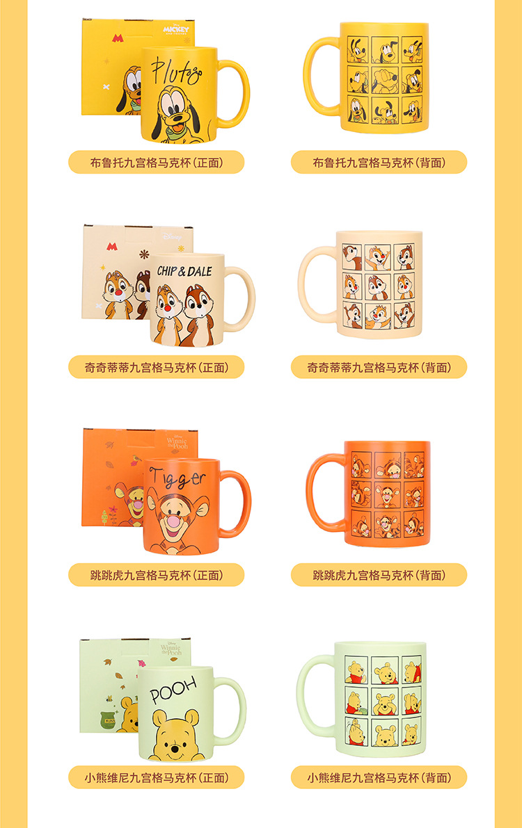 | Colores | Copa Mickey Nine Palace,Copa Minnie Nine Palace,Taza Pato Donald Nine Palace,Taza Daisy Nine Palace,Copa Chichtiti,Taza Strawberry Bear Jiugongge,Taza con diseño de cuadrícula de nueve cuadrados y niño de tres ojos.,Copa Stitch Nine Palace,Taza Mary Cat Nine Palace,Copa Broto Nine Palace,Copa Judy Nine Palace,Copa Nick Jiugongge,Taza Leopard Jiugongge,Taza Tigger Jiugongge |