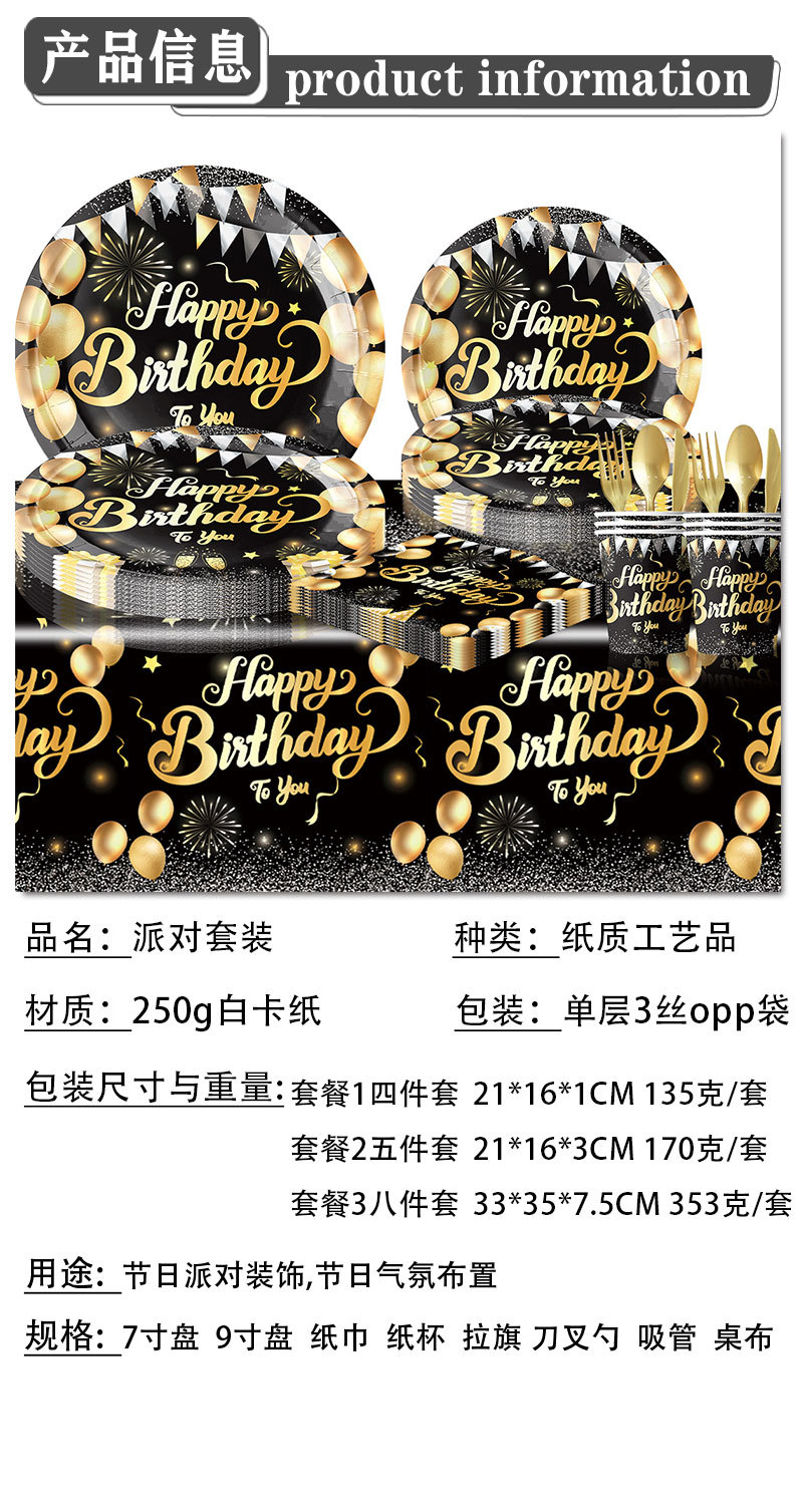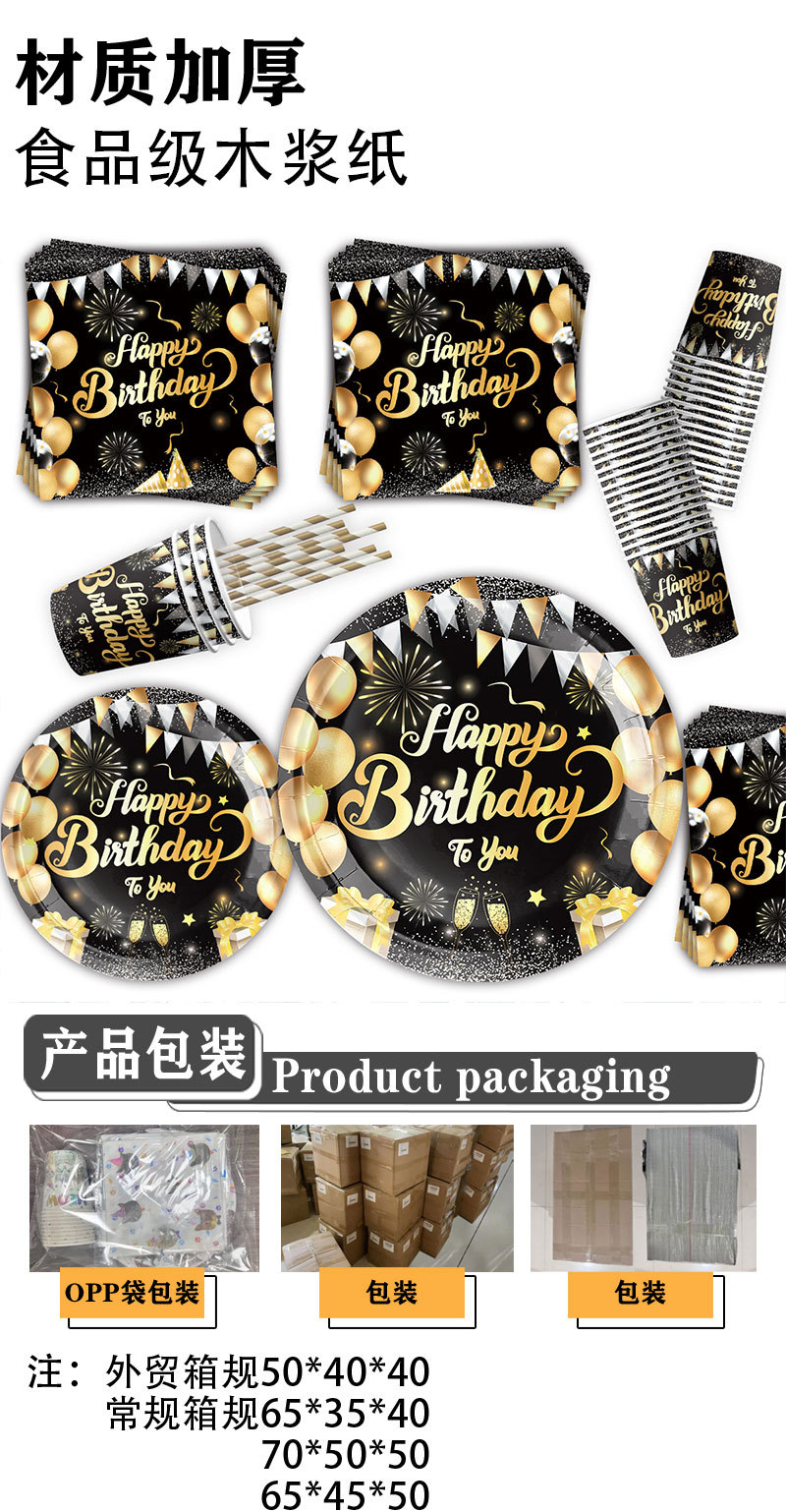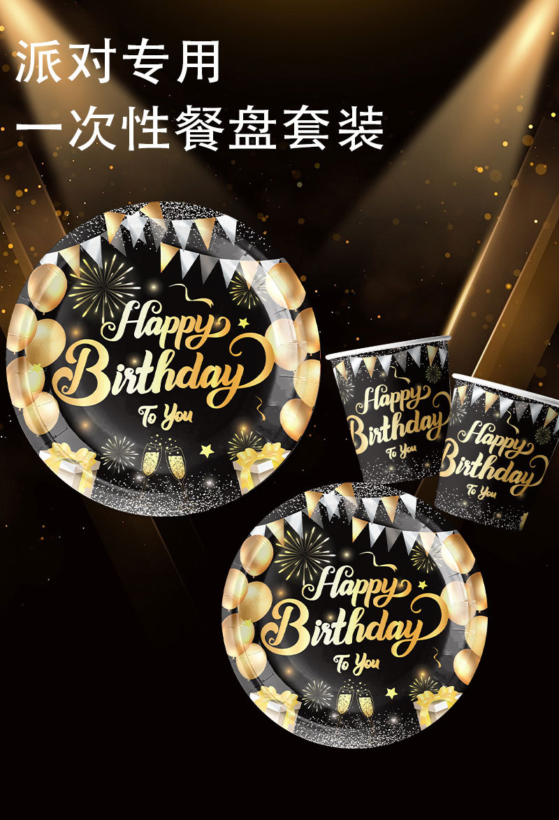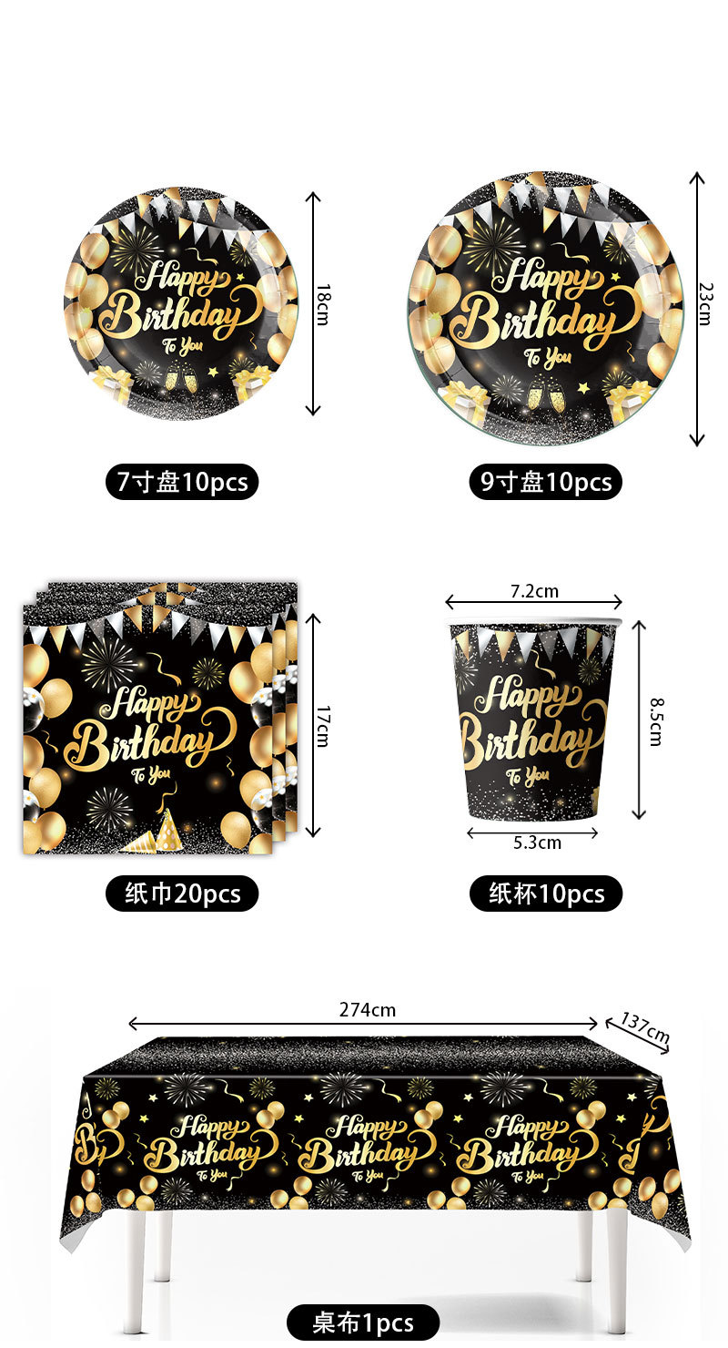Fiesta de cumpleaños de oro negro transfronterizo desechable feliz cumpleaños cartón de color tazas de papel mesa de postres diseño de decoración