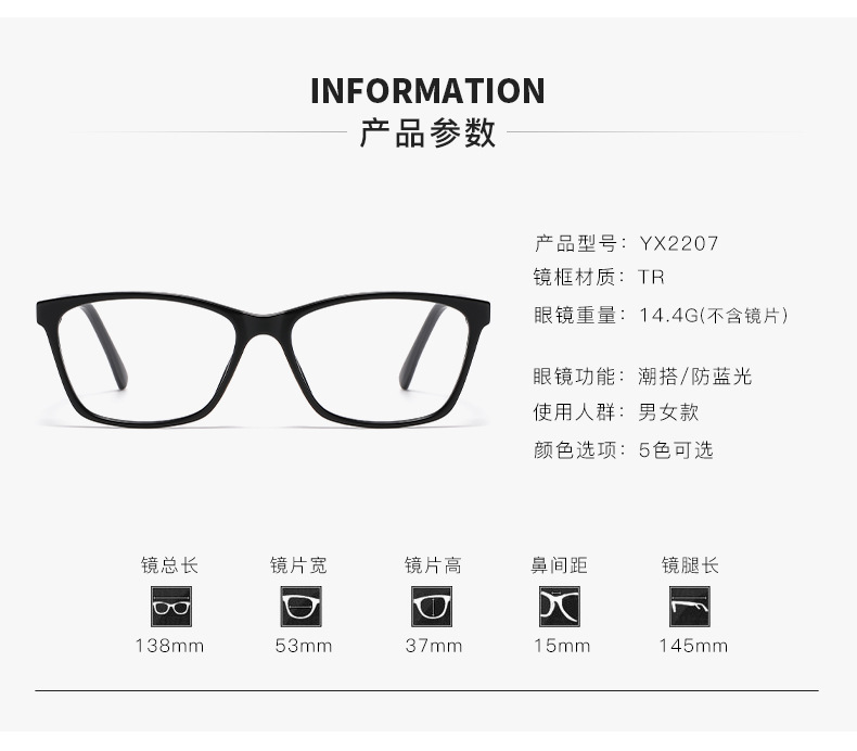 | Grado | Blanco plano, anti-luz azul sin grados, anti-luz azul + 100, anti-luz azul + 150, anti-luz azul + 200, anti-luz azul + 250, anti-luz azul + 300, anti-luz azul + 350, anti-luz azul + 400 |