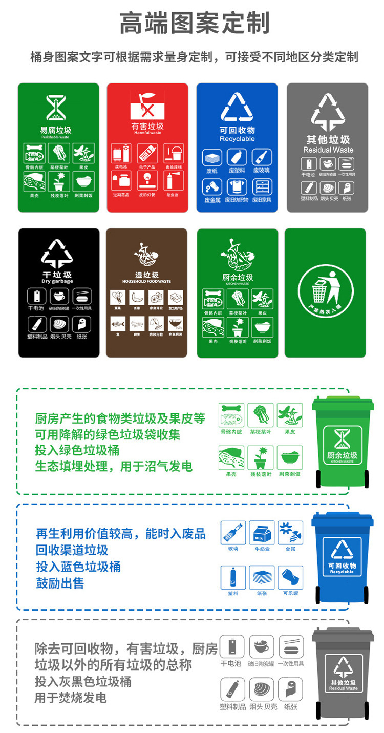 | Colores | Verde (logotipo de círculo regular),Azul (logotipo de círculo regular),Rojo (logotipo de círculo regular),Gris (logotipo de círculo regular),Verde (identificación de residuos de cocina/residuos perecederos),Azul (identificación reciclable),Rojo (identificación de basura peligrosa),Gris (otra identificación de basura) |