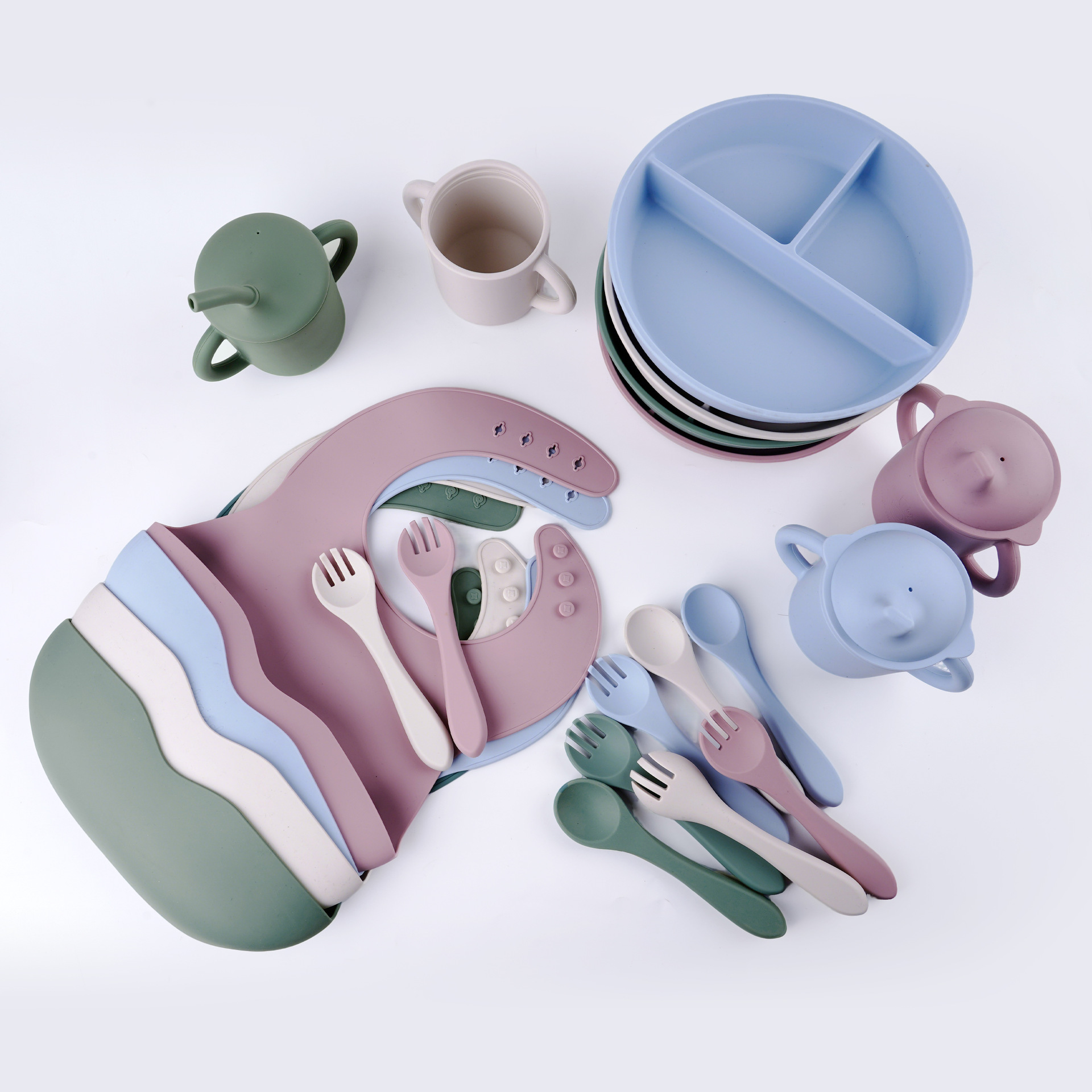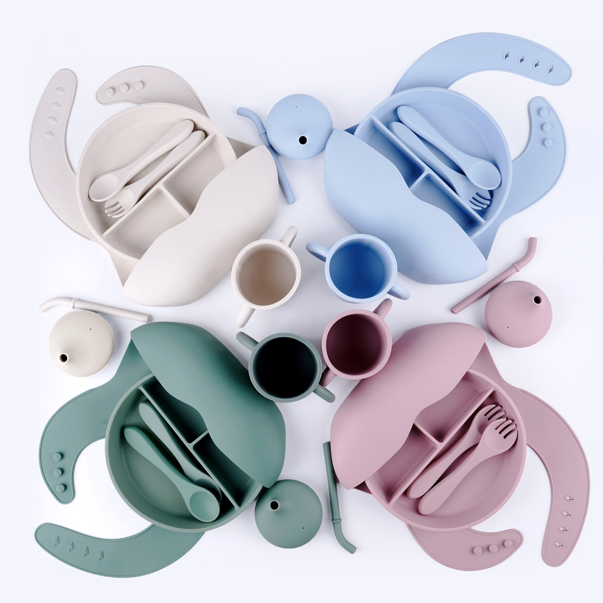 Set de cubiertos de silicona para bebés 5 piezas set de platos de comedor de tres cuadrados Bajazo de paja taza de agua silicona tenedor cuchara 5 piezas set de alimentos suplementarios