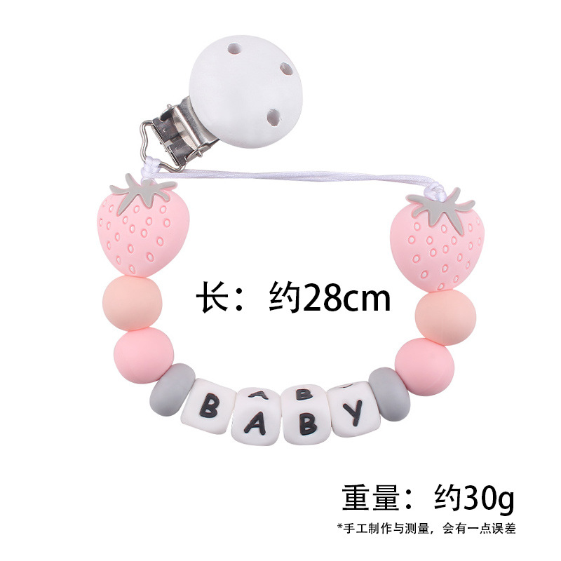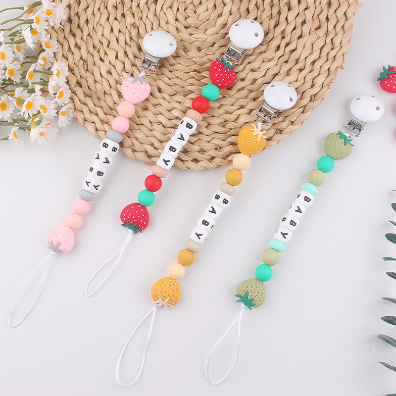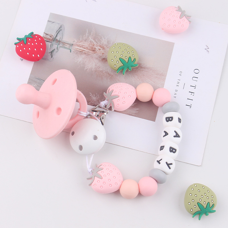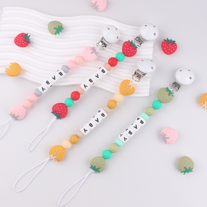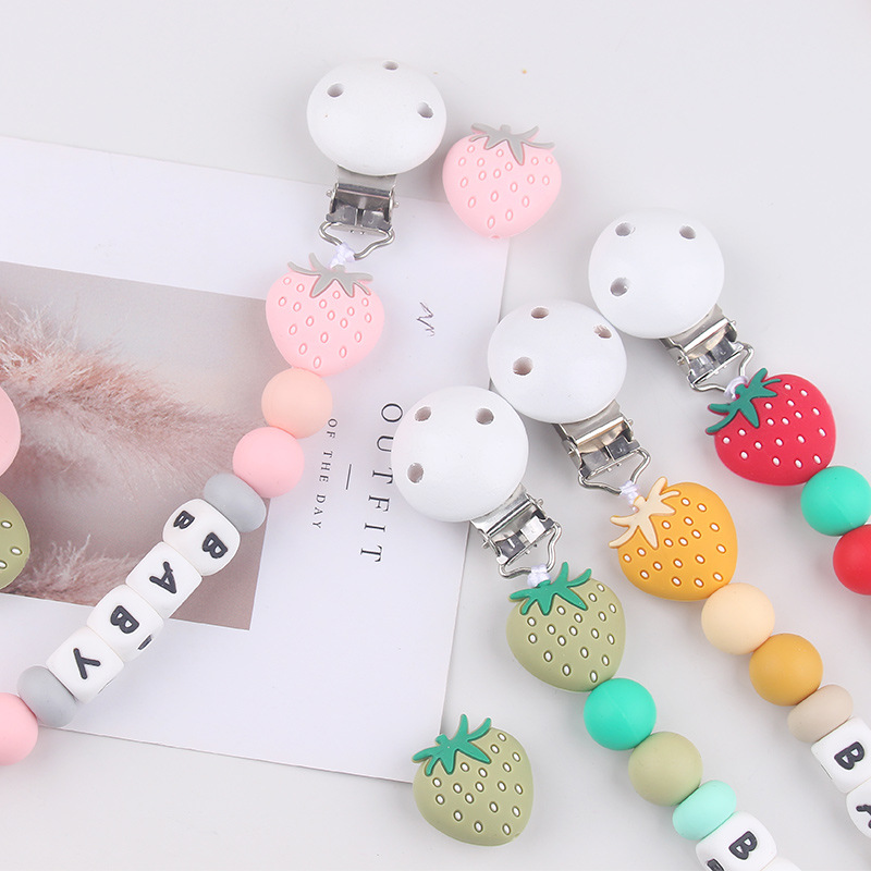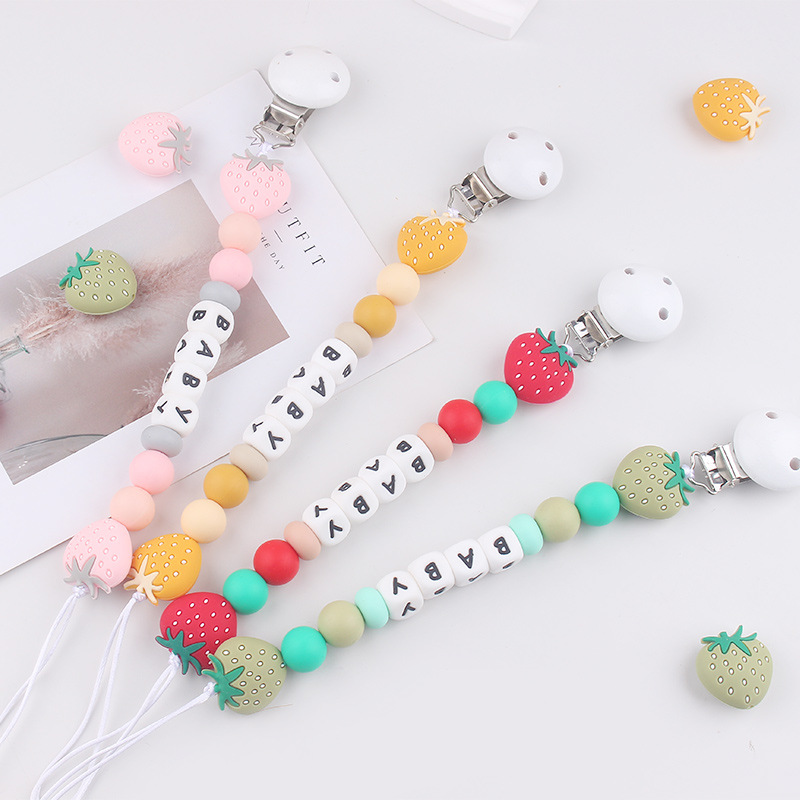 Nuevos productos para bebés Clip de chupete redondo de madera para calmar la cadena de chupete de silicona de fresa de dibujos animados para bebés