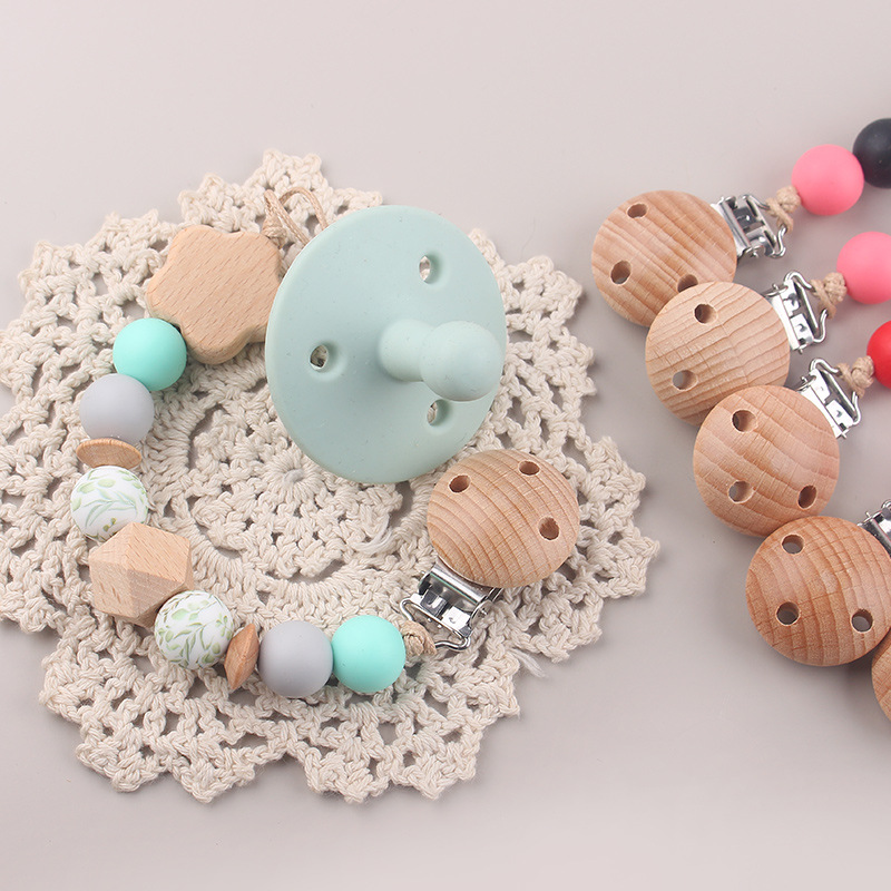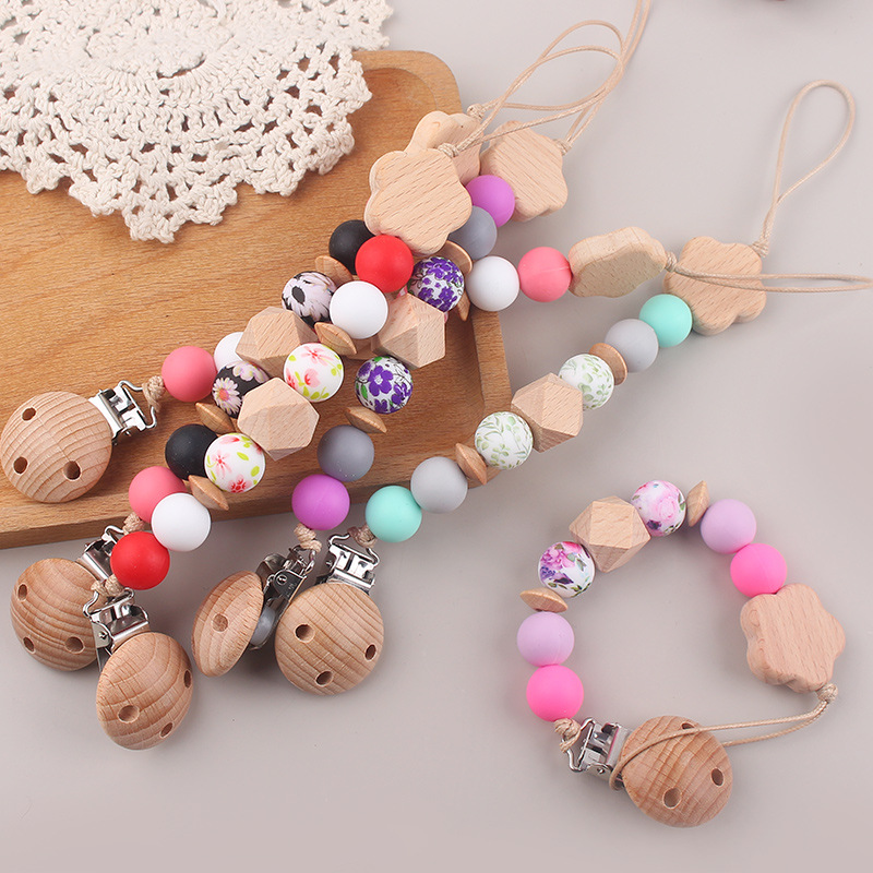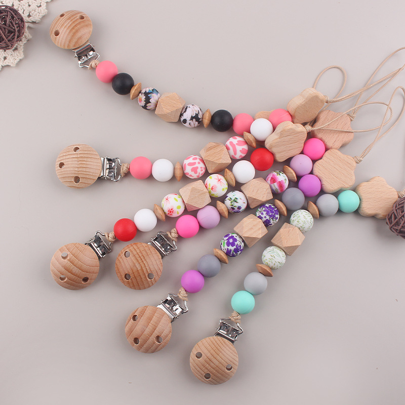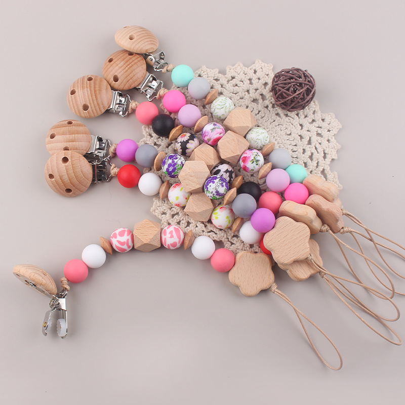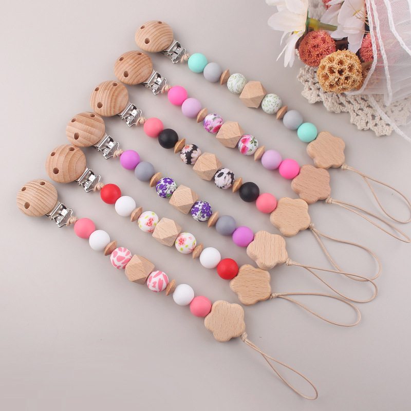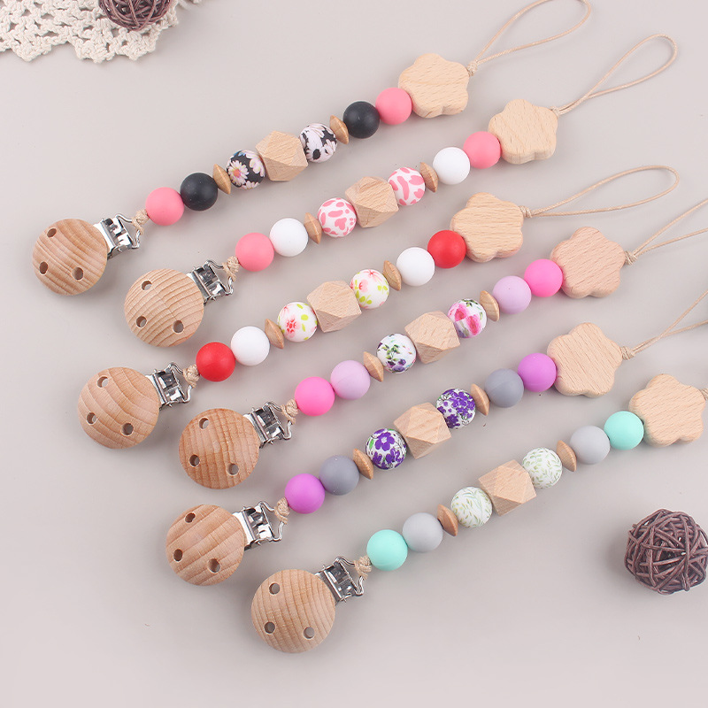 Nueva cadena de chupete de flor de haya de cuentas de silicona de transferencia de agua para bebés cadena de chupete de silicona de haya calmante cadena anti-caída