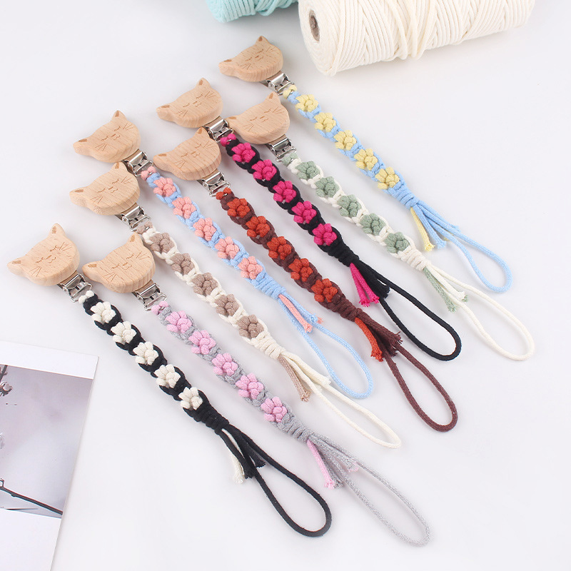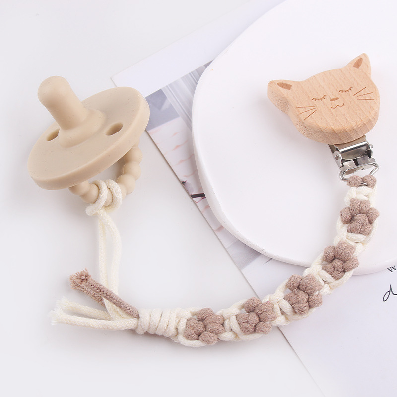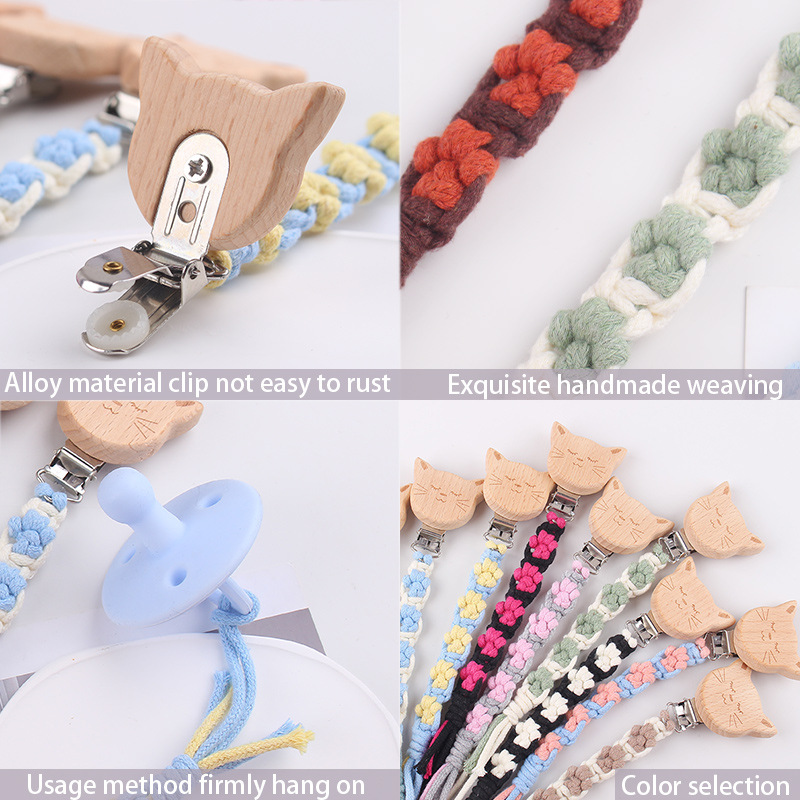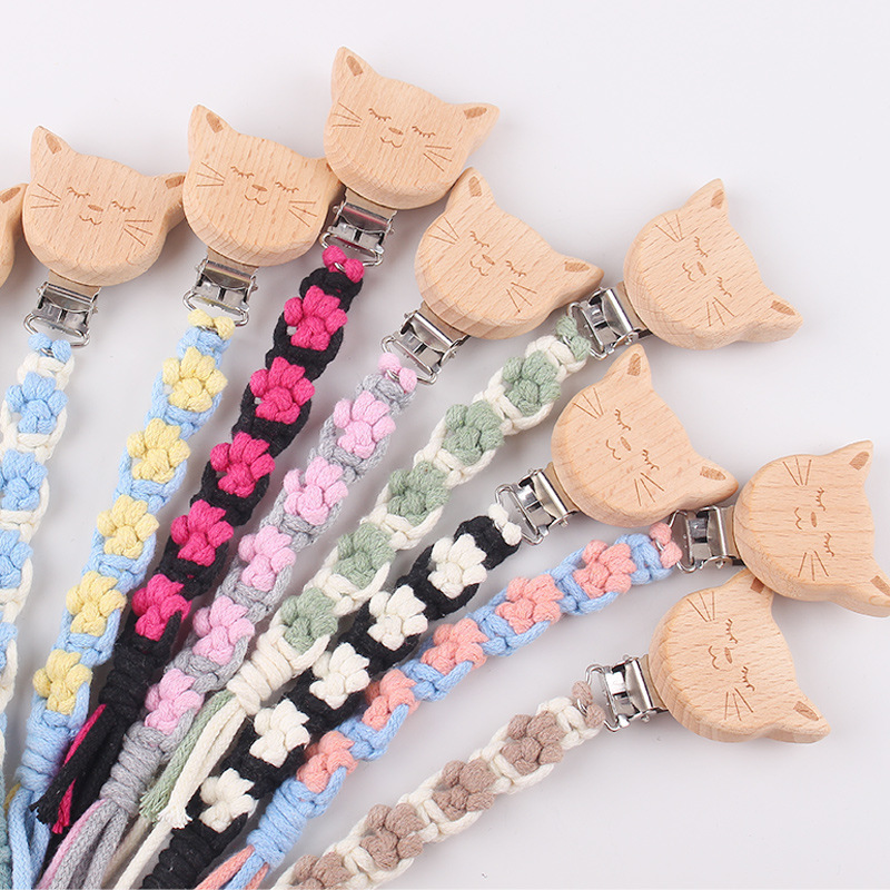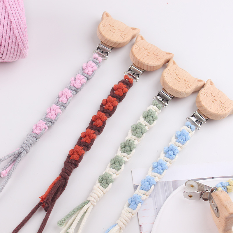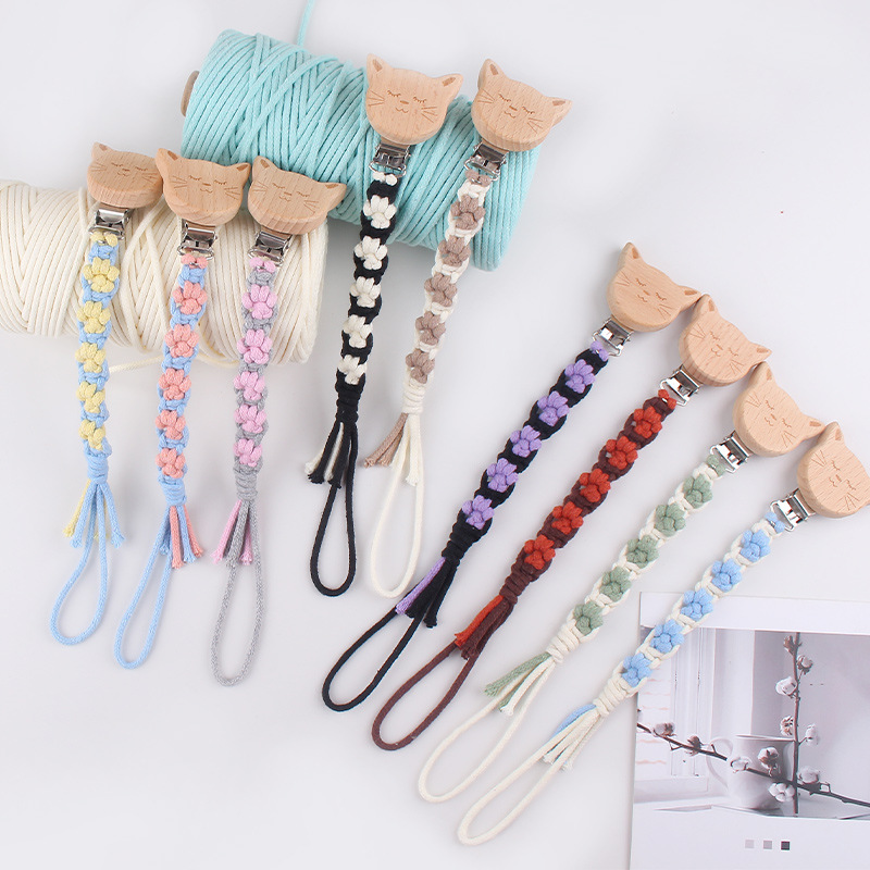 Nuevo clip de chupete de madera de haya de animal de dibujos animados creativo tejido a mano pata de perro textura chupete de algodón cadena anti-caída