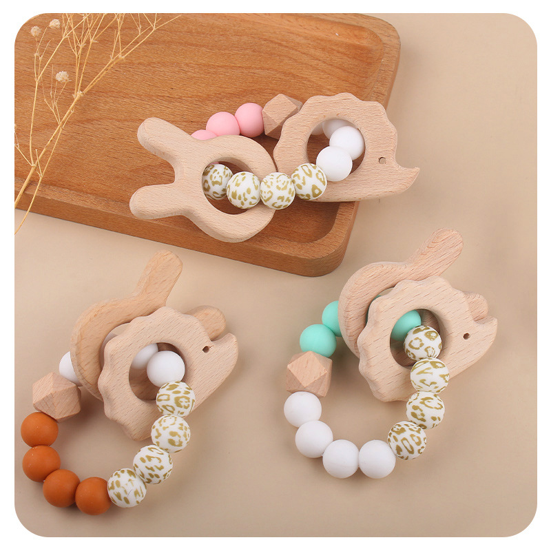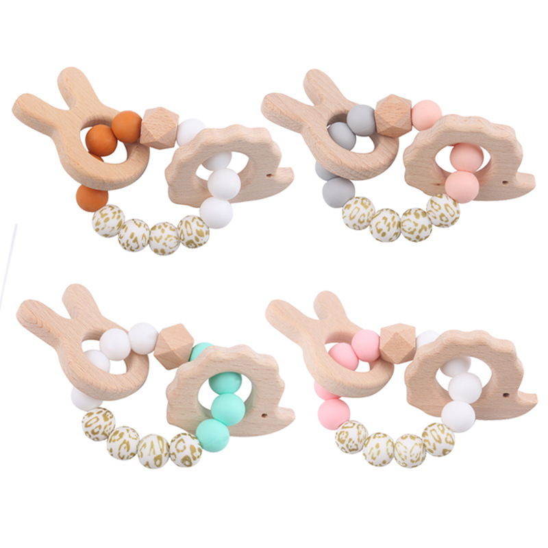 Nuevo bebé conejo bordado pulsera de goma de madera DIY bebé perlas de silicona juguetes de mordida de dientes varilla de molienda