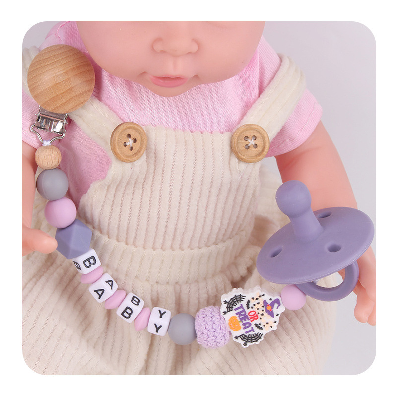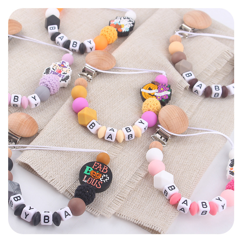 Productos para bebés, juguetes de planeta creativo, pinza de chupete de madera, cadena de chupete de silicona para bebés, cadena anti-caída