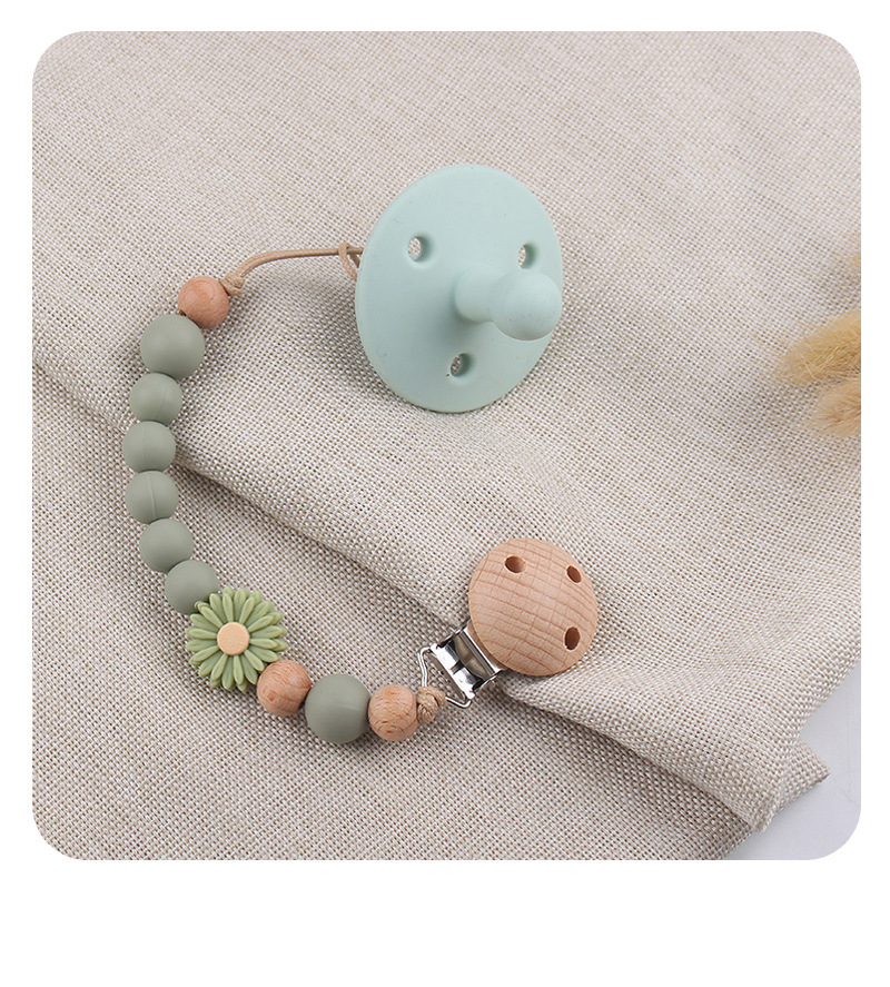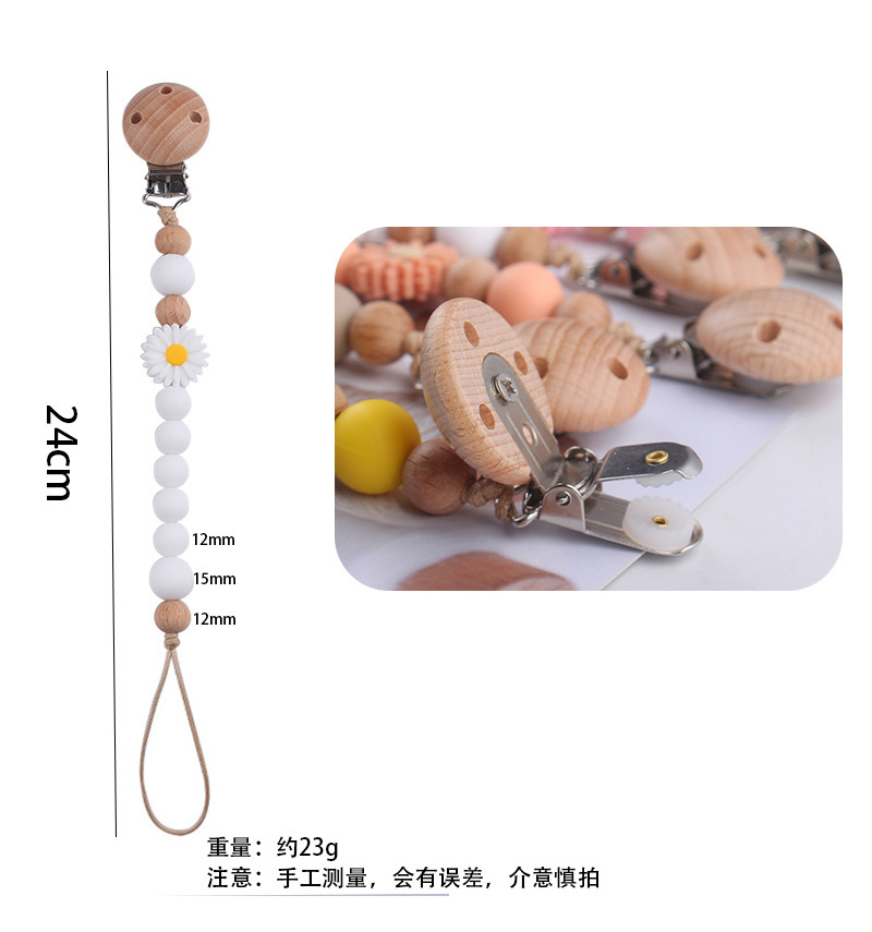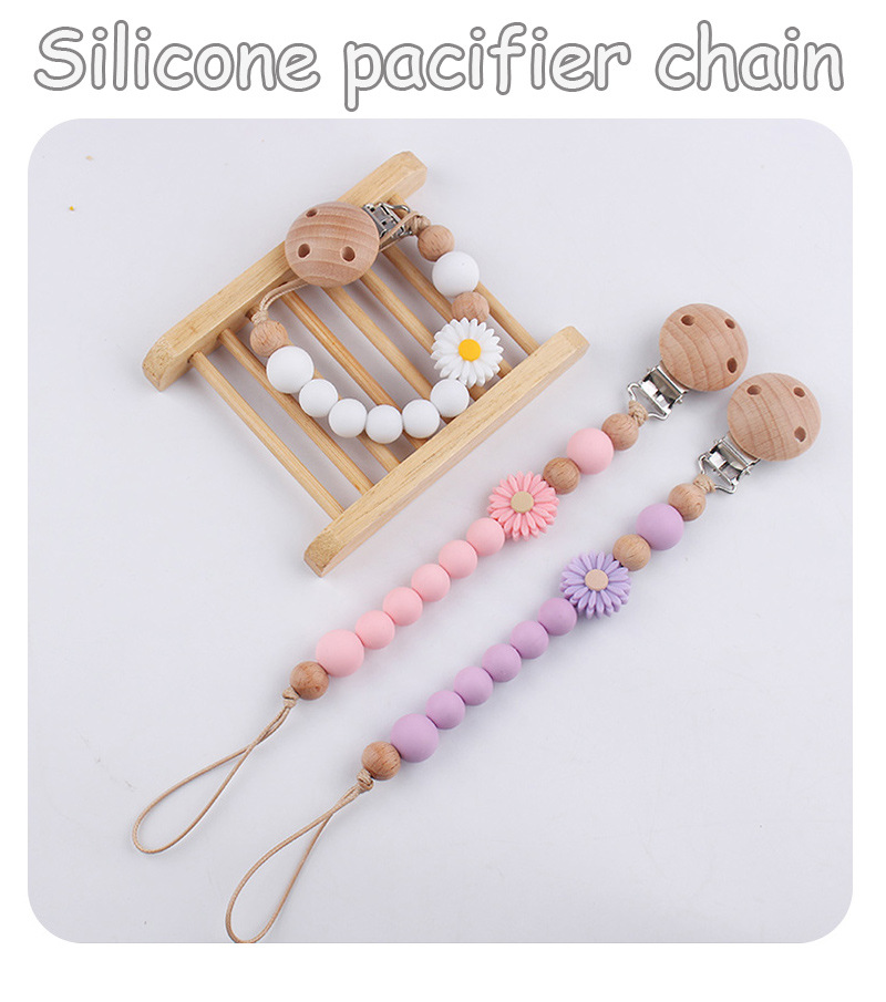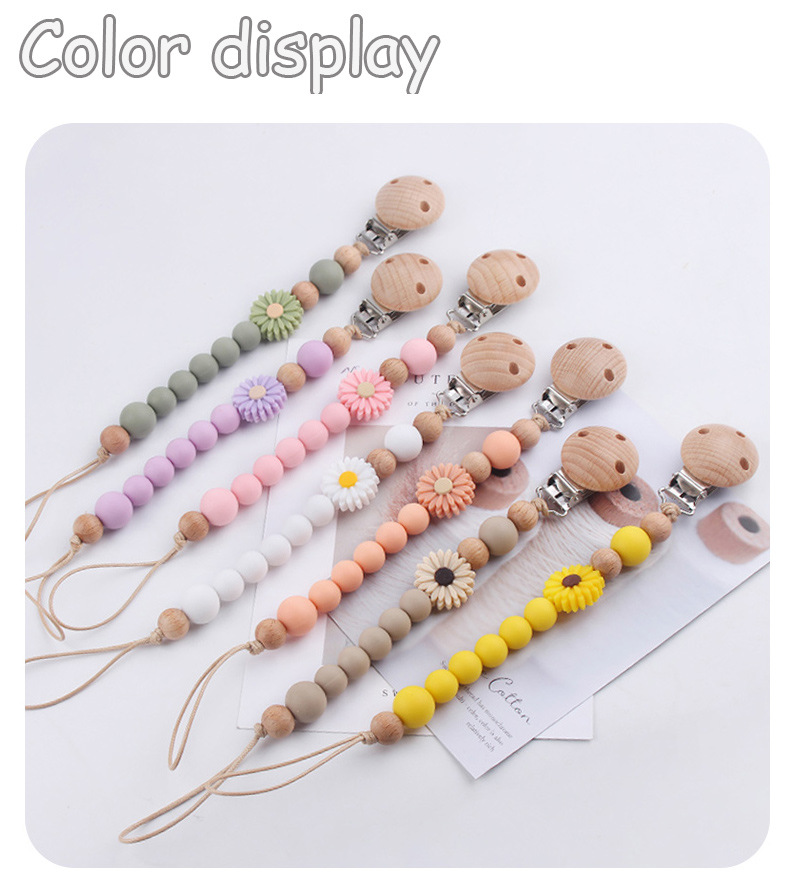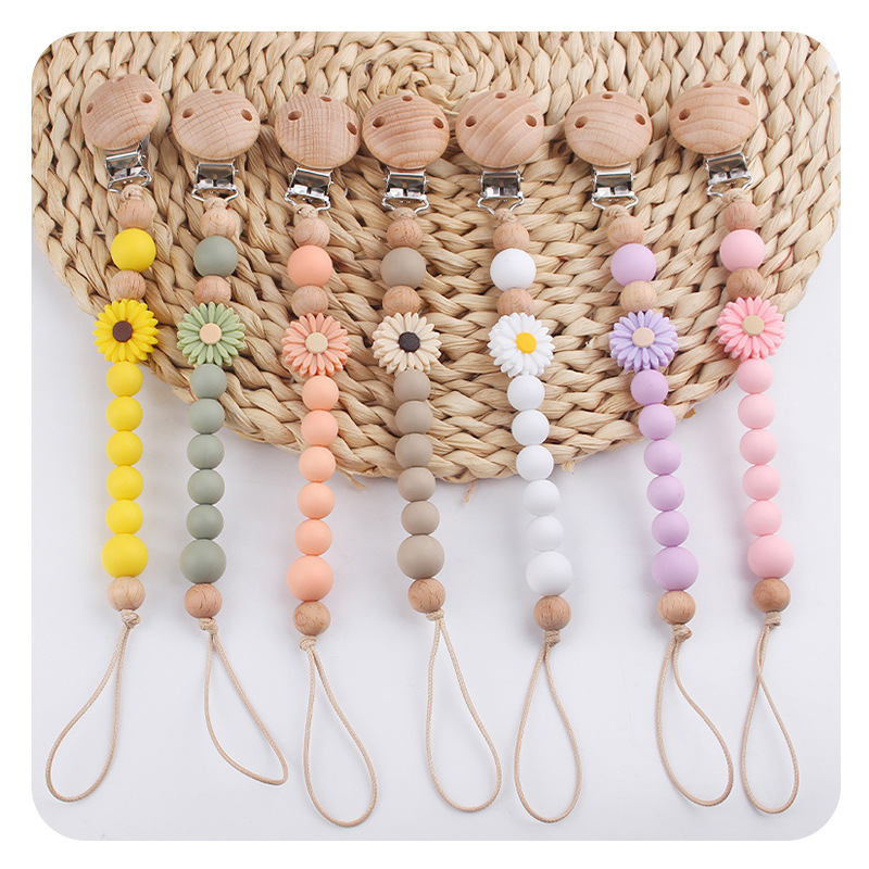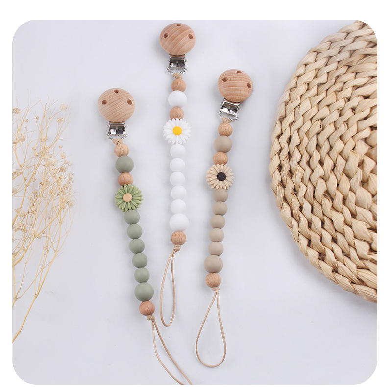 Productos para bebés de madera de haya cadena de tetas de silicona de dibujos animados margarita cuentas para calmar bebés cadena de tetas anti-caída cadena
