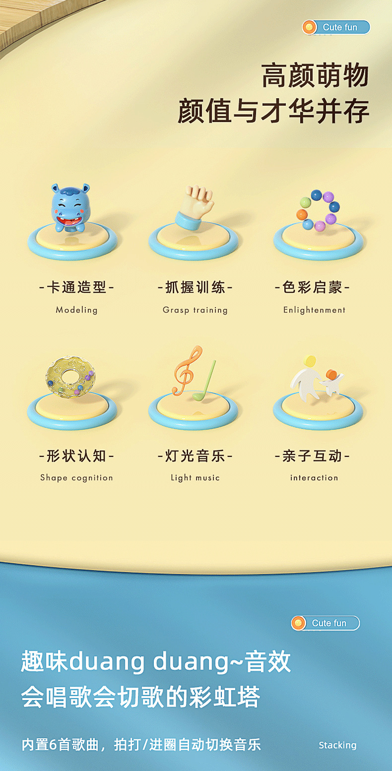 | Entrenamiento de la capacidad | Emoción,Visión,Desarrollo intelectual,Crawling,Manos a la mente,Pinzamiento,Sensorial,Coordinación mano-ojo,Entrenamiento de otras capacidades,Juguetes interactivos,Audiencia,Comunicación padre-hijo,Cultivo de interés |
