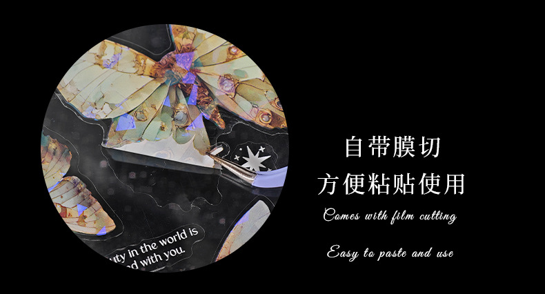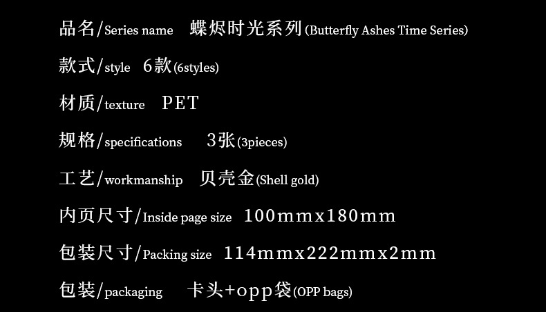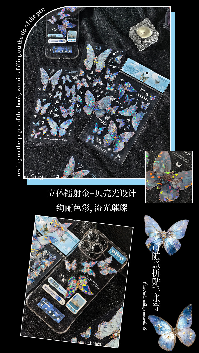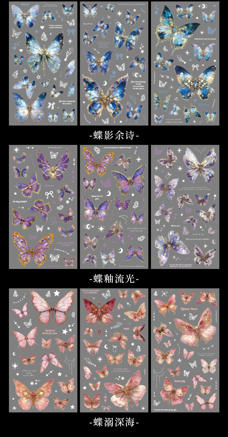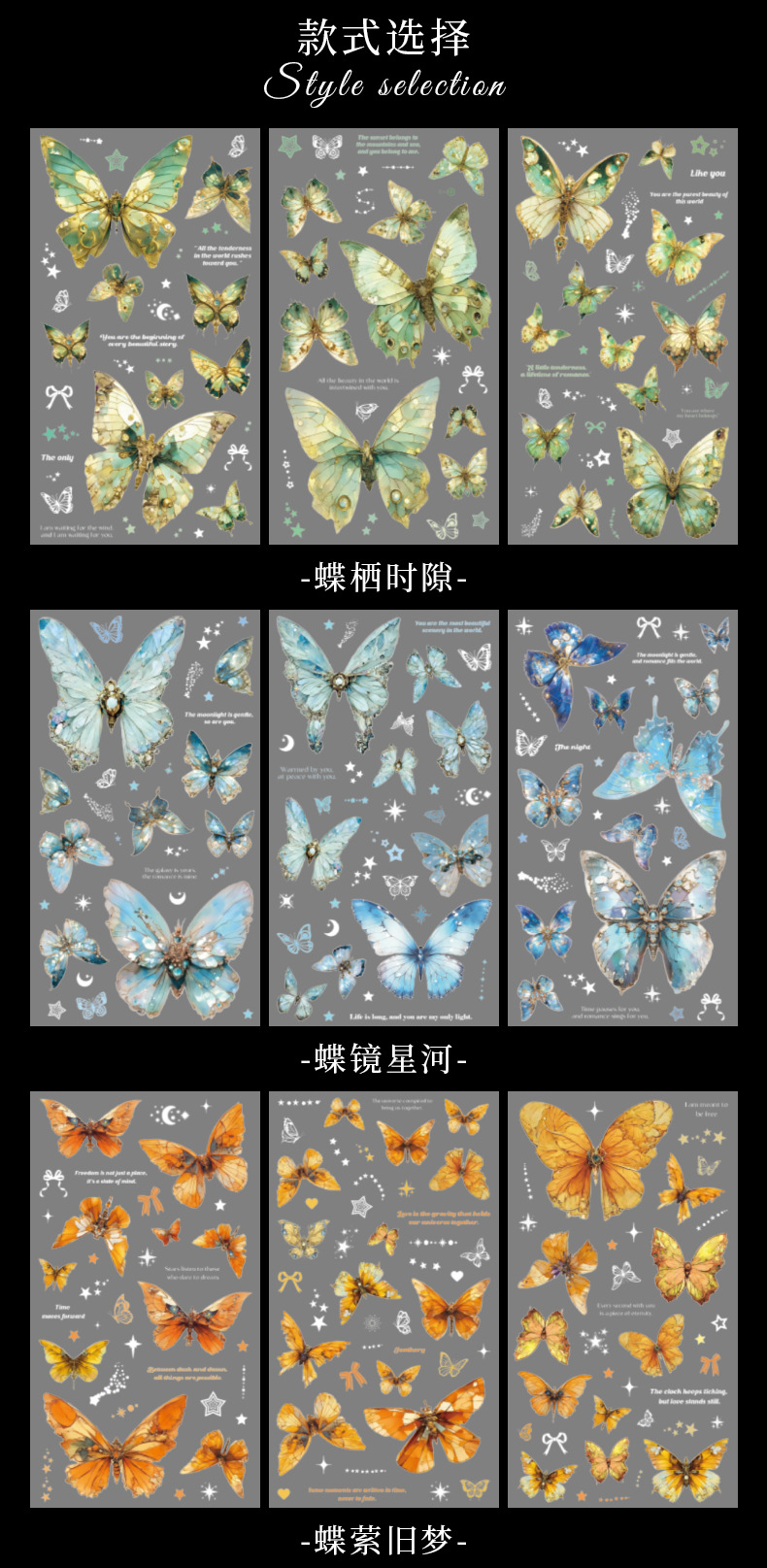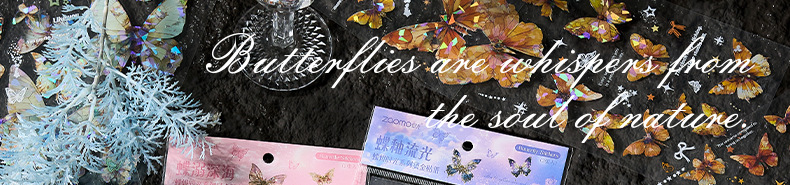 | Color | Mariposa ahogada en el océano profundo, mariposa nostálgica viejos sueños, mariposa en la brecha de tiempo, mariposa sombra de poesía, mariposa espejo estrella río, mariposa esmalte fluir luz |