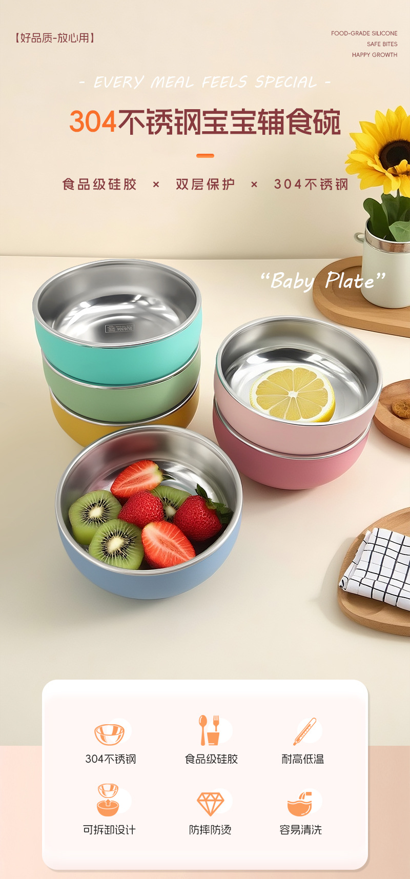 Amazon niños de acero inoxidable silicona cuenco con desmontaje de grado alimenticio 304 deslizante cuenco de alimentación aislamiento deslizante para niños