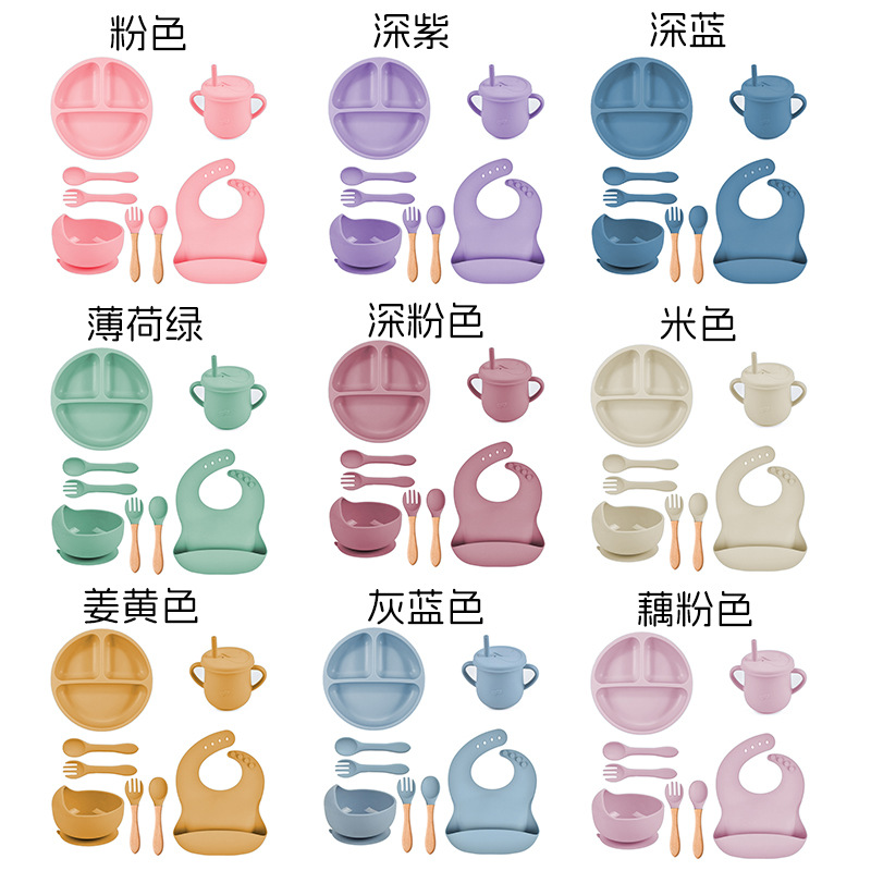 Conjunto de cubiertos de silicona de 8 piezas pequeños platos de succión copas de paja de silicona cuenco delantal cuchara horquilla plato de bebé al por mayor
