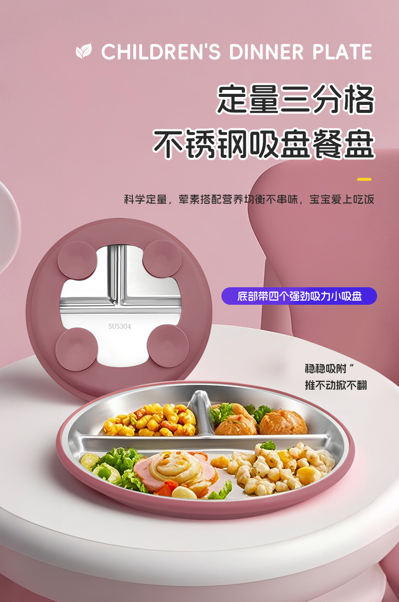 Bandeja de comedor de acero inoxidable 304 para niños Juego de cinco piezas Ventosa inferior Tipo de rejilla dividida Vajilla para niños Placa de rejilla cuantitativa para estudiantes
