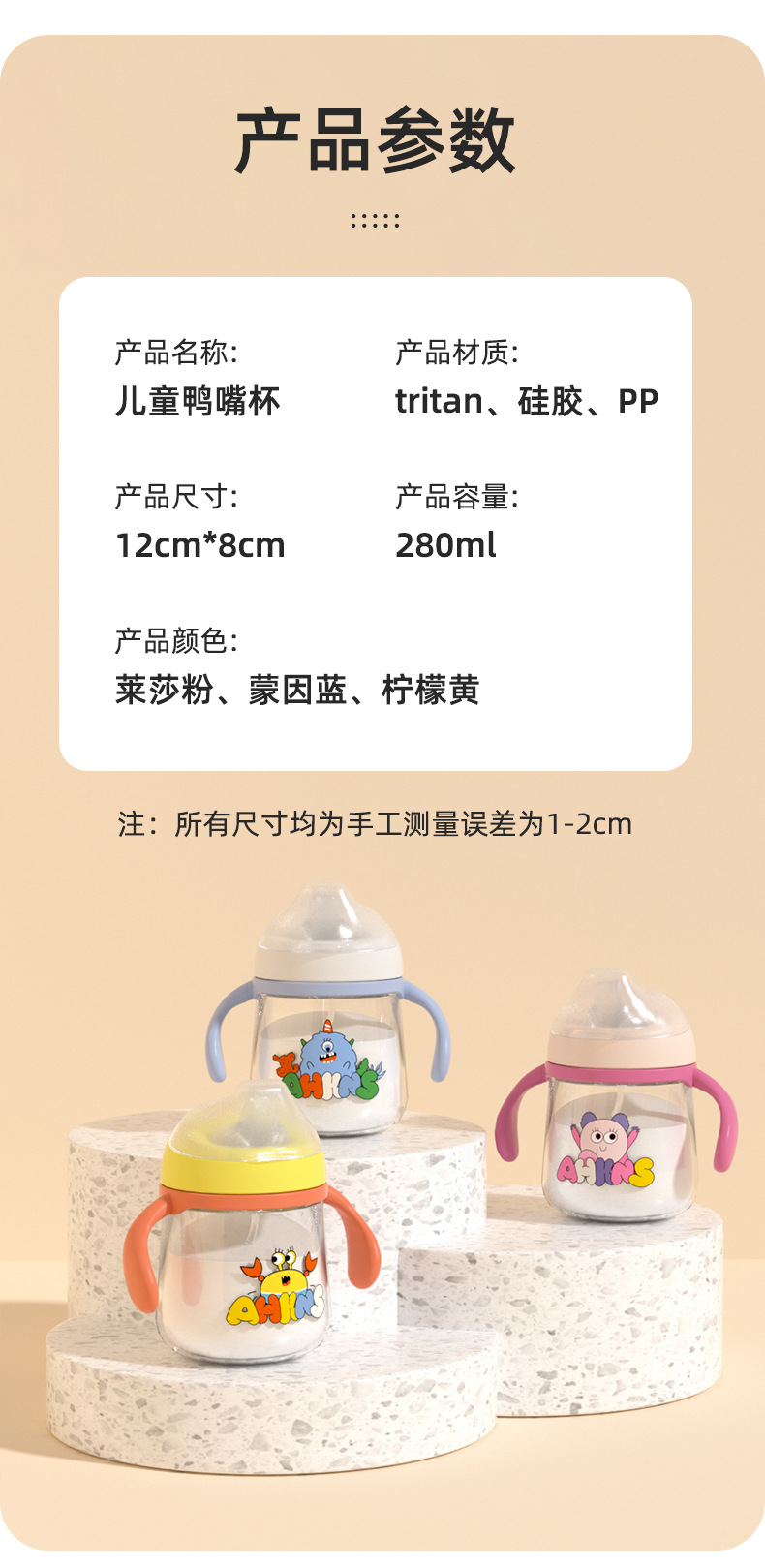 | Colores | Taza de pico de pato azul claro,Taza de pico de pato rojo rosa,Taza de pico de pato rojo anaranjado,Taza de pico azul claro,Taza de pico rojo rosa,Taza de pico rojo anaranjado,Tapa de taza de pico de pato azul,Tapa de taza de pico de pato rojo,Tapa de la taza de pico de pato naranja |