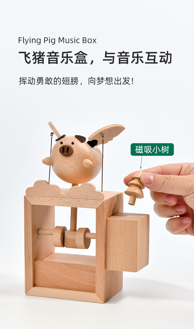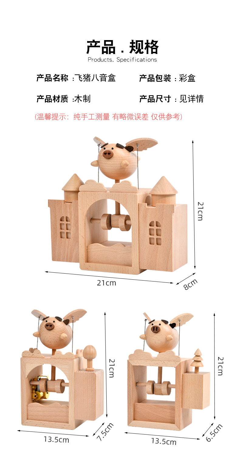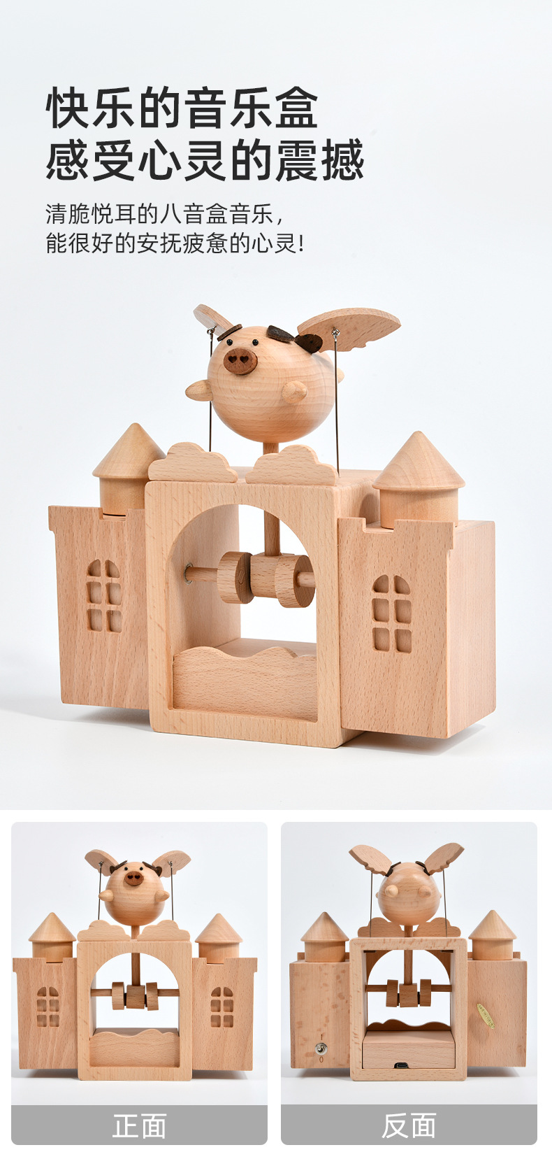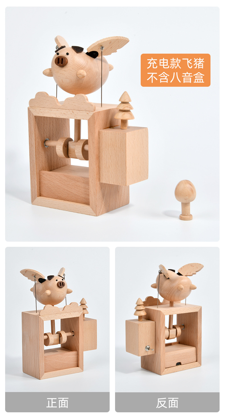 Venta directa de fábrica Mu Xiaofei Pig Adornos creativos para el hogar Regalos voladores Pig Artesanía de madera hecha a mano Caja de música