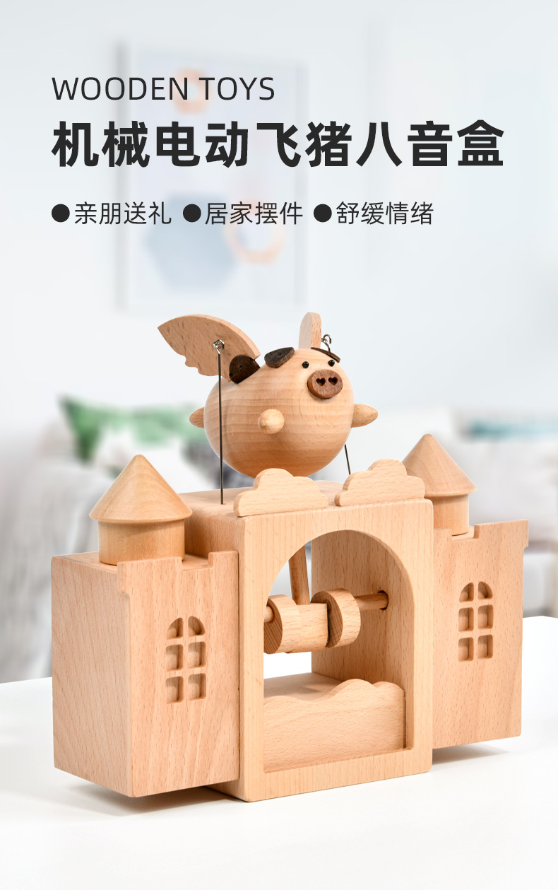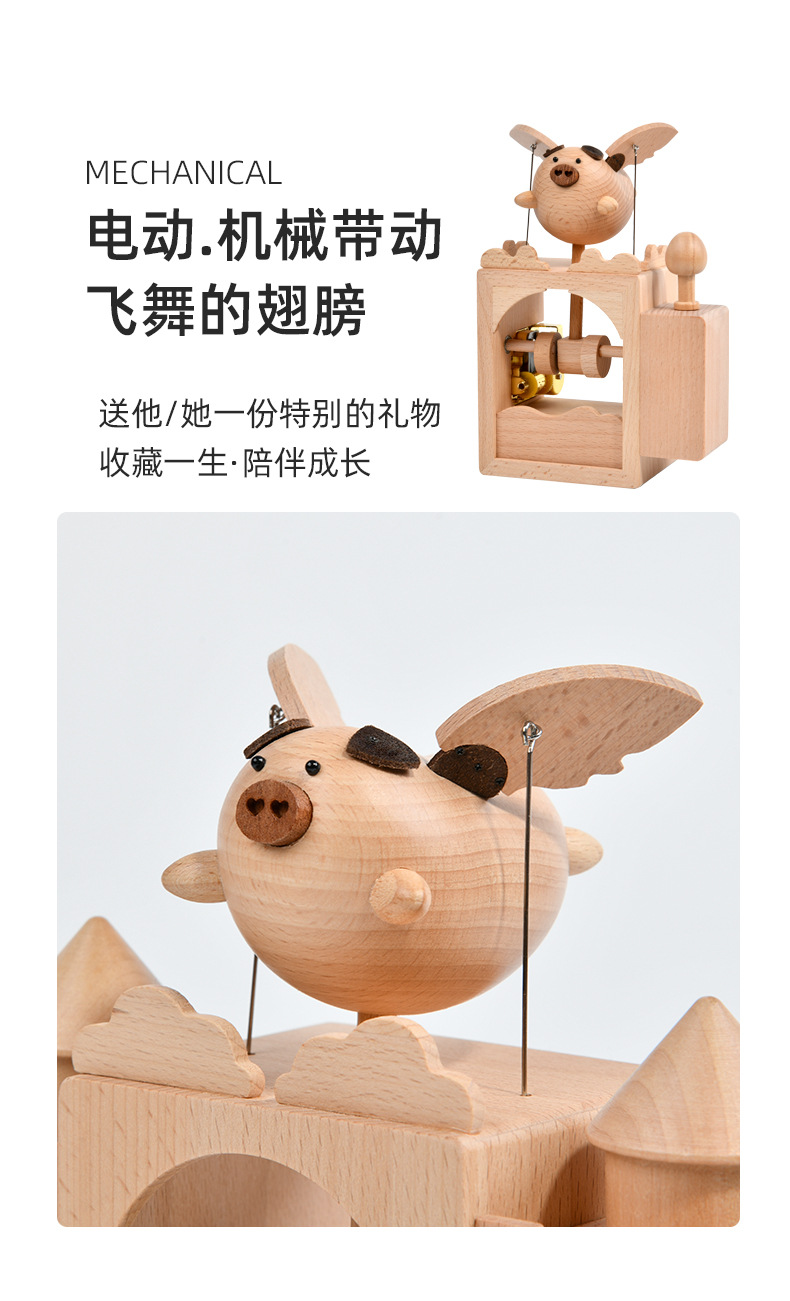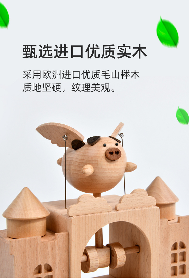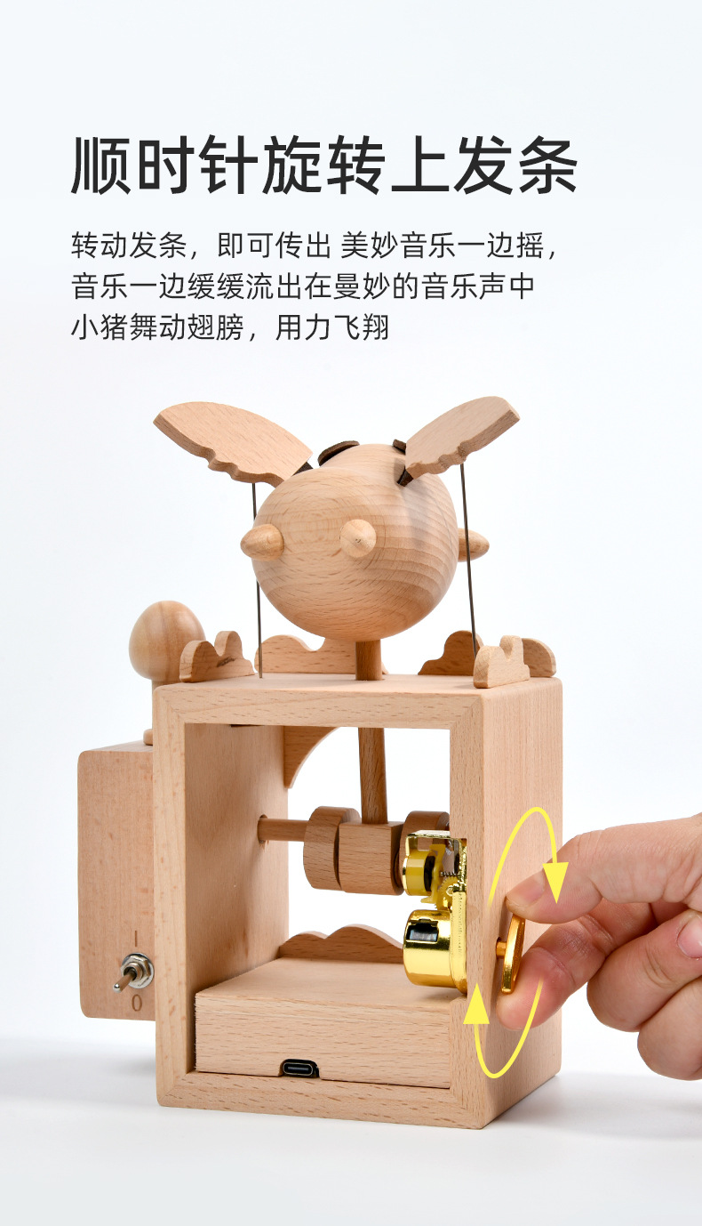 Venta directa de fábrica Mu Xiaofei Pig Adornos creativos para el hogar Regalos voladores Pig Artesanía de madera hecha a mano Caja de música