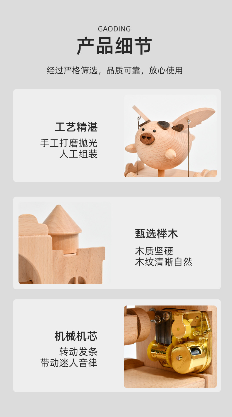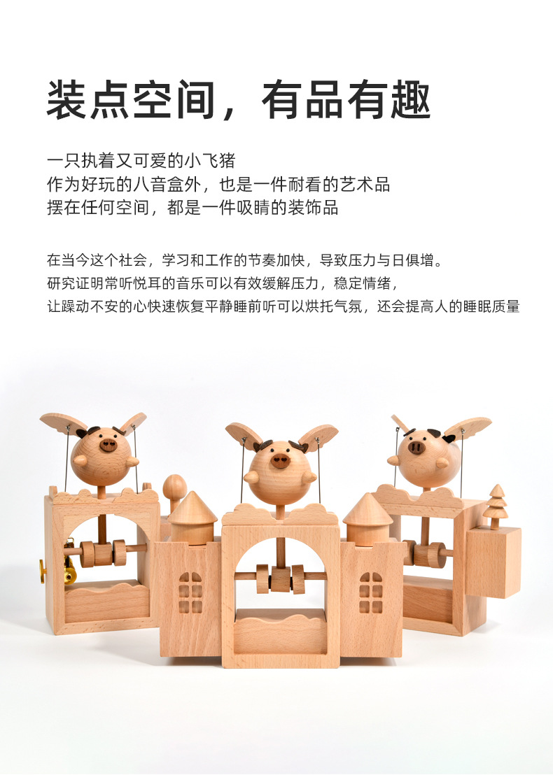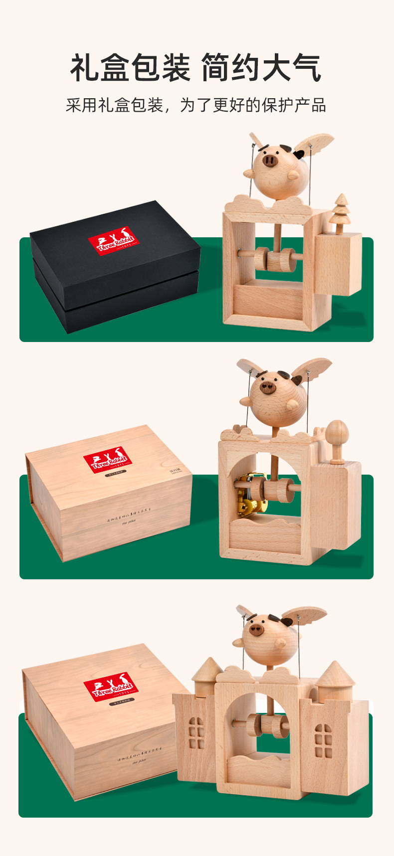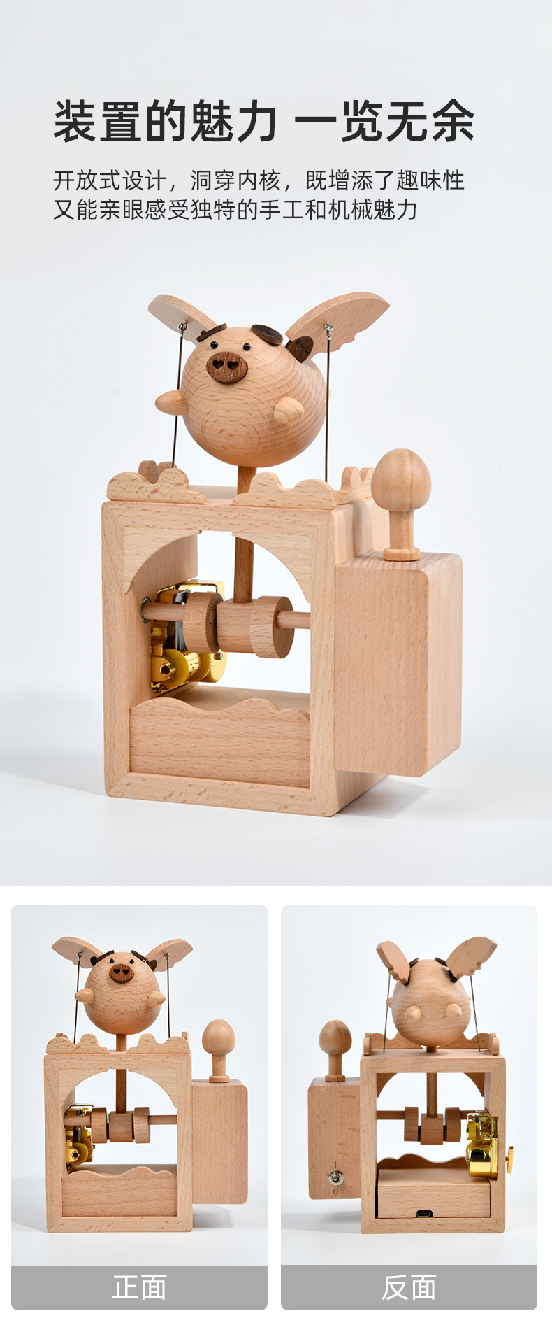Venta directa de fábrica Mu Xiaofei Pig Adornos creativos para el hogar Regalos voladores Pig Artesanía de madera hecha a mano Caja de música